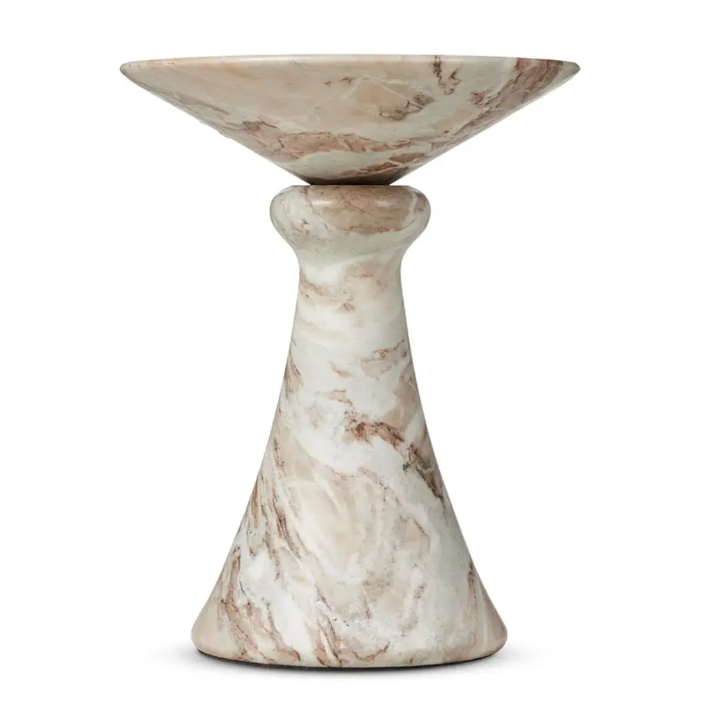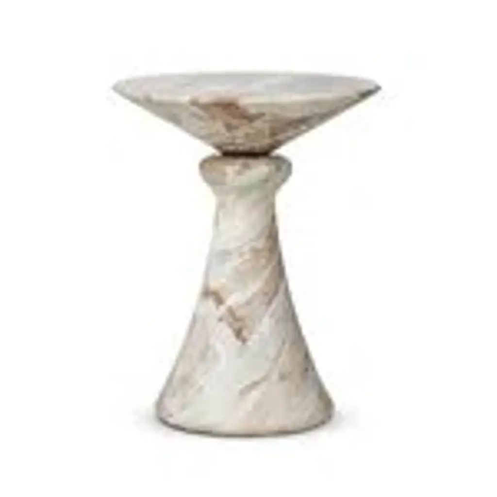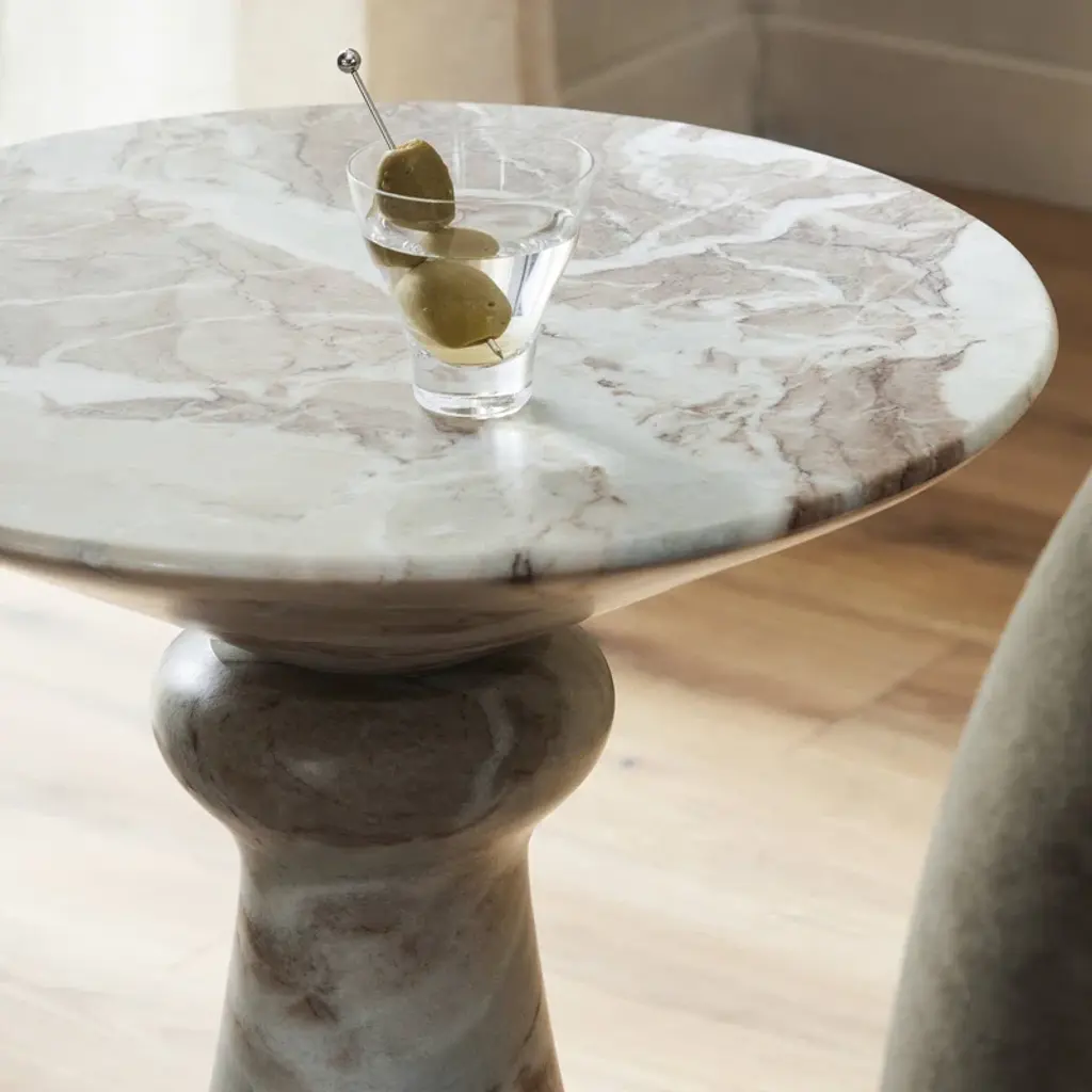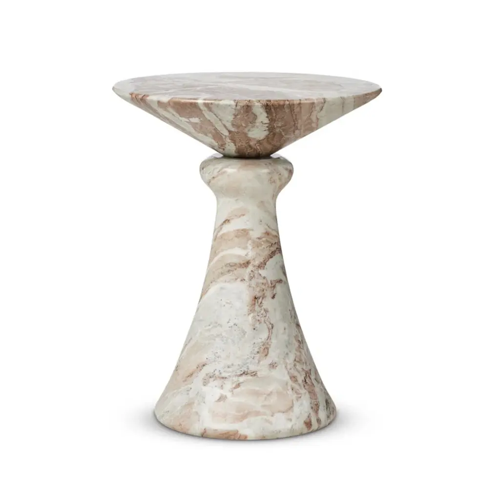 A sculptural end table of Sawar marble brings an extra surface to any space, while natural veining adds a look of beautiful movement.