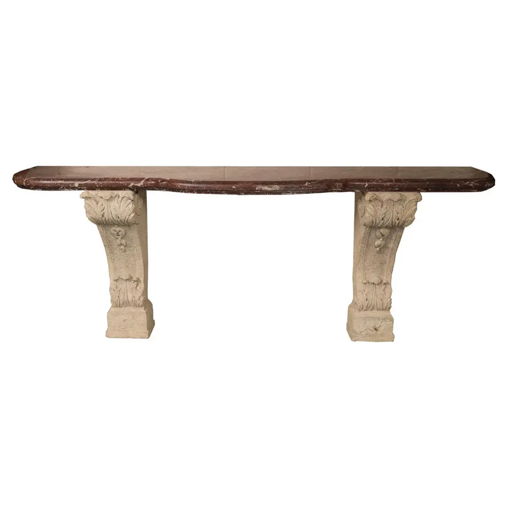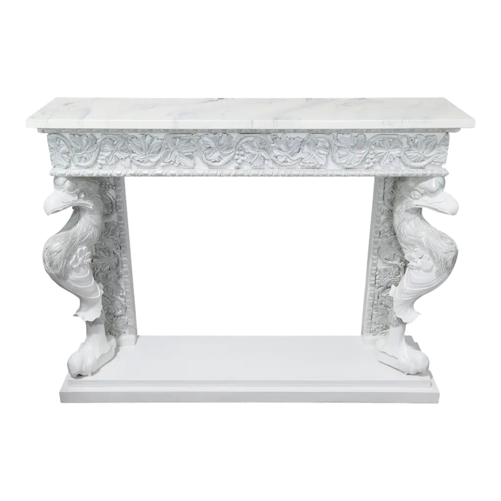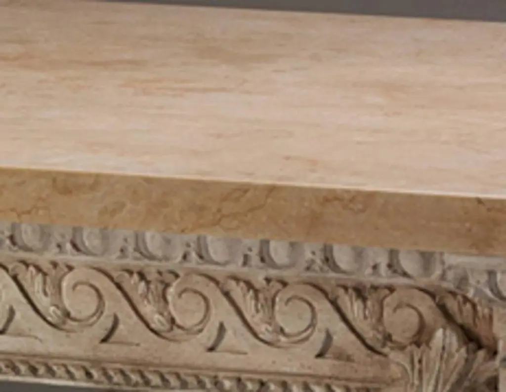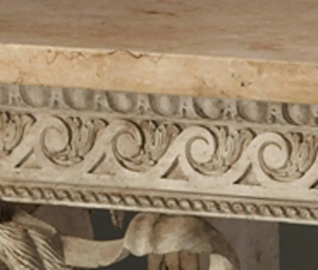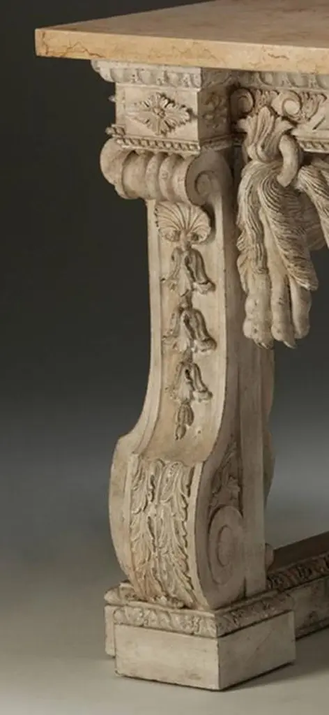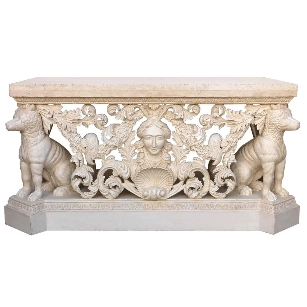 An important architectural side table after a design by Matthias Lock, the Hercules mask draped with the pelt of the Nemean lion hung through carved rings, with an architectural design carved and decorated framework, under a vitruvian scroll frieze and marble top.This item is made to order.We are currently working to a 30-36 week lead time.