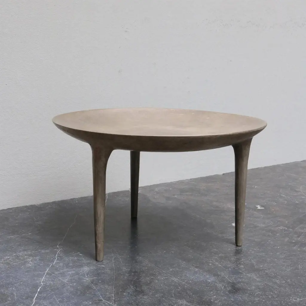 Contemporary bronze side table - low brazier by Rick Owens2007Dimensions: L 42 x W 42 x H 25 cmMaterials: bronzeWeight: 18.5 kgAvailable in black finish or nitrate (dark brown) finish.Rick Owens is a California-born fashion and furniture has developed a unique style that he describes as “luxe minimalism.”Though his designs are simple and spare, Owens thrives on theatricality - producing wildly original runway shows featuring gender-fluid models of all ages and shapes. Inspired by his longtime partner and muse, Michele Lamy, clothes and furniture alike feature dark grays, blacks and browns. Like his frontier forebears, Owens finds his strongest influences in nature - his furniture and housewares have simple, organic shapes, and a few items even feature his distinctly 21st century take on antlers.Made by hand, in France.