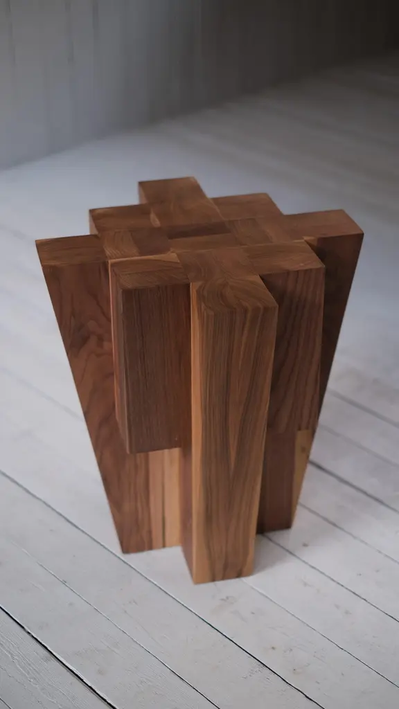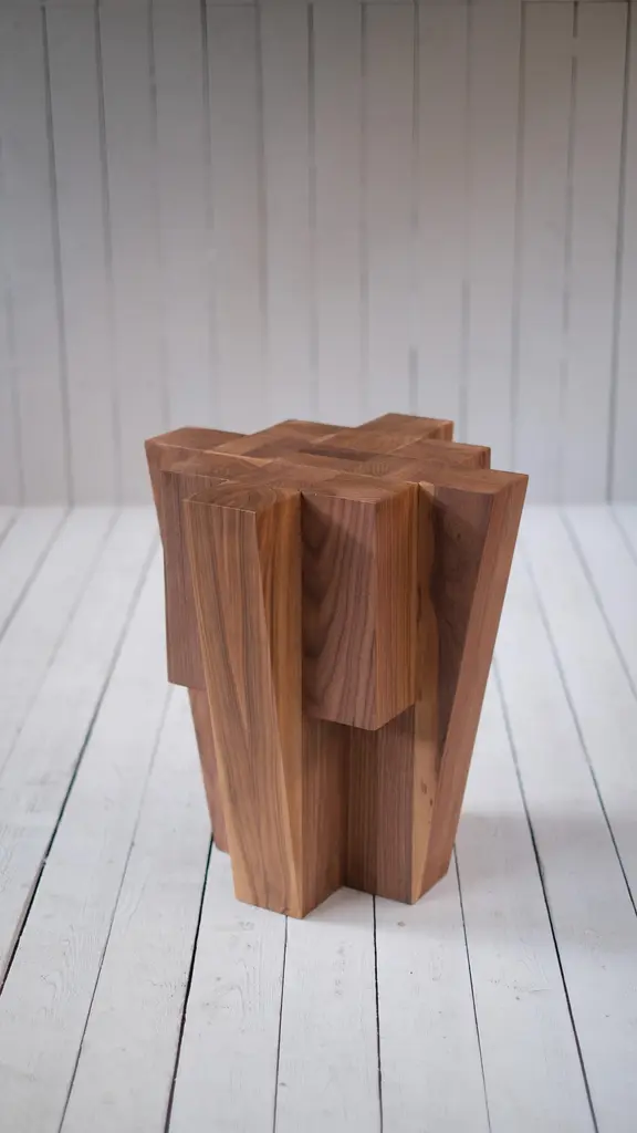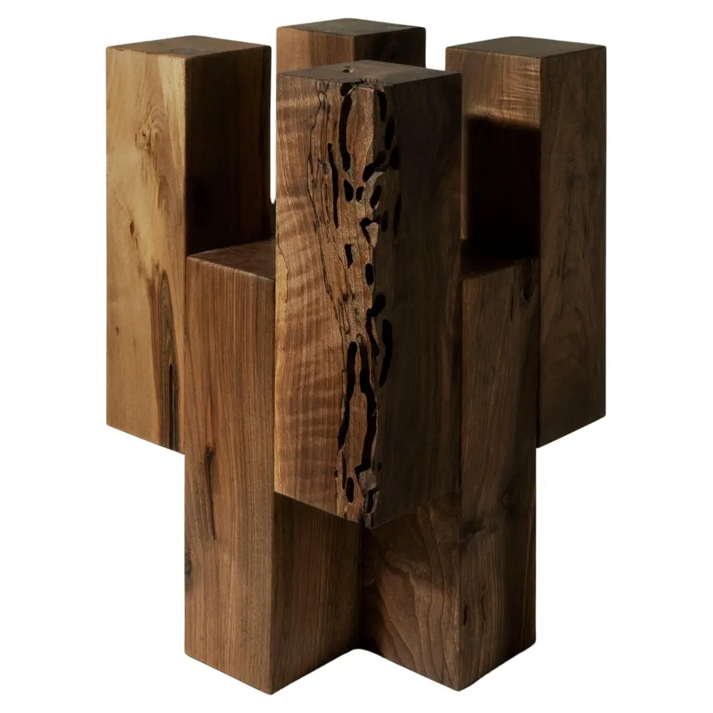 Bunker side table American walnut by Arno DeclercqMaterials: American walnut.Measures: 45 cm W x 45 cm D x 50 cm H.Made by handSigned by Arno DeclercqArno DeclercqBelgian designer and art dealer who makes bespoke objects with passion for design, atmosphere, history and craft. Arno grew up in a family with parents who like to work with beautiful brands and objects.His father studied at the Royal Academy of Arts Fashion Department, he worked for Bikkembergs and made his own fashion brands, but has also collected tribal arts for more than 20 years. His mother, who worked with his father from the beginning, bought a shoe store in 2010 where they sold brands as Rick Owens, Ann Demeulemeester, Maison Martin Margiela. With the interest in beauty he learned from his parents, Arno studied interior design, after learning a lot about materials and with great knowledge of history he designed interiors and opened his own gallery for ethnographic art and design.The collection has come to the idea that there are too few interiors where they no longer have the big and static vases and candlesticks that the people had in big houses over 100 years ago. By focusing on architecture, ancient arts and design, after war buildings, defense buildings (bunkers and fortresses) and tribal arts, he created a collection that became a Classic.Each piece is unique because it is entirely handcrafted by him. Made of tropical hardwood called Iroko this he discovered after one of his many trips to West Africa interested in voodoo arts.In these strange tribal arts, the wood "Iroko" is used in many objects, according to their culture, the ancestors lives in these trees, and they also call this tree "the king of the forest".Arno also combines this with Belgian oak that dried for more than 30 years, wood that was provided for the many furniture makers in Mechelen.By treating these objects through the Yakusugi technique or another mentioned "Shou Sugi Ban" an ancient Japanese technique where the objects are burned to protect the wood from weathering and subsequently fixed to get a patina look as long as possible. This gives each object a unique texture.