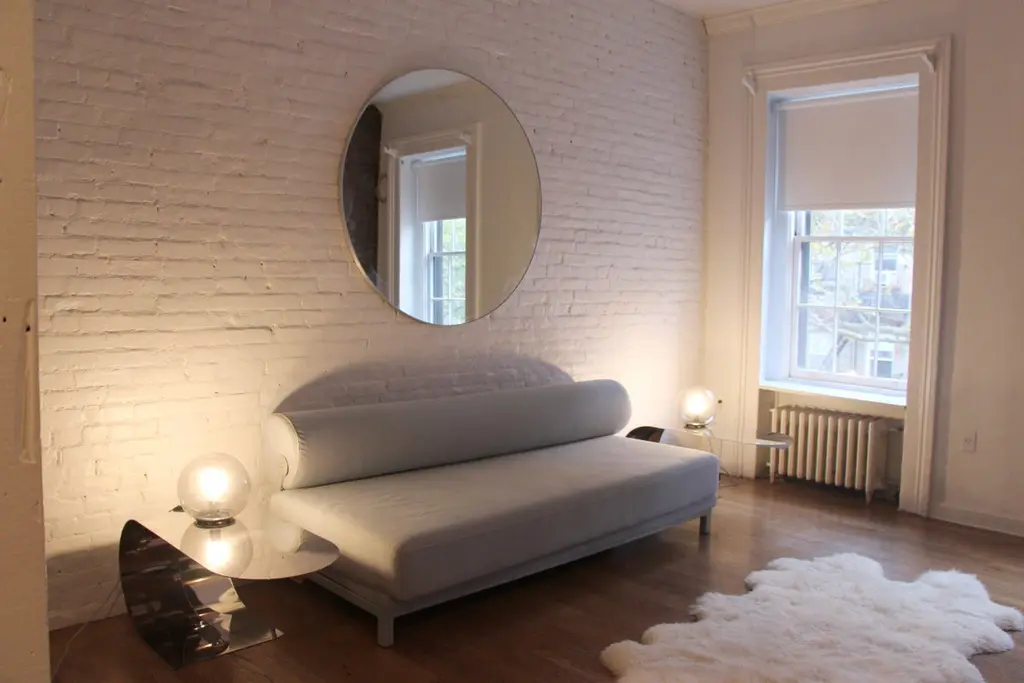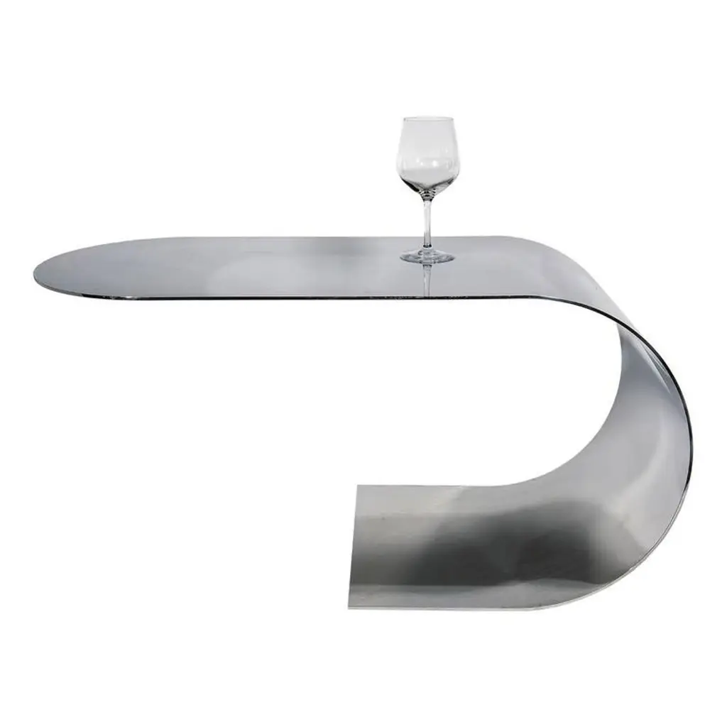 This eco-friendly extended c-shaped side table with cantilevering top is made of 3/16” recycled polished stainless steel or brass. Its top projecting surface, at sofa height, seems to cantilever out as if it were held down by screws. Because the table's organic curved form is metal, its reflective surfaces amplify light. The polished version of the sofa table creates a clear mirror-image of its surroundings, doubling the surrounding space. Cantilever Table is inspired by the duality of solidity and fluidity. Shaped like an ocean wave, the table abstracts and liquifies light reflections in its curve. Its reflective flat top surface may be placed to mirror specific views or interior design features such as candles. This sustainable end table's soft lines are classic and minimalist in style. Its versatility suits a wide range of interiors. The table also effectively amplifies light in a space.This versatile table is also available in 5/8” transparent recycled acrylic.