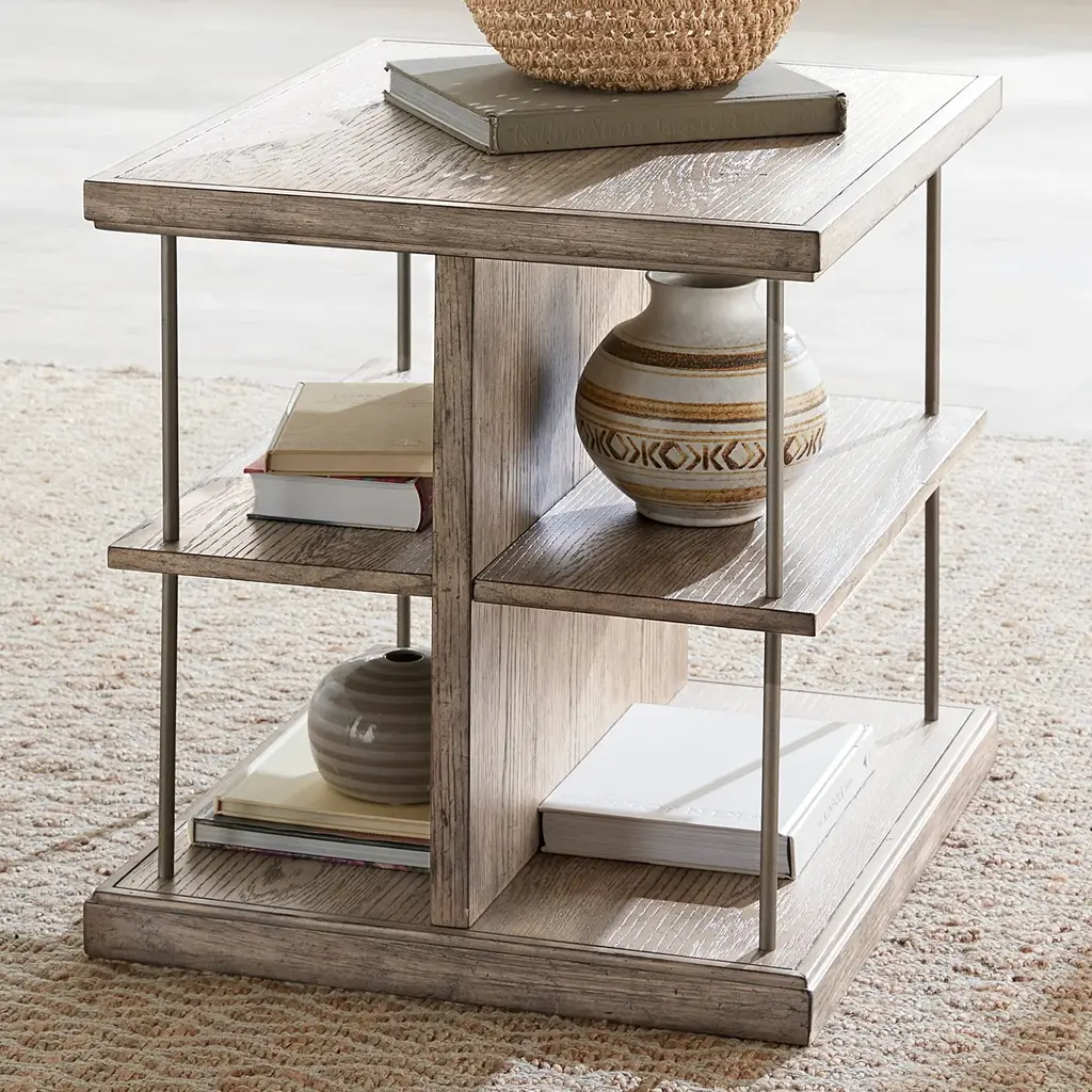 Creativity starts with the City Scape end table. Crafted with excellence using rubberwood solids and split heart white oak veneers, this piece features a Burnished Beige finish. The end table has side shelves suspended by metal tubing for a floating design, offering plenty of storage or room for display items. Built to bring a contemporary touch around your seating arrangement, the City Scape end table is sure to impress your family and friends.