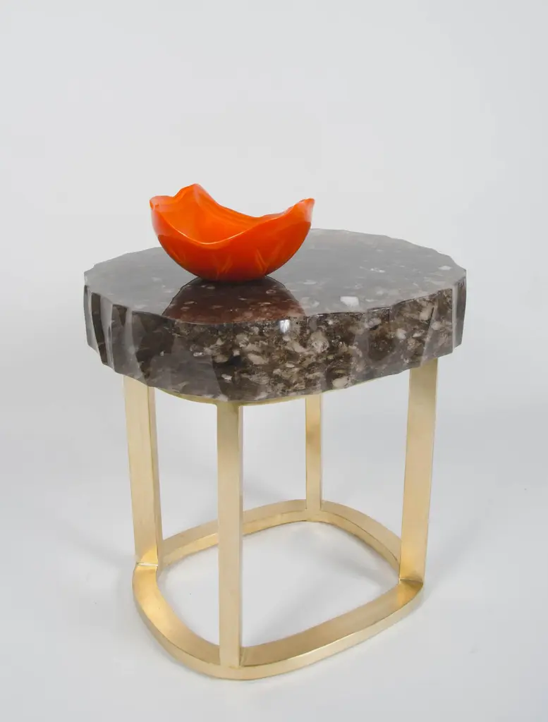 Glacier Brass Side TableSmoke CrystalHand CarvedBrass BaseLimited Edition ContemporaryTop: 24"L x 20.75"D x 4 1/4"ThickBase: 21"L x 17"D x 20 1/4"HSMOKE CRYSTAL INCLUSIONS AND COLORS VARY. Please inquire for images of crystal tops on hand. Each piece is individually crafted and is unique.