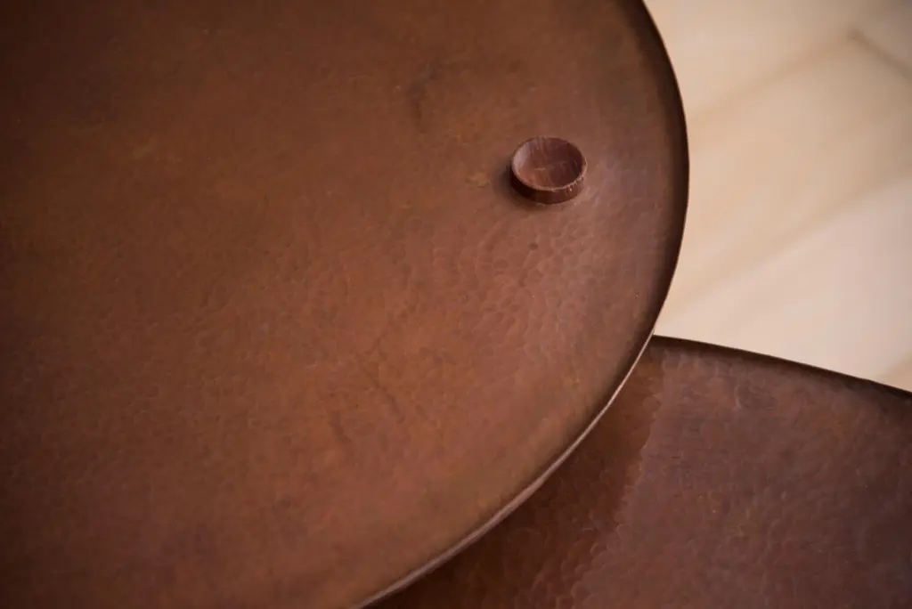 "Venus" side tables in copper hammered by hand are inspired by the planet Venus, so bright that it can be seen during the day as the luminous beautiful copper as light as its symbol; stylized representation contained by a circle with a small cross below.Shapes and tones that inspire “Venus” tables design. Its circular shape contains in its texture the reflections of the constant hammering on its copper surface and its light structure with three basic crossings that interweave.Venus table can be manufactured in clear oak and dark tzalam wood as well as give different finishes to copper with its natural tones such as patinated, shiny or rust green.Available with a 1" thick structure to give a lighter character in smaller or minimalist spaces, and with a 1 ½" structure to communicate solidity in more robust or outdoor spaces.Dimensiones80cm diameter x 40cm height 60cm diameter x 45cm height.