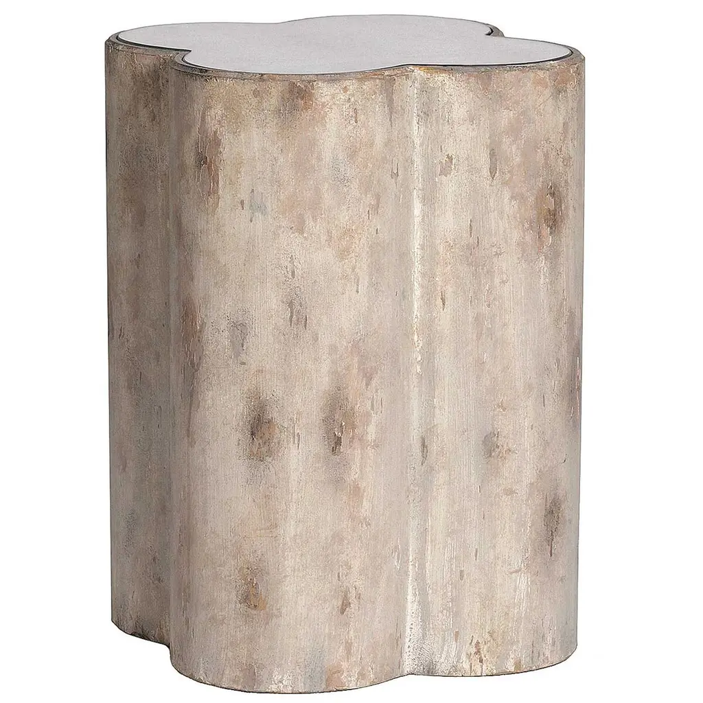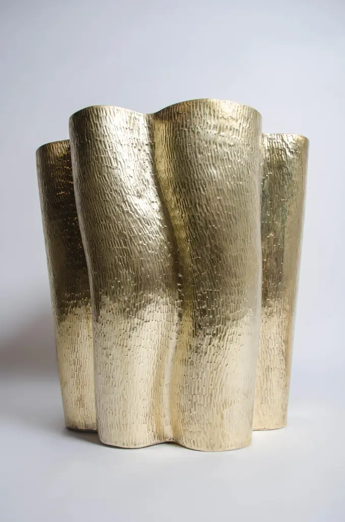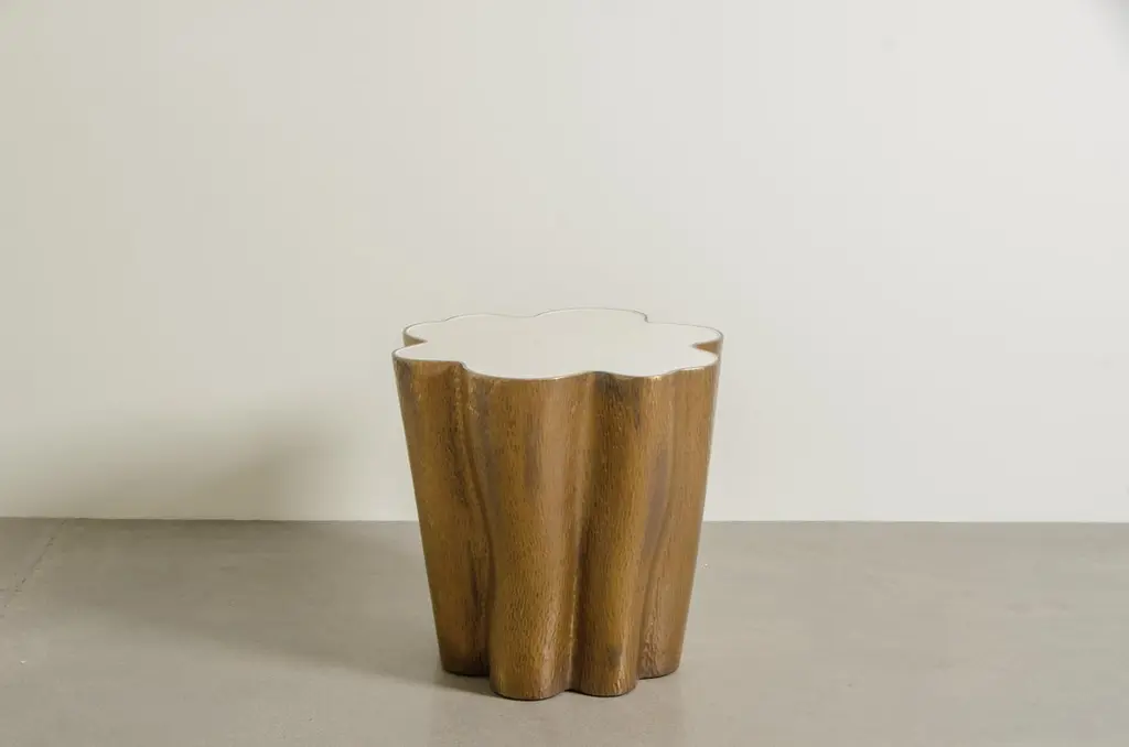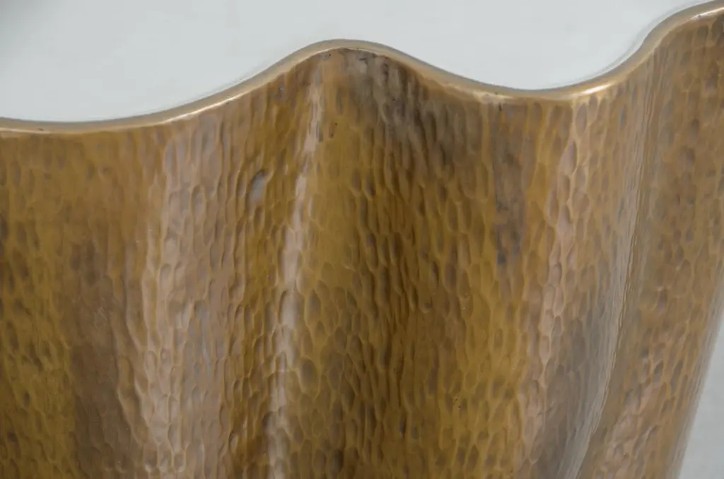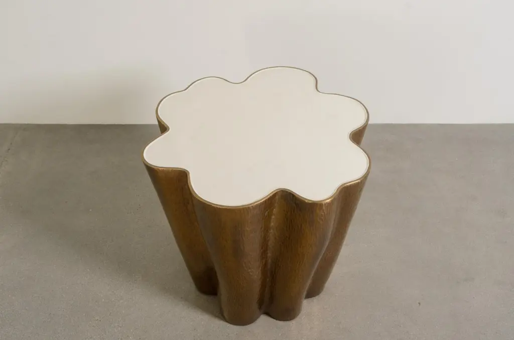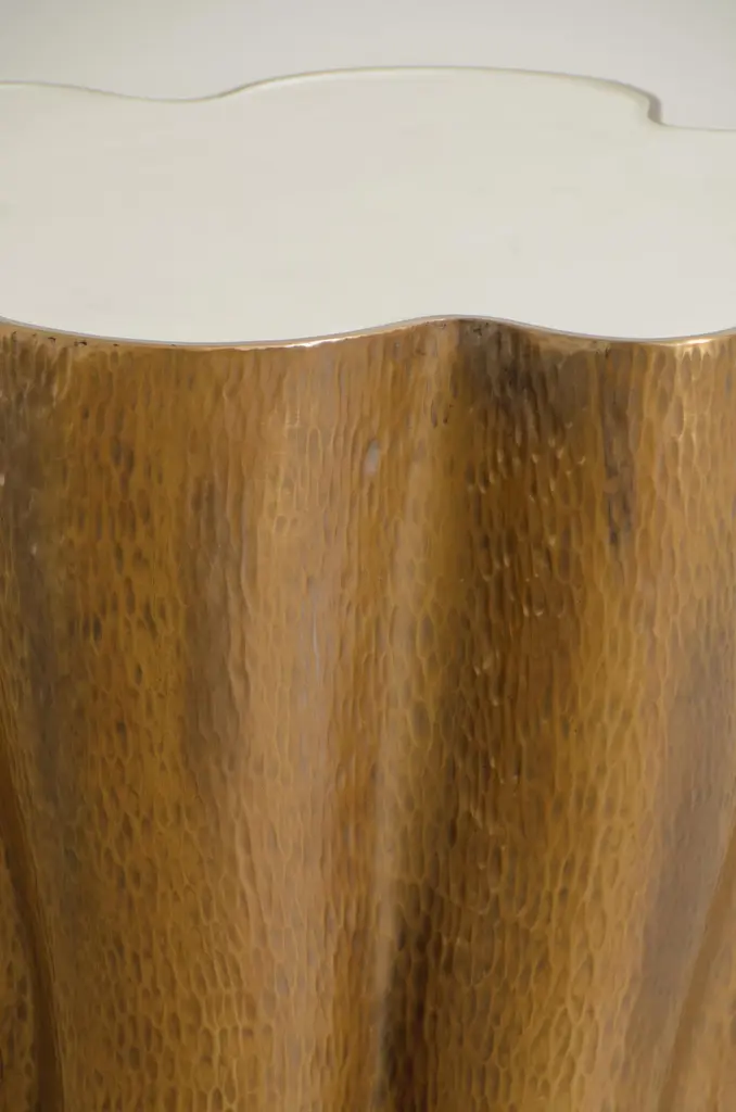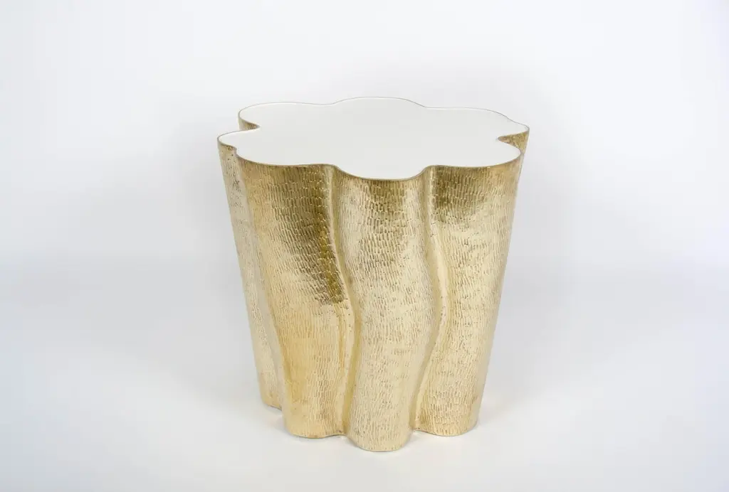 Ji Guan Side Table w/ Cream LacquerBrass Hand RepousséCream LacquerLimited EditionContemporaryRepoussé is the traditional art of hand-hammering decorative relief onto sheet metal. This technique involves using a hammer and various shaping tools. After the hammering of the sheet metal to form a shape or decorative relief, each layer of lacquer is applied with a curing period of 24 hours in between so that it can dry. Robert Kuo lacquer pieces is made with at least 60 coats of organic east asian lacquer. This Each piece is individually crafted and is unique. Cleaning solutions will alter the finish/plate. Repoussé accessories & furniture of any finish will patina when placed outdoors or in a humid environment.
