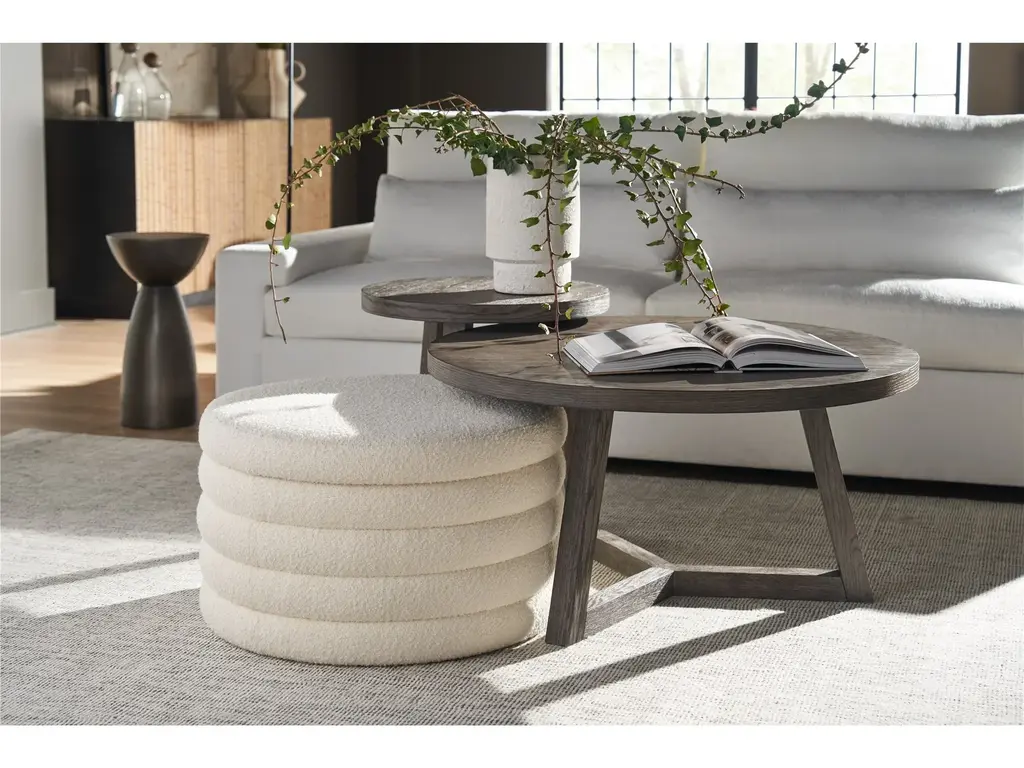 This Bunching Table presents an artful composition with its smooth, circular surface adorned in a nuanced Washed Charcoal hue, anchored by a uniquely crafted three-legged base. This table embodies a serene sophistication, blending architectural lines with a chic, modern twist, creating an eye-catching piece that enhances the dynamic of any refined space.