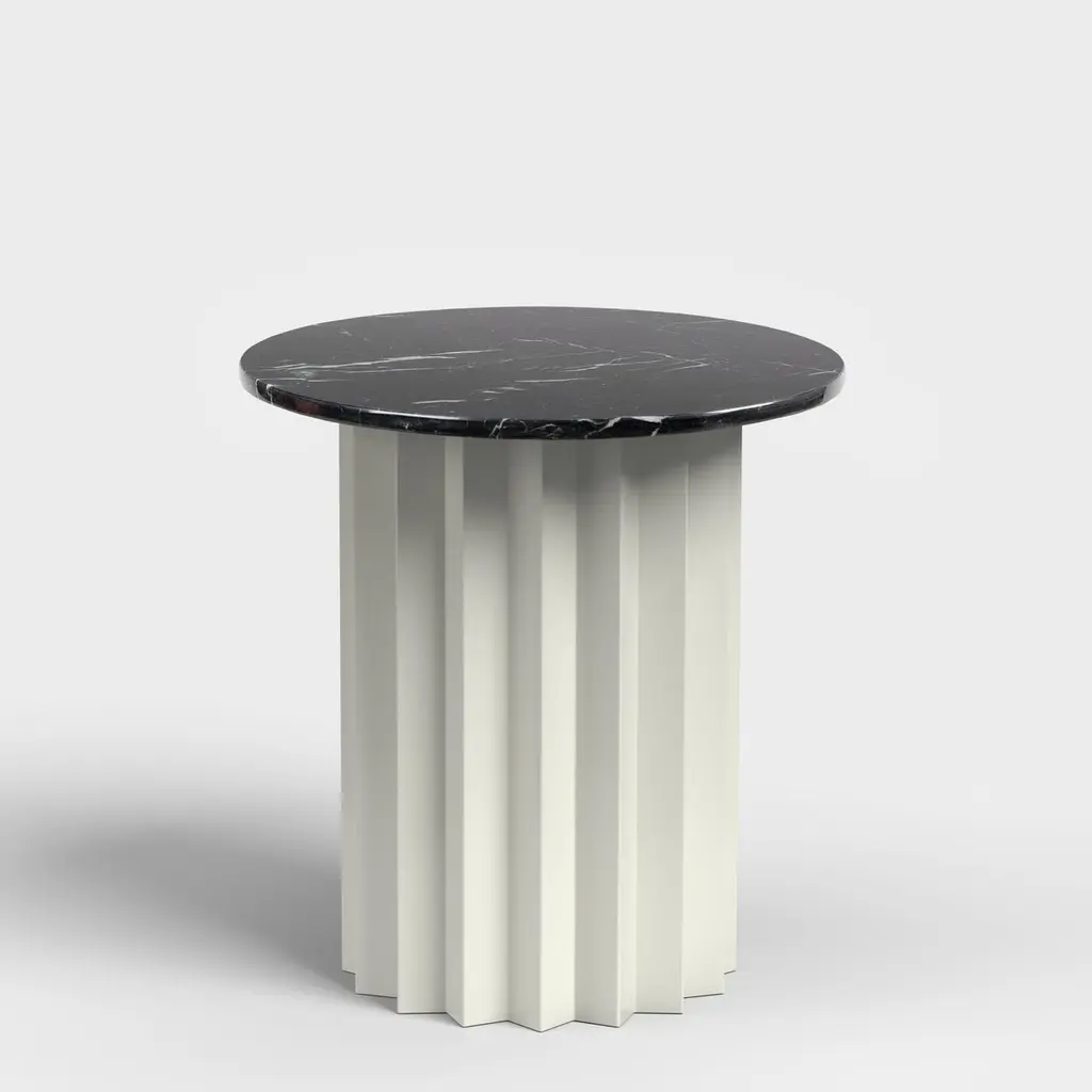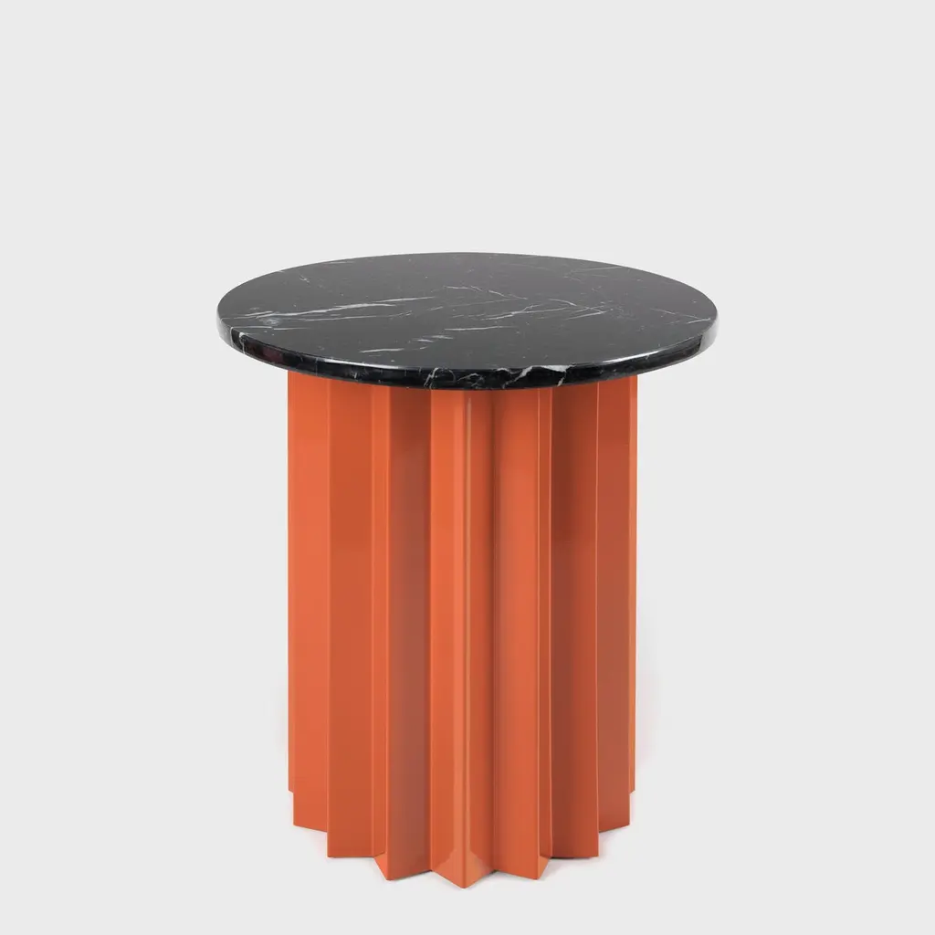 Volume is a collection of dining and side tables designed by DAY Studio in their unique simple and playful language. The powder coated metal base is completed with a table top selected from a distinguished choice of material and finish options.An AVLU staple with its zigzag fold metal pedestals in different color and sizes, Volume and our co-founder Yesim Eroktem has been featured in Phaidon’s Woman Made book amongst 200 most important women designers of the Century.Volume tables are produced upon order in marble, wood, and Avlu trademark terrazzo table tops that are custom made with unique brass inlays.
