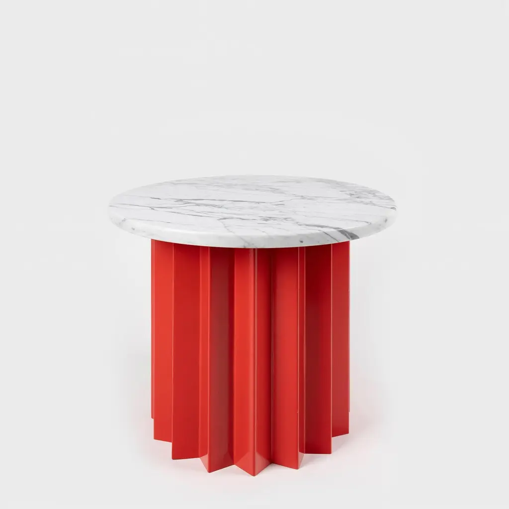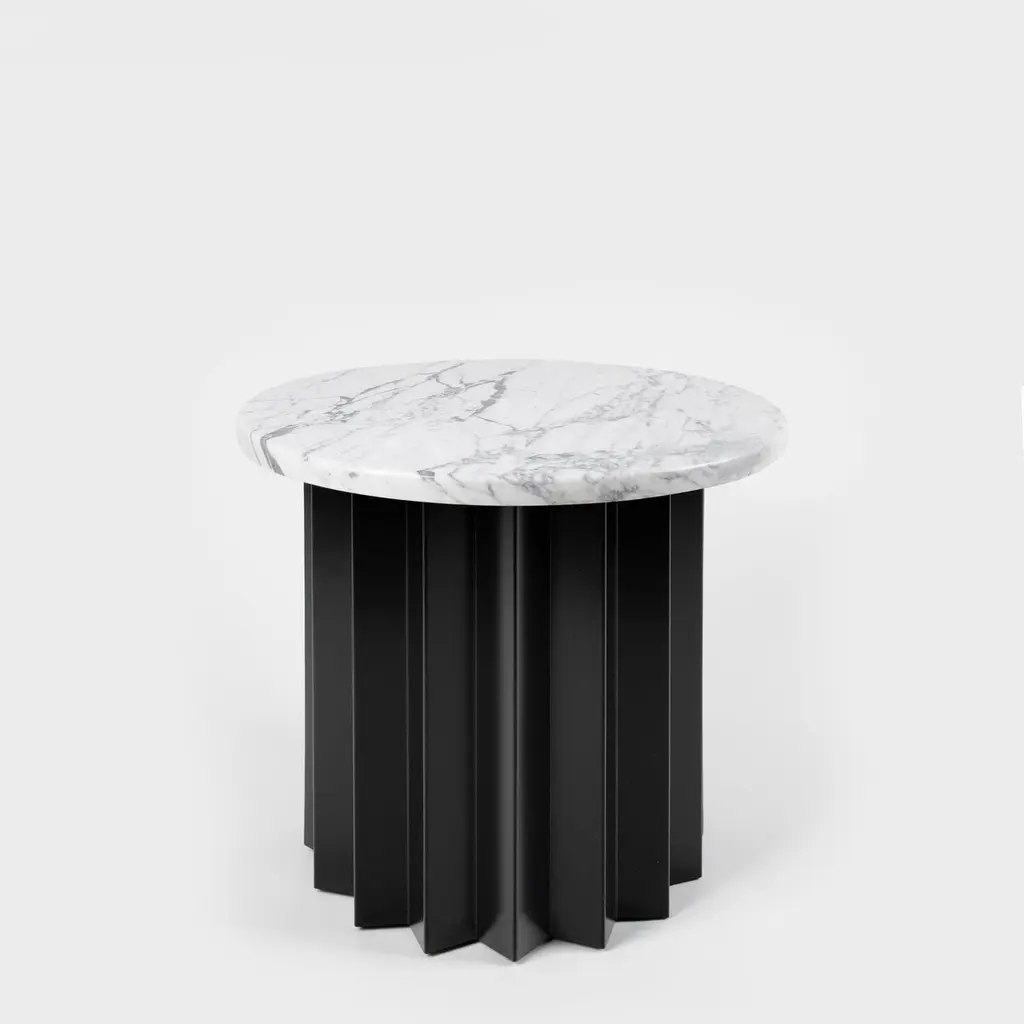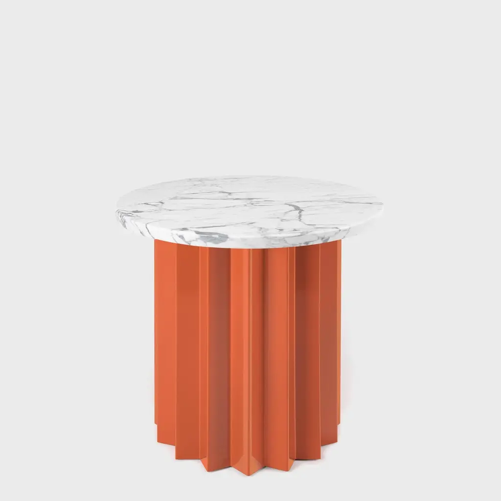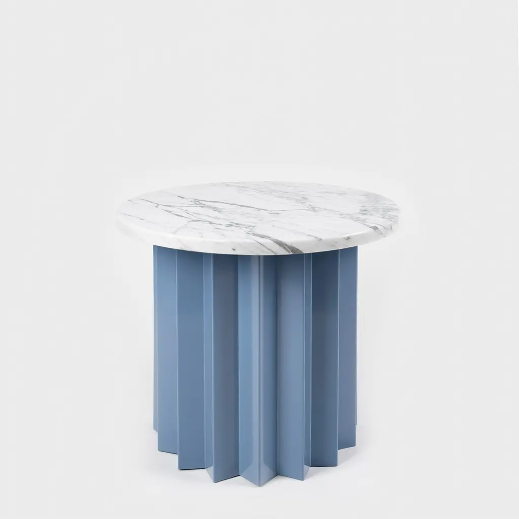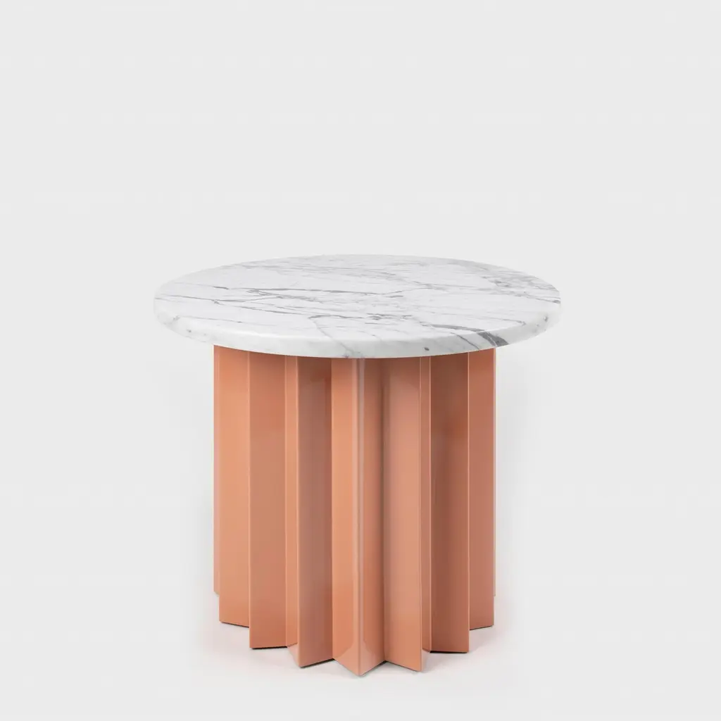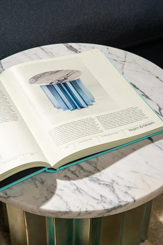 Volume is a collection of dining and side tables designed by DAY Studio in their unique simple and playful language. The powder coated metal base is completed with a table top selected from a distinguished choice of material and finish options.An AVLU staple with its zigzag fold metal pedestals in different color and sizes, Volume and our co-founder Yesim Eroktem has been featured in Phaidon’s Woman Made book amongst 200 most important women designers of the century.Volume tables are produced upon order in marble, wood, and Avlu trademark terrazzo table tops that are custom made with unique brass inlays.