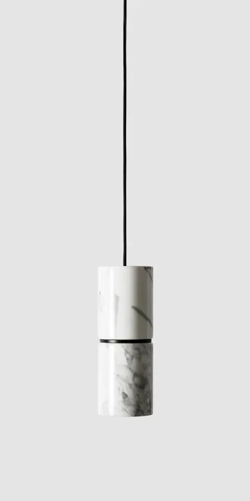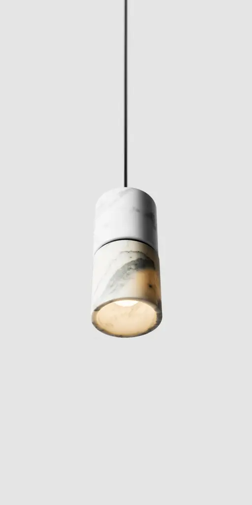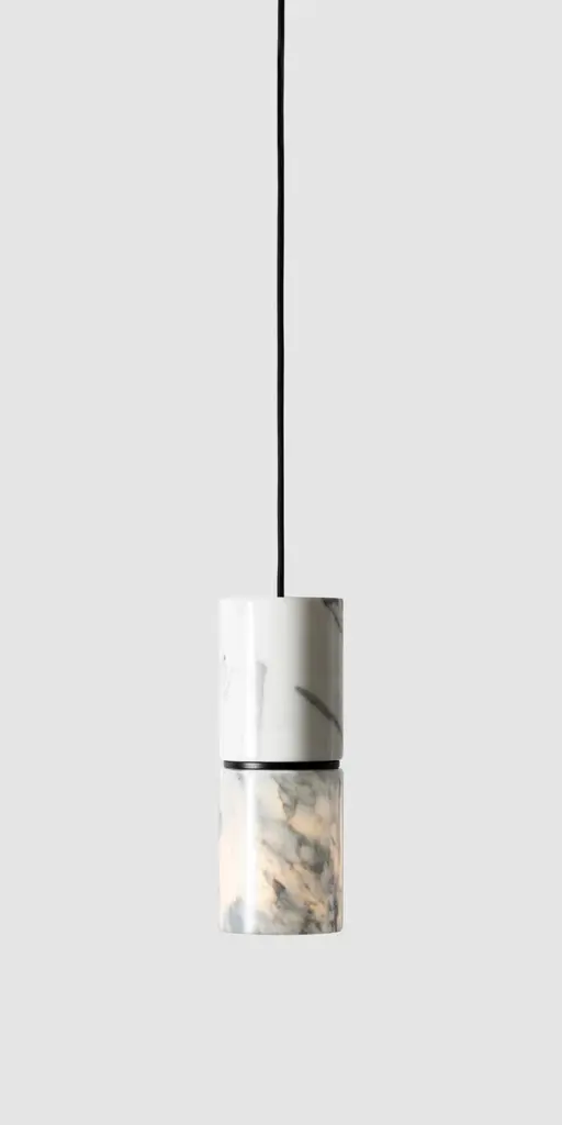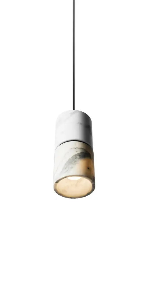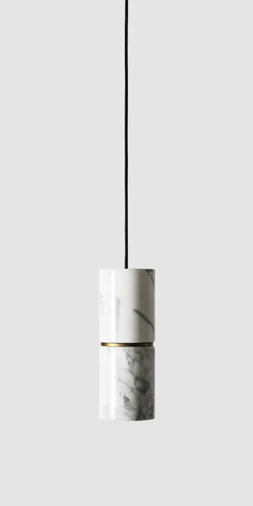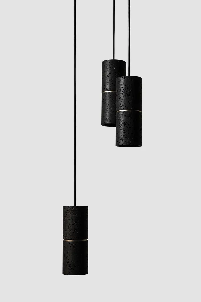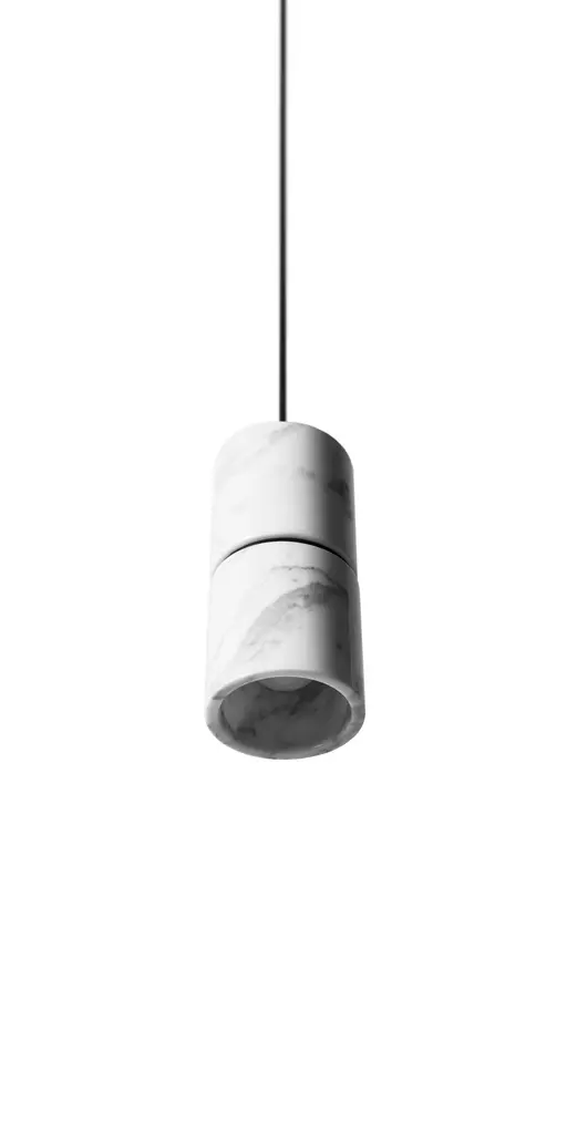 Pendant lamp 'RI' by Buzao x Bentu design. Black lava stone and white marble versions available.(Sold individually)Measures: 26.5 cm high; 10 cm diameterWire: 2 meters black (adjustable)Brass (gold) or aluminum (black) finish.Lamp type: E27 LED 3W 100-240V 80Ra 200LM 3000K.Bentu Design's furniture derives its uniqueness from the simplicity of its forms and its materials. Designed and manufactured by the designers of Studio Bentu themselves, these lamps, coffee tables, cup-boards and seats all have in common the use of concrete. This material that is usually reserved for construction use, finds here a certain nobility. The patterns that are created by the grains of this material once it flowed and unmolded is what gives the creations of Studio Bentu their originality. Accompanied at times finishing’s that are more valuable like marble or polished brass, making concrete a more suitable material for furniture.
