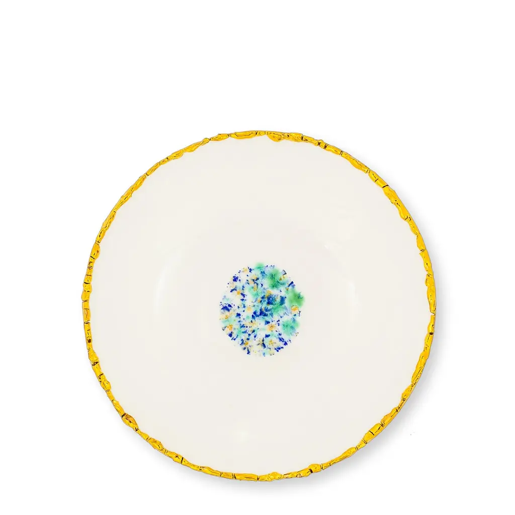 Handcrafted in Italy from the finest porcelain, this blue marble Craquelé edge soup plate coupe has an original golden crackled rim emphasizing the elegant white with its blue yellow and green décor at the center.Set of 2 soup coupe plates, Craquelé edge, white, Ø 22cmPiazza del Popolo, blue marble collectionHand painted porcelainHand painted 24-karat goldMade in ItalyFirst introduced at Milan Design Week 2018, the Piazza del Popolo collection is named after a Roman landmark, at the heart of Roman everyday life, and inspired by traditional, simple Italian artisanal pottery yet decorated in a personal and elegant key. Each Coralla Maiuri product is entirely hand decorated. Each is a work of art. While consistent, they are never identical. Slight variations of decor and color from one to another are not only normal, but to be expected as a sign of their uniqueness.Other sizes are available for the Blue Marble collection.For large quantities, production lead time to be confirmedEven if all our tableware products are suitable for dishwasher machines, for long term conservation we warmly recommend to favour non-aggressive soap and delicate washing.Due to the presence of real 24-karat gold, this item is not suitable for microwave.