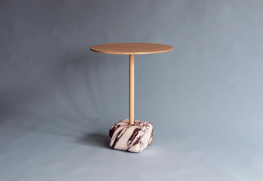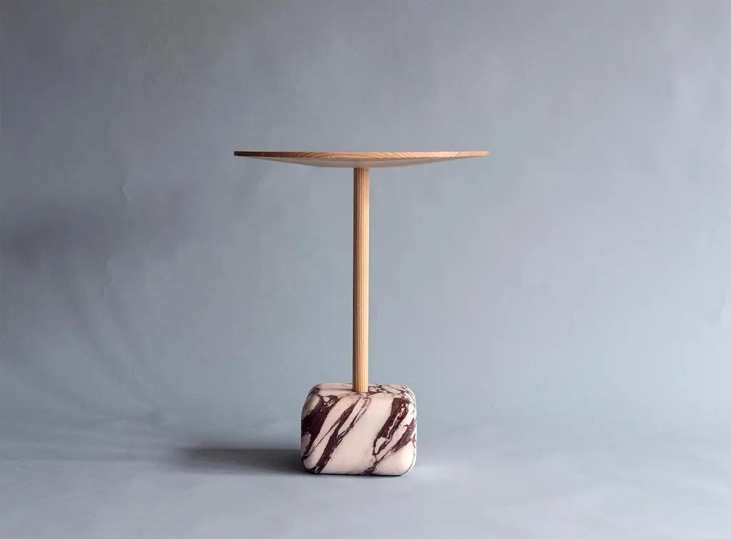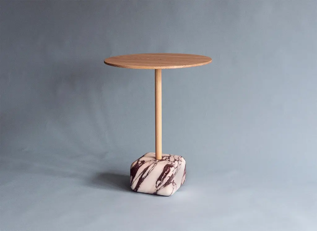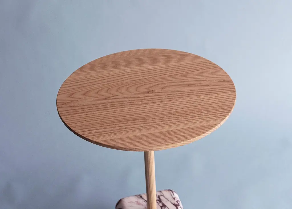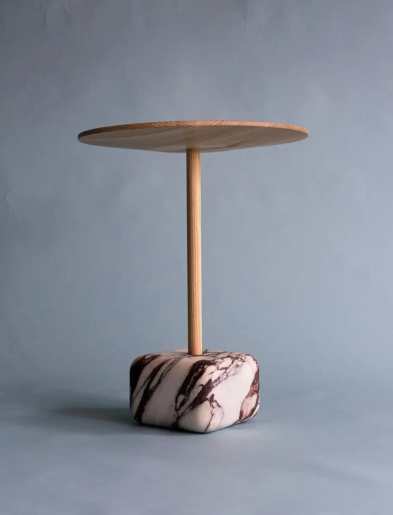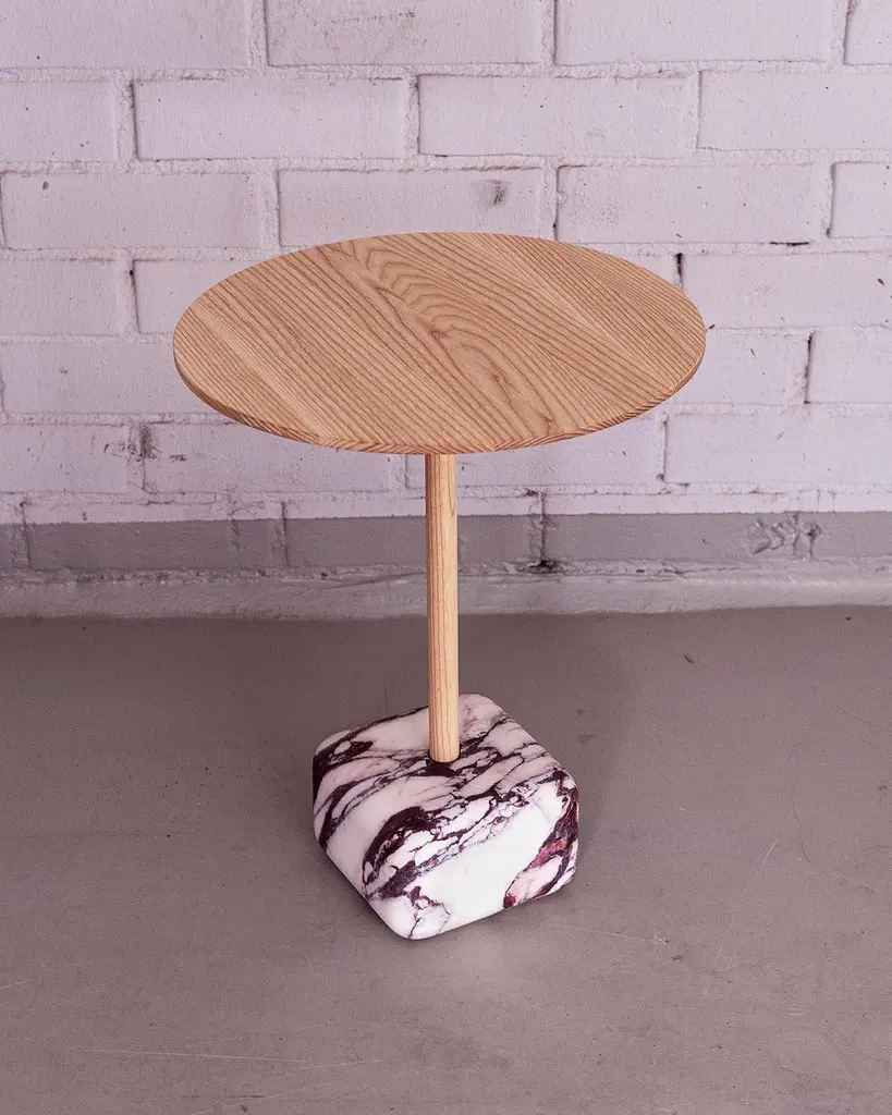 Small side table in Arabescato marble and ash wood with a single wood pillar. The Marble base with it's soft corners gives the table a stable construction.