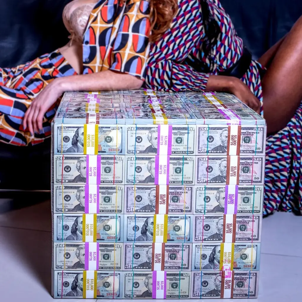 The Stash coffee side end table is handmade with hundreds of shrink wrapped mix prop stacks of 20s, 50s and 100s. A one of a kind piece. Excellent for home, office, lounge and bars. Guaranteed to grab everyones attention. A functional art piece of furniture and a great source of wealth inspiration. Great Prop for Videos and Photoshoots. Fresh design, sure to enhance your living/office space. Unique, stylish, functional and suitable for any room. Attention Grabber. No Assembly Required Designed & Handmade in USA Material: Mix prop stacks of 20s, 50s and 100s with high density pretective vinyl wrap on a wood upholstered structured cube. Dimensions: 17" W 17" H 18" D "Fortune sides with those who dare" — A man on the rise.