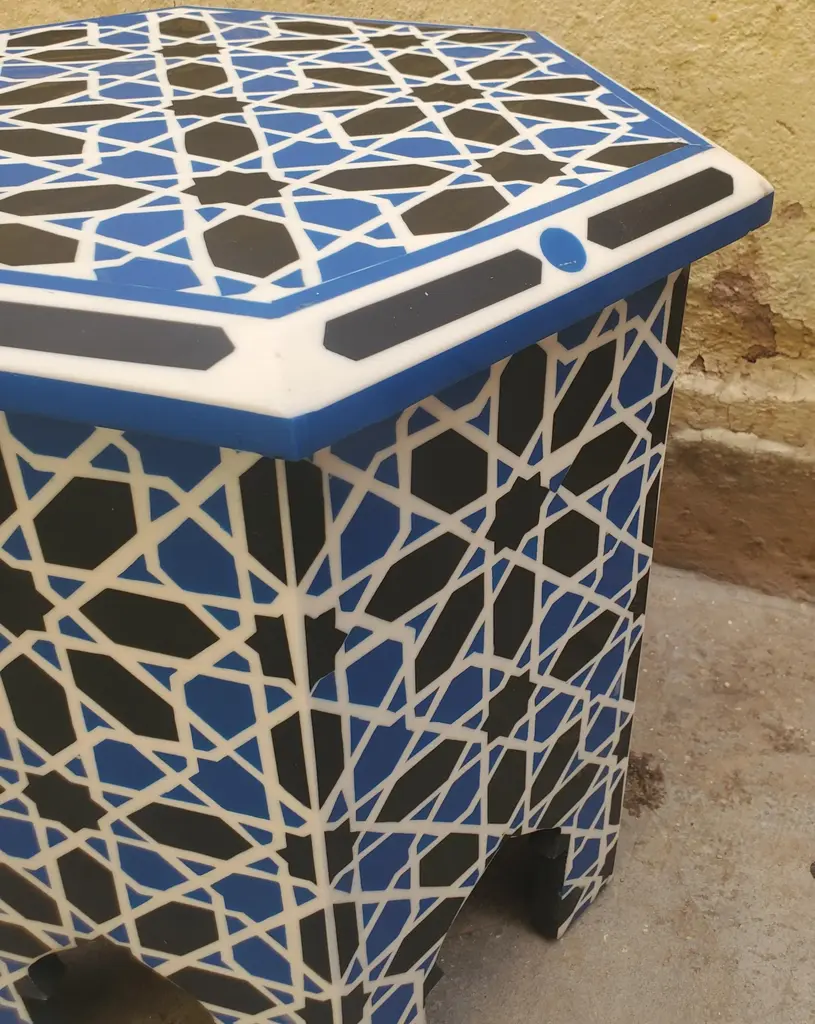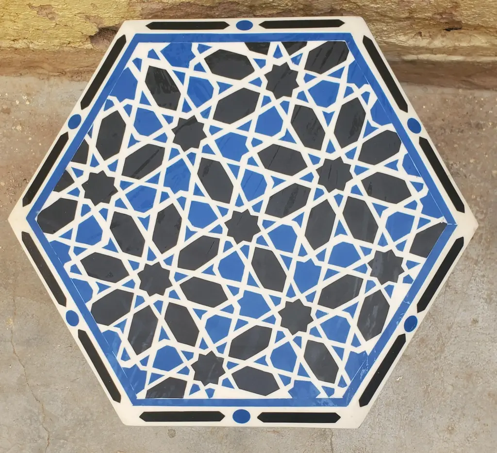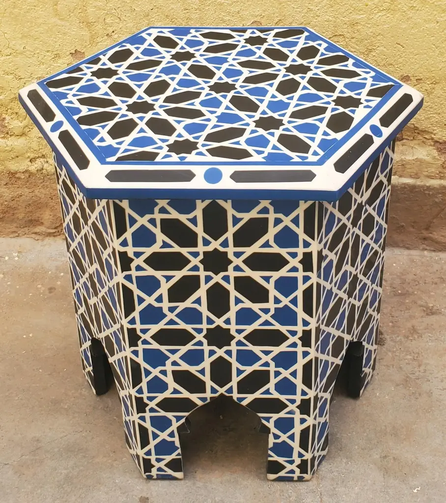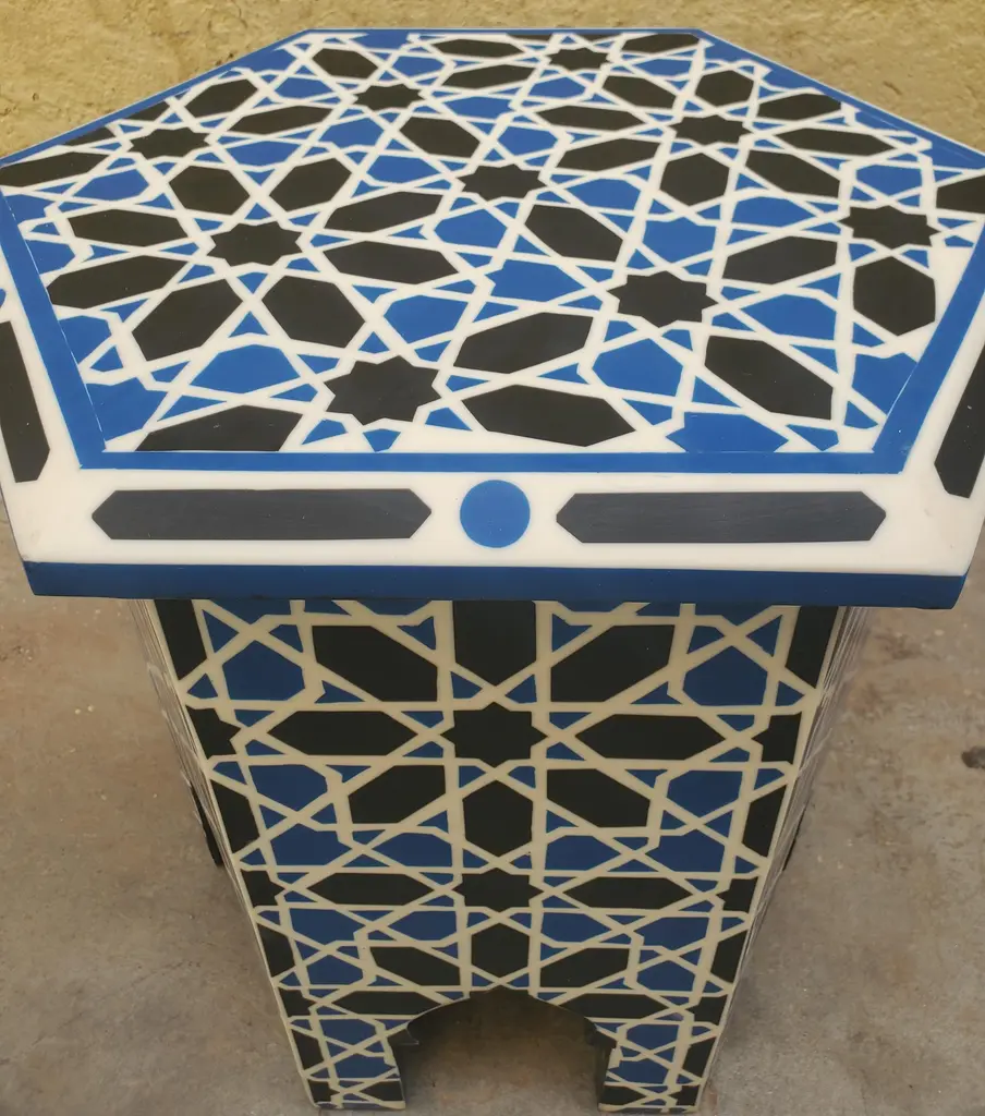 An amazing side table. The perfect Mediterranean touch!! Handmade Moroccan wooden and resin end table, measuring approximately 20" in height and 19" from side to side. Color is black, Blue and white. Hexagonal shape and an amazing modern traditional look. Great handcraftsmanship throughout.