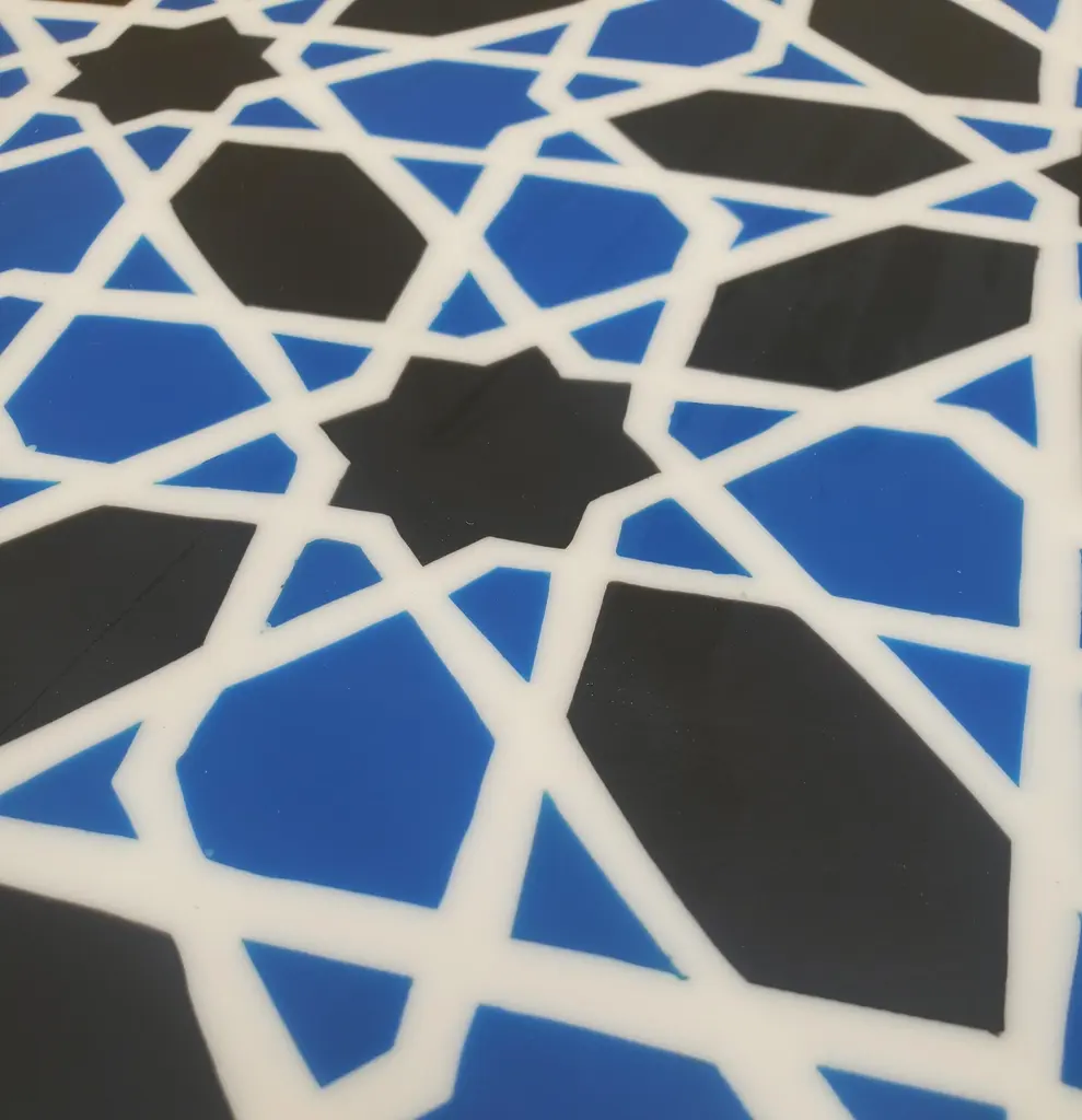 Contemporary Traditional Moroccan Resin And Walnut Wood Side Table / Blue, Black And White Zellige Pattern