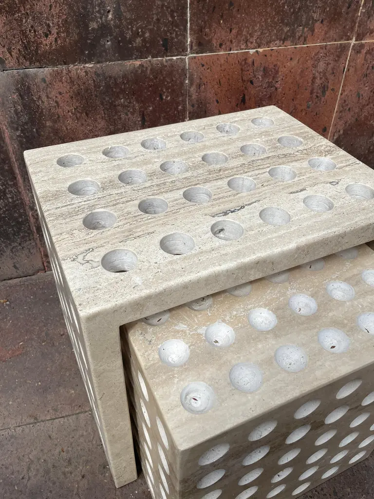 Contemporary marble nesting tables with beautiful hand carved dotted pattern. This tables are surely fun and easy to look and will definitely be an outstanding addition to any space.The small nesting table provides a different level and various layout options.Each table is sold separately.This sculptural tables can also be used as stools.HIVE I: 51 cm L x 40 cm D x 46 cm HHIVE ll (cube): 40 cm L x 40 cm D x 40 cm HAvailable in black or white marble. Please contact us for further information.We are proud of the level of craftsmanship that can be found in our Mexico and we are eager to show it to the world through our work.
