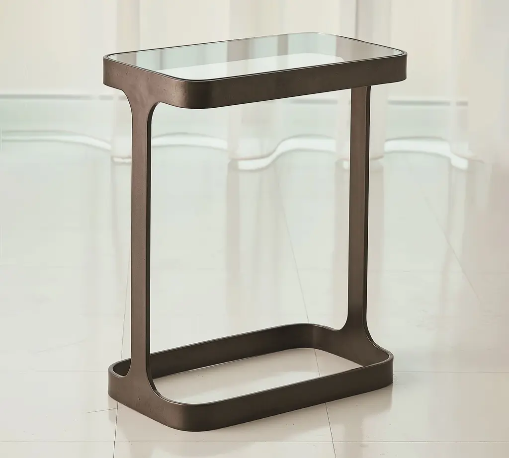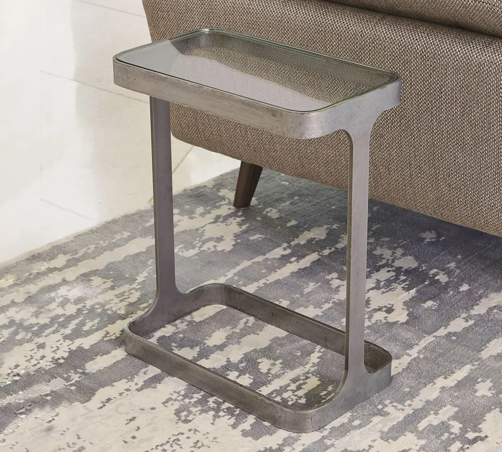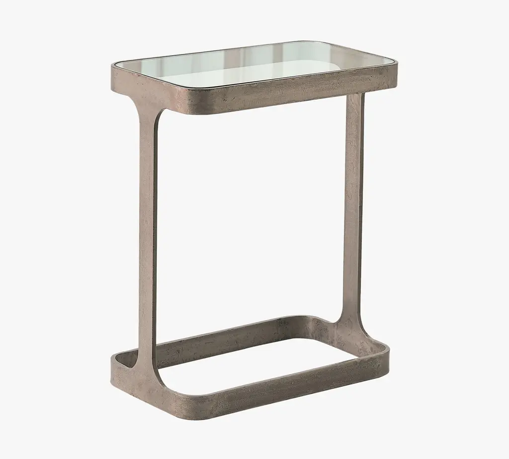 Small in scale but big on beauty, this accent table is expertly handcrafted of steel with a natural iron finish. The slight patina of metal contrasts a sleek glass top, making for an ultra-versatile piece. And because of its open frame and petite size, its a perfect addition to any room where space is at a premium.