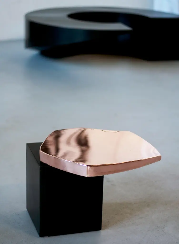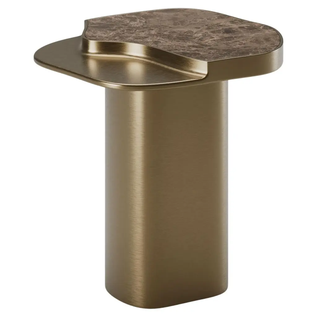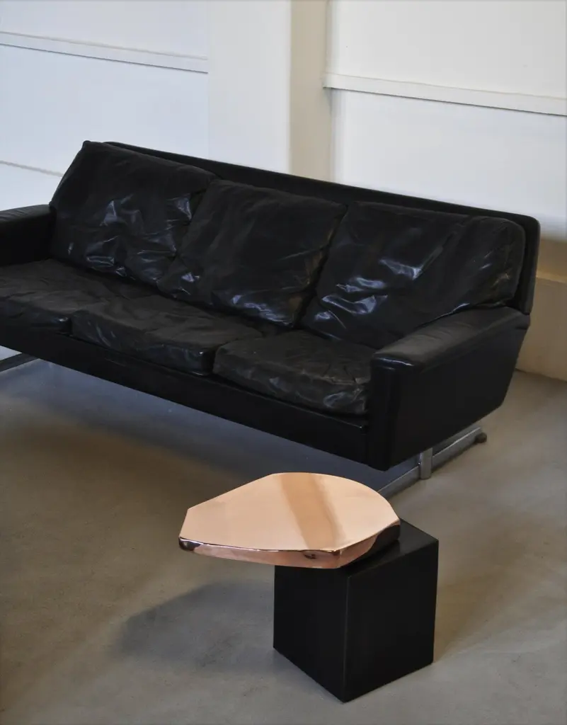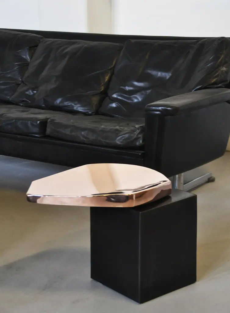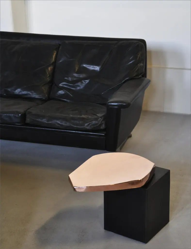 Copper Side Table by Pol Quadens Limited Edition Of 24+8 Pieces.Dimensions: D 40 x W 50 x H 40 cm.Materials: Patinated steel and polished copper.Pol Quadens was born in Brussels. His father was active in the fields of composites the metal industry, and the world of materials, therefore, surrounded Pol since his early childhood. After his artistic studies, he starts restoring vintage cars. This experience has allowed him to gain strong practical skills and a deep knowledge of all materials.In 1987, he made his first creations and production of objects. His sensitivity and passion for the arts led him to create functional artworks. His CD shelf has sold more than 100,000 pieces and has become iconic in its category.
