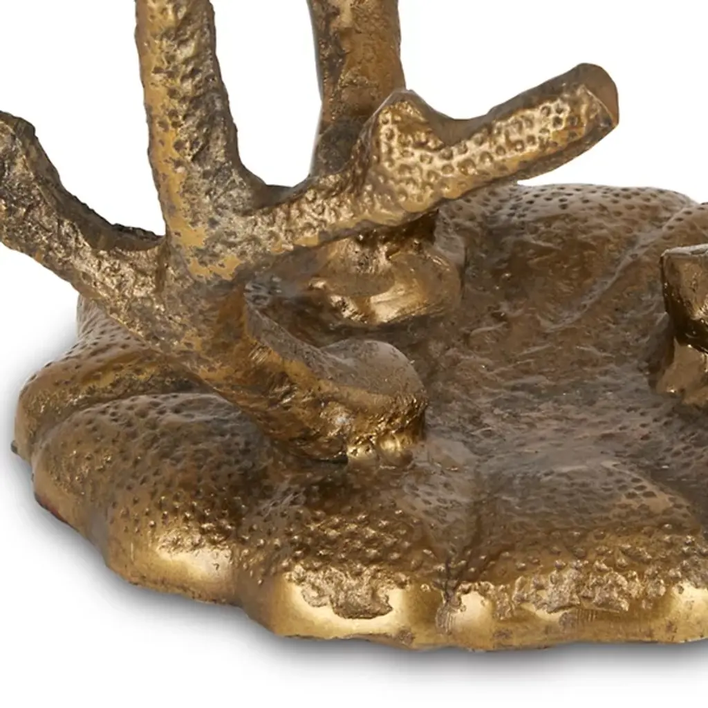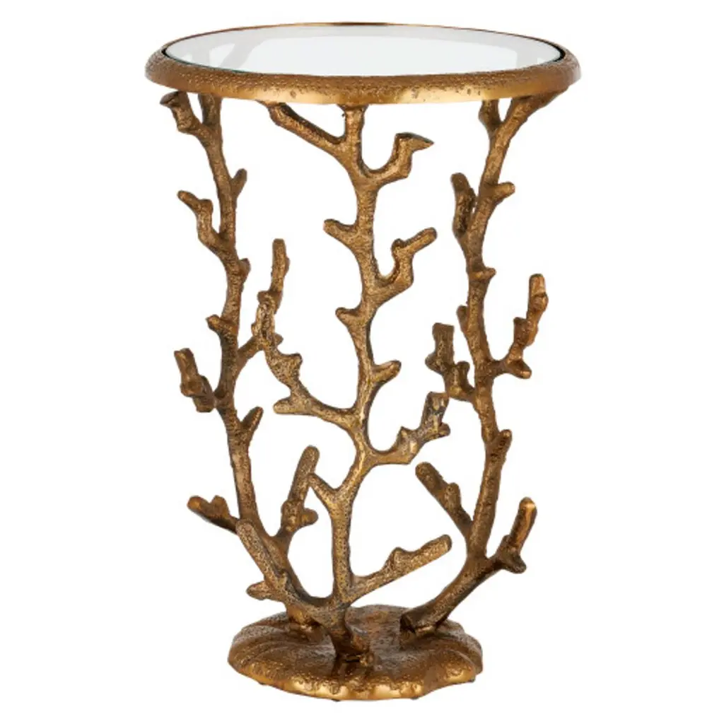 The Coral Accent Table from Currey & Company brings coastal & nautical charm to your home. Inspired by oceanic elements, this accent table showcases a stunning coral design, made for adding a touch of seaside flair to your decor. Crafted with cast aluminum and a glass top, it exudes both durability and elegance. The protective bumpers ensure your furniture stays safe and scratch-free. With a sturdy baseplate, this table stands strong and stable.
