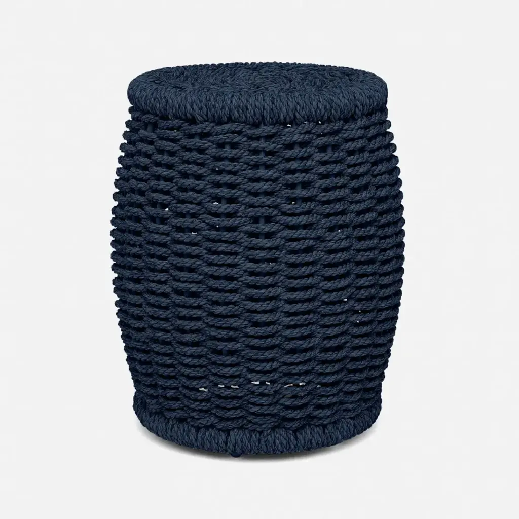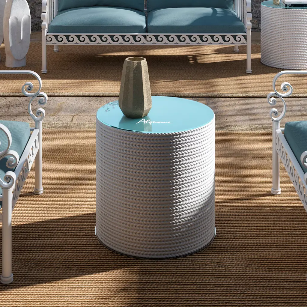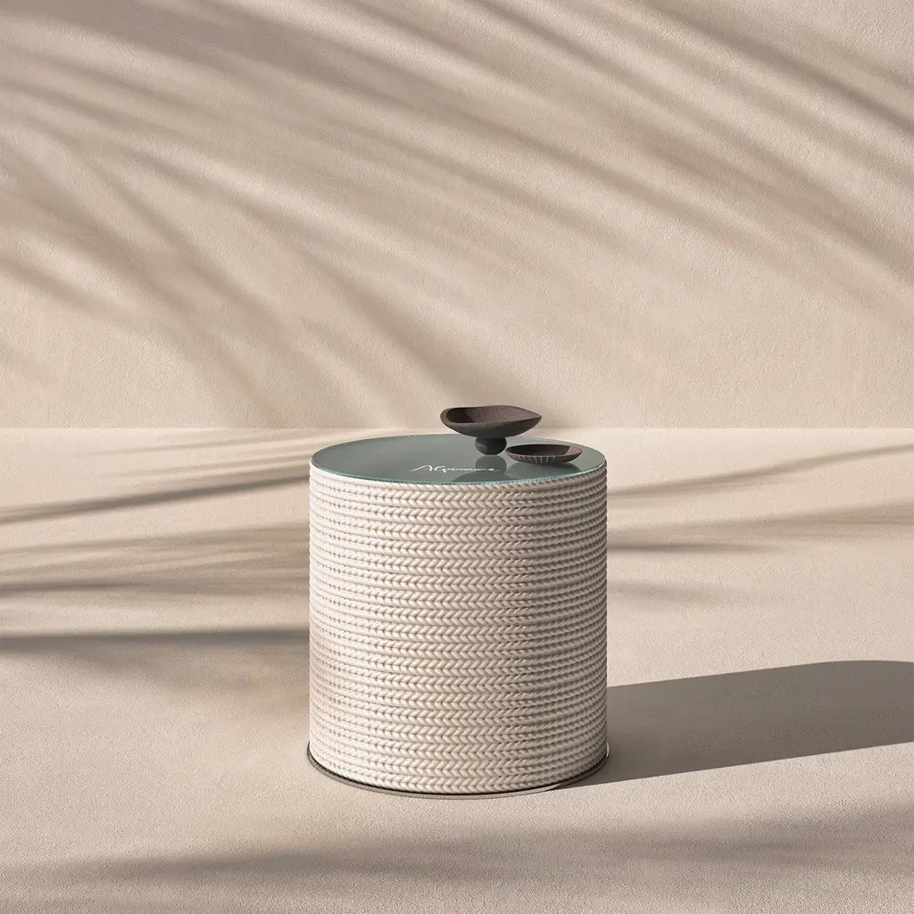 Refined references to nautical style and a fresh color palette recalling white shores lapped by azure waves reveal this oval-cut side table's marine inspiration. Ideally complementing a refined boat or beachfront decor, it is distinguished by white PLA (polyurethane) ropes tightly coiled around its oval-cut body. Also fit for occasionally laying a tray or placing a table lamp.
