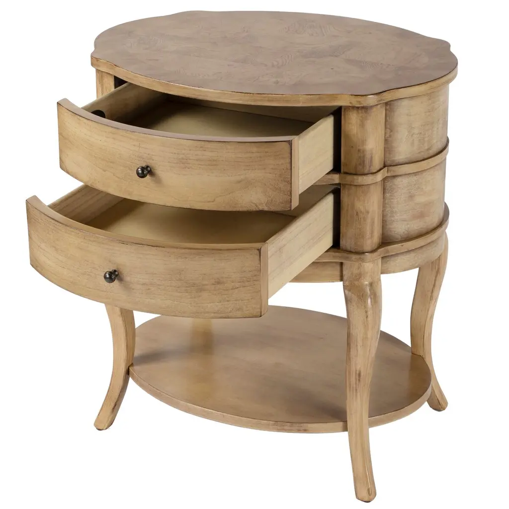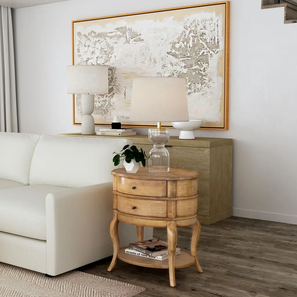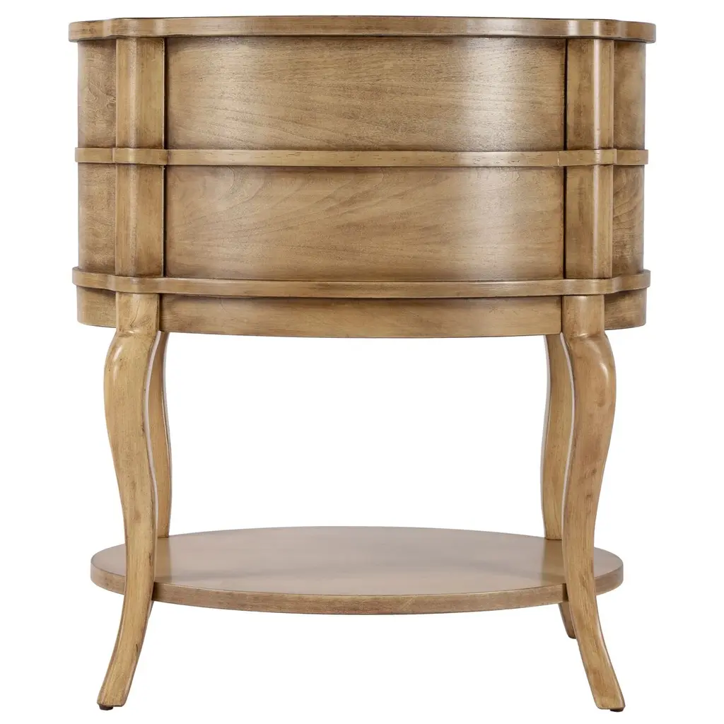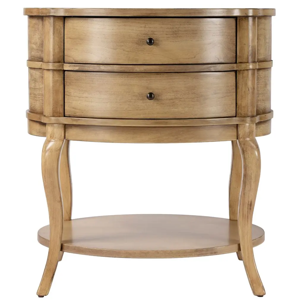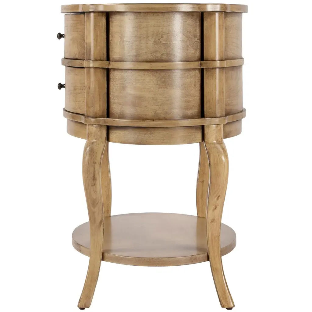 With polished curves and subtle finesse, this transitionally styled table has a sleek, functional design that suits almost every decor. Featuring two drawers with antique brass-finished hardware plus a bottom shelf, this classic table is a beautiful chairside or bedside addition.