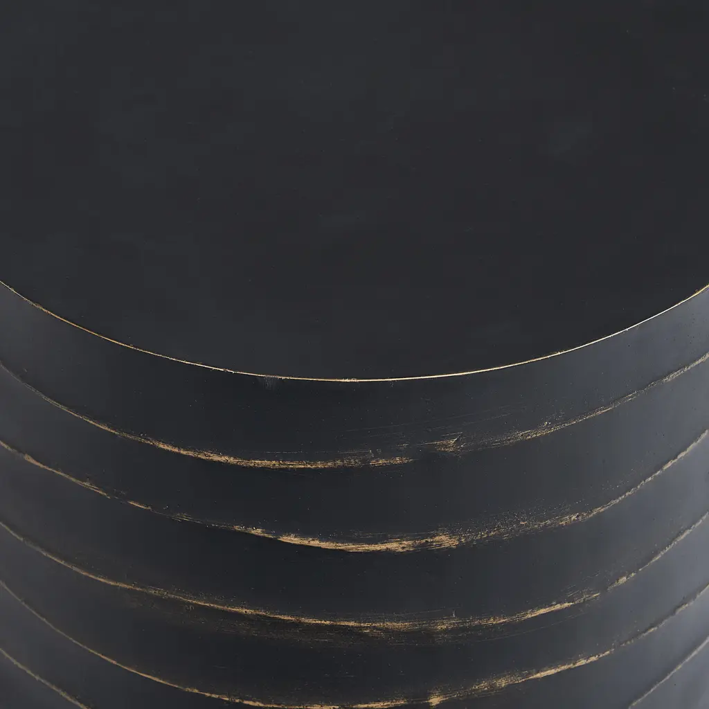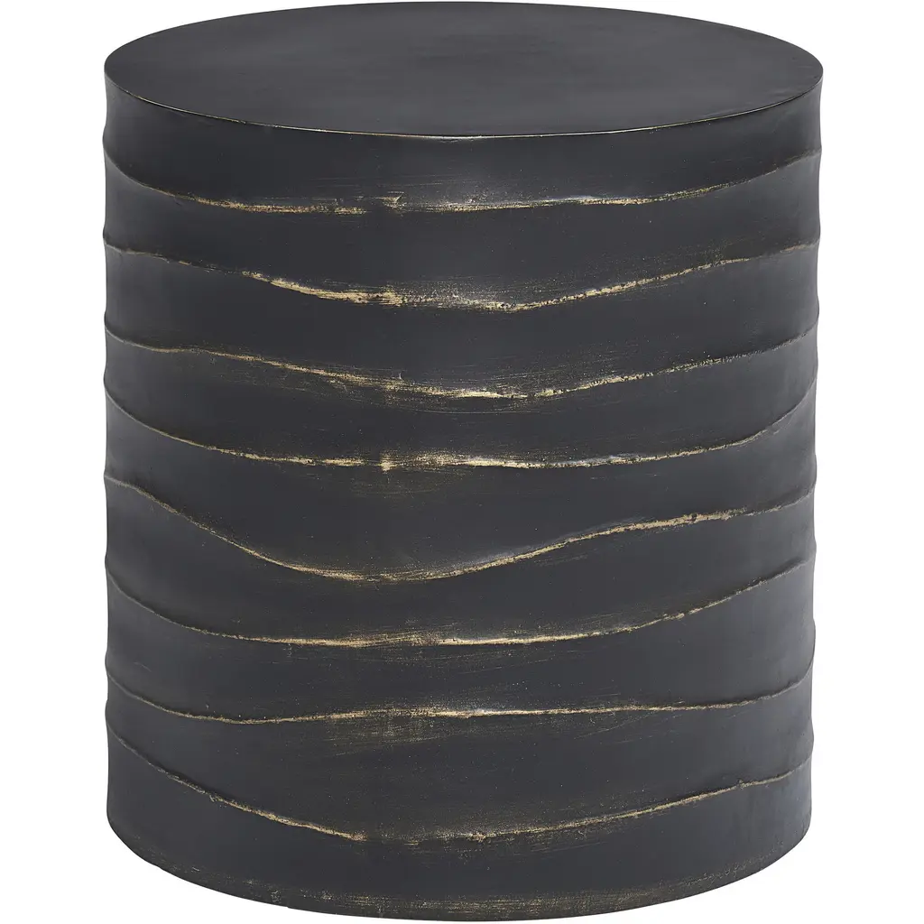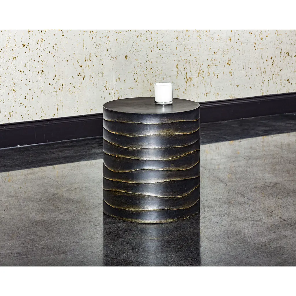 This round side table will create a moody environment. Crafted from concrete, this piece features hand sculpted ridges with a painted brass finish. The perfect addition to living, lounge and office spaces.