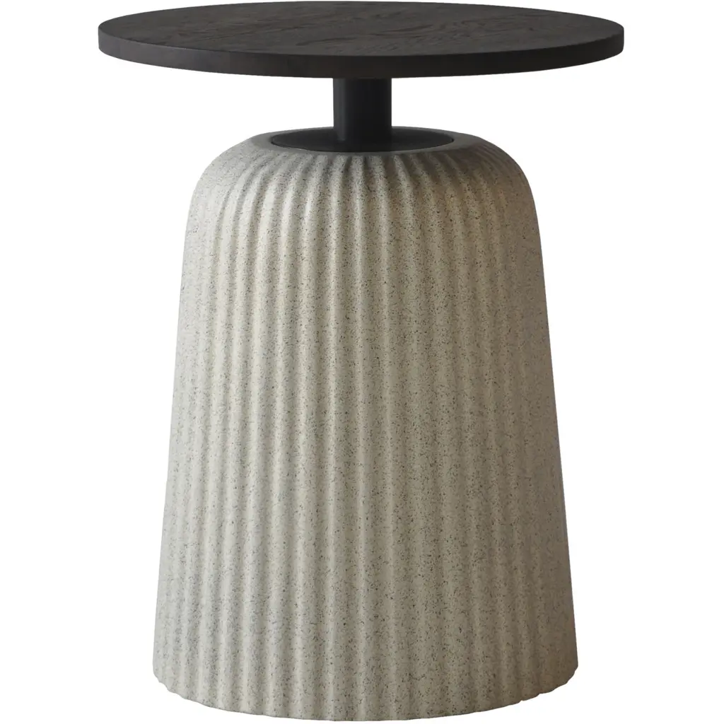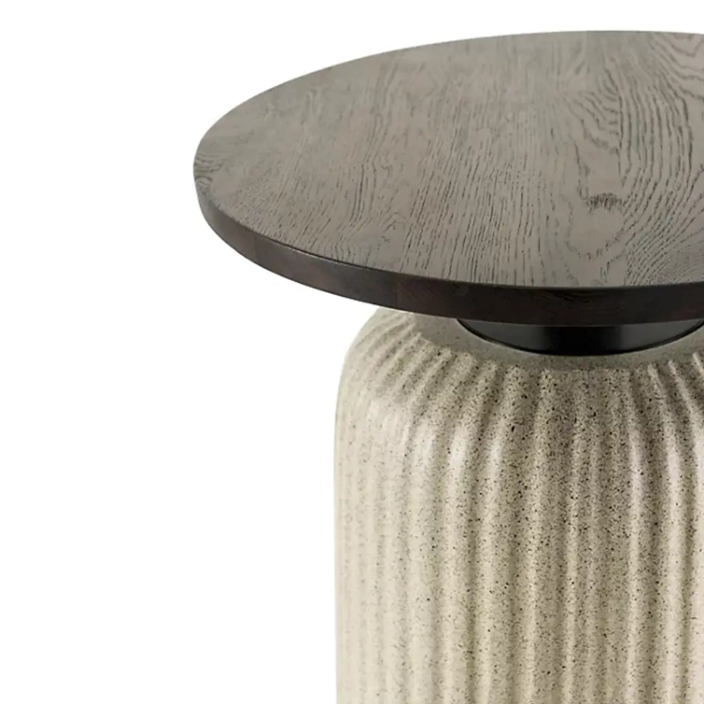 The Cornelia End Table from Surya provides a welcome mix of contemporary design and rustic modern charm. A dark brown stained oak veneer top with brown natural MDF sits atop a beige hand-painted concrete base with vertical contours, adding texture and depth. The black powder-coated steel fitting below the wood disc top complements the table’s modern aesthetic. Made in Vietnam, this versatile piece brings warmth and style to any living space, elevating its surroundings with a bold yet balanced presence.