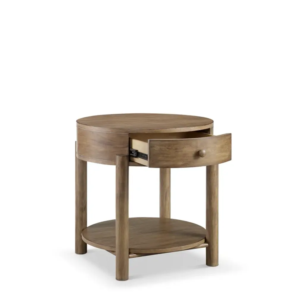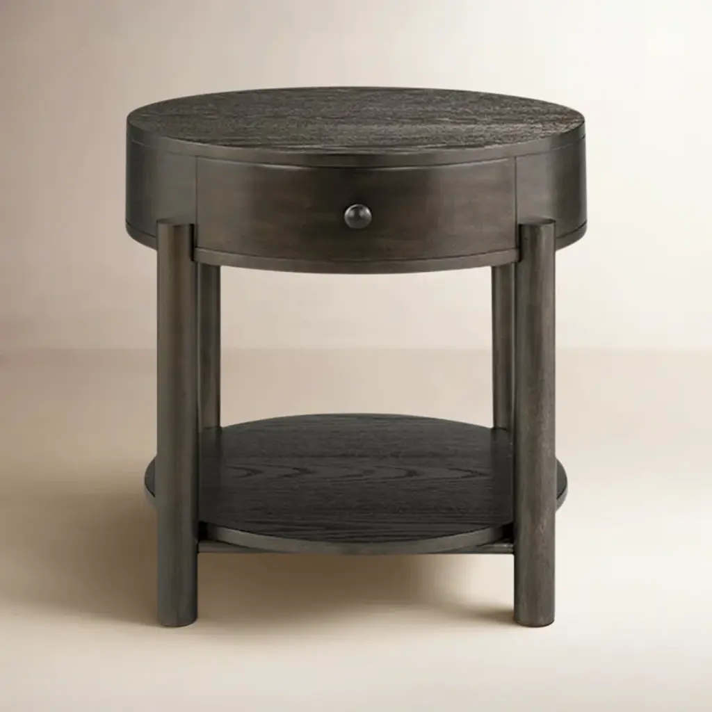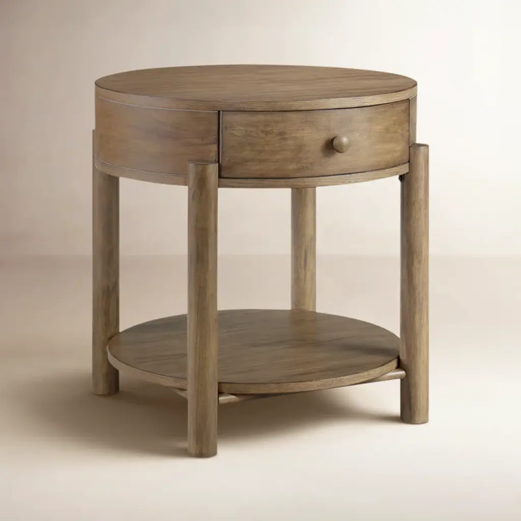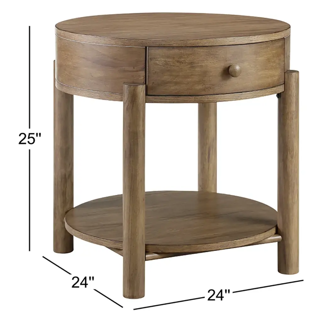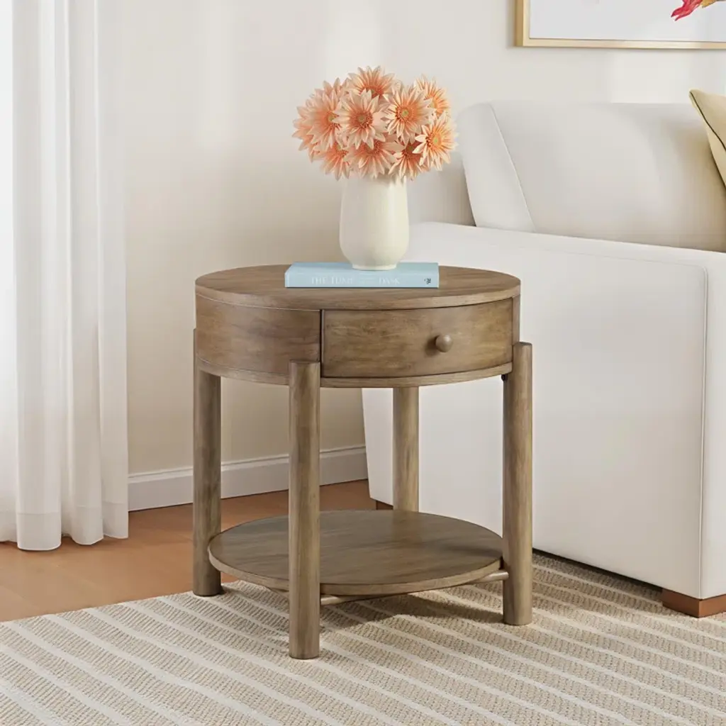 Elevate your living room with this round coffee table that combines form and function. Crafted from solid oak wood, it showcases the natural wood grain color variation for a touch of rustic charm. The table features a lower shelf and a single drawer with metal ball-bearing glides, providing ample storage for your favorite books, magazines, and remote controls. Plus, its stain-resistant and kiln-dried wood construction ensures it'll be a lasting centerpiece in your home. Gather around for game night or enjoy a cozy cup of coffee with this versatile piece.