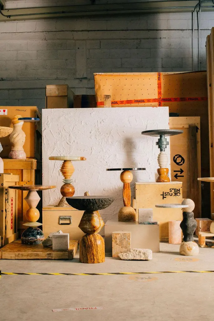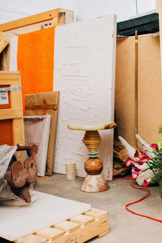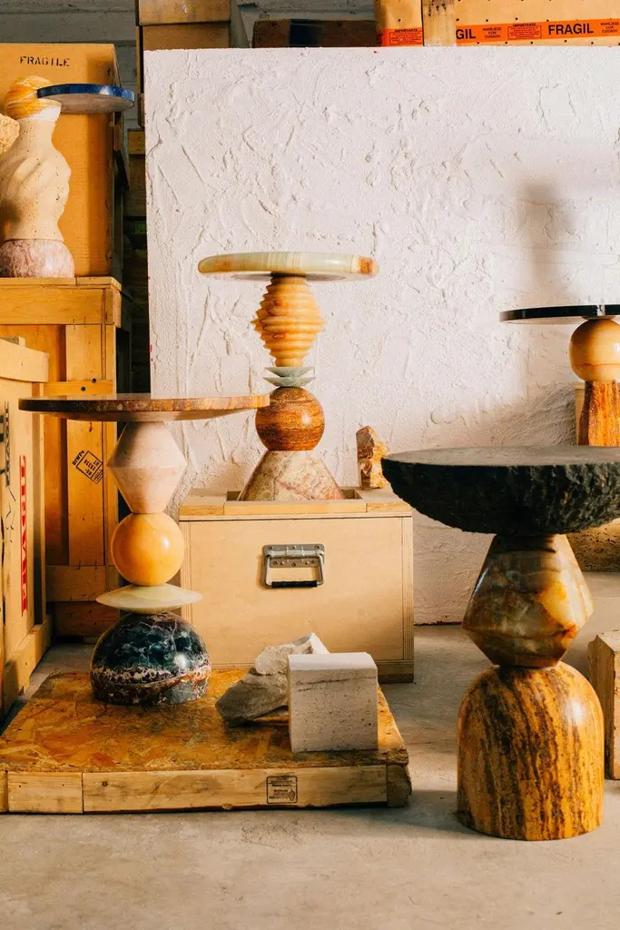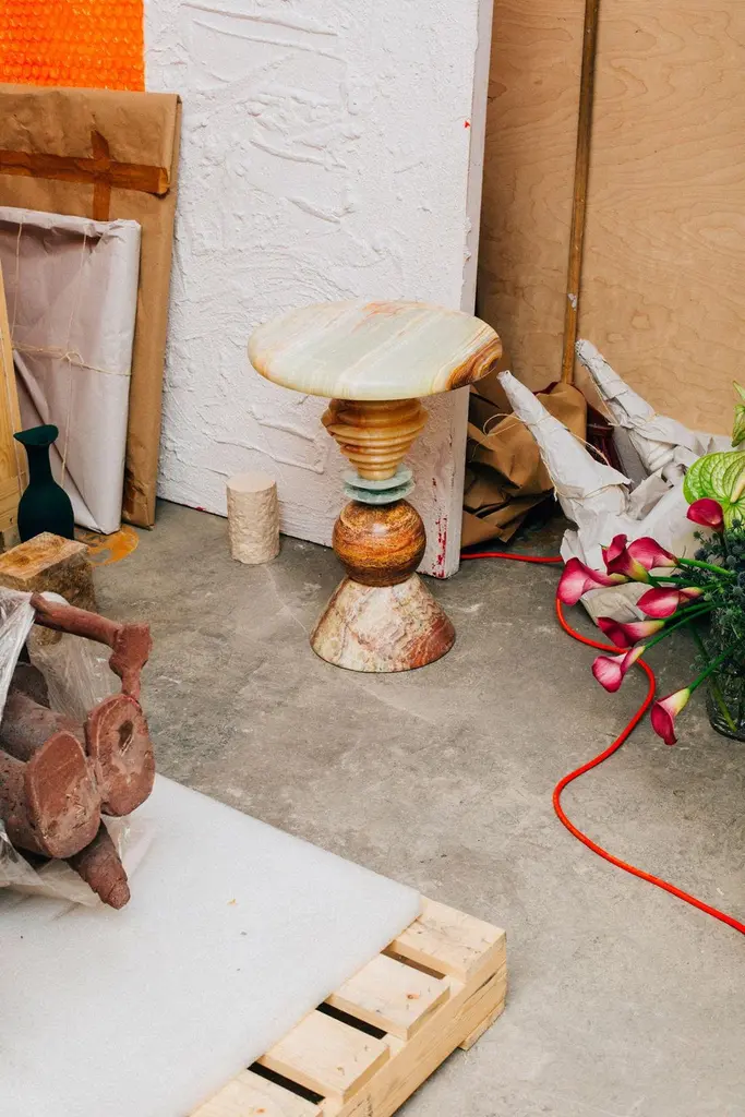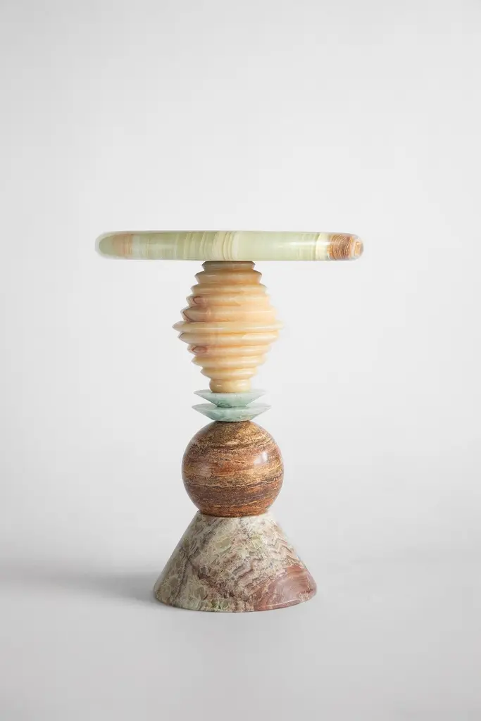 Materials: Botanic onyx, red travertine, fluorite, pineapple onyx, olive green onyx.Hand crafted Side tableFor indoorsInspired by the enduring legacy of observing the cosmos, 'Cosmic Traces' evolves from the essence of 'Cosmic Relics.' While totems connect us to the spiritual and ancestral, 'Cosmic Traces' represents the physical manifestation of those energies in our daily lives. Each table in this collection is a bridge between the abstract and the tangible, embodying the progress from cosmic observation to human creation. The meticulous arrangement of stones mirrors the pathways of celestial bodies, tracing the lines of influence that shape our world. As these elements come together, they signify the evolution of our shared cultural heritage, from the mystical to the practical, leaving behind a legacy of unity and purpose.Marble and onyx are natural materials; variations in markings and coloration are normal, adding to the unique beauty of each piece. Natural hairline cracks may also occur within the stone. These are inherent characteristics of marble and are not considered flaws.