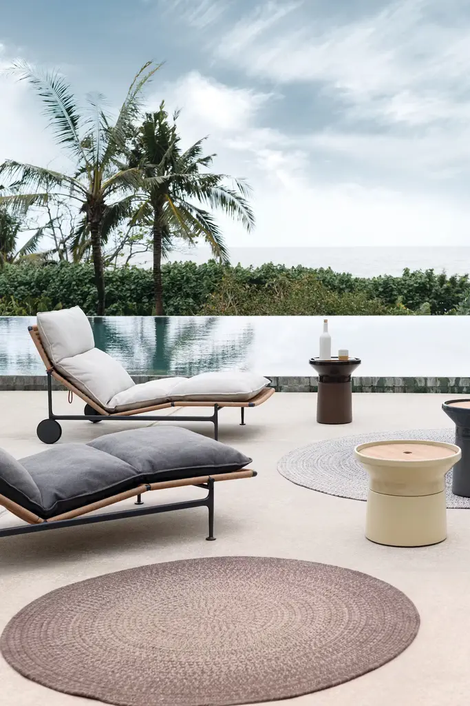 The striking silhouette of the Coso Side Table, designed by Henrik Pedersen (2021), is enhanced by the contrast between a rustic, natural ceramic surface and a deeply glazed one that captures and reflects light. The ceramic base is juxtaposed with a tabletop made of natural, buffed teak. If left outside, this teak will patina over time, changing to a soft, silvery grey. Made in Indonesia.