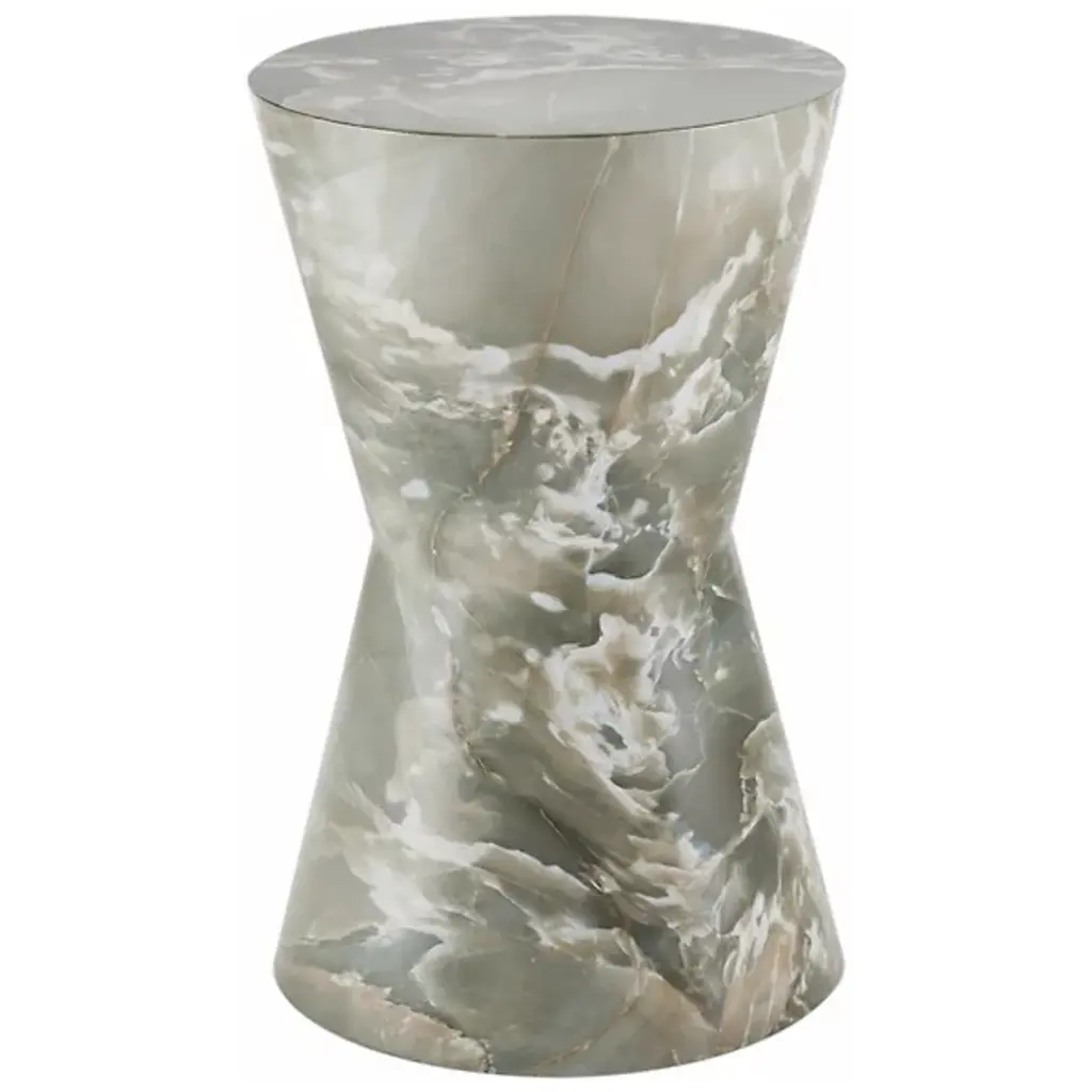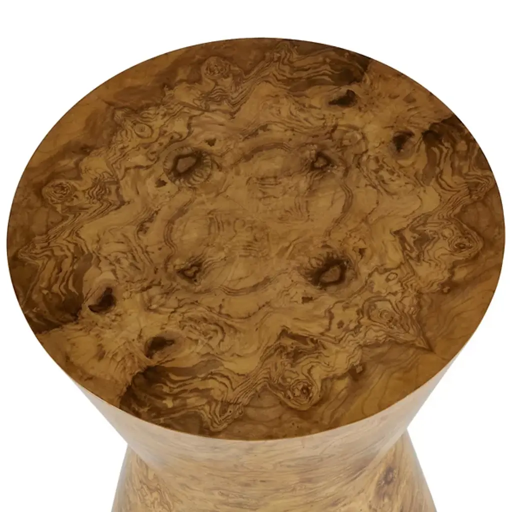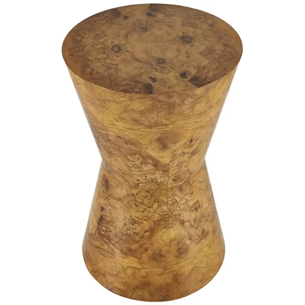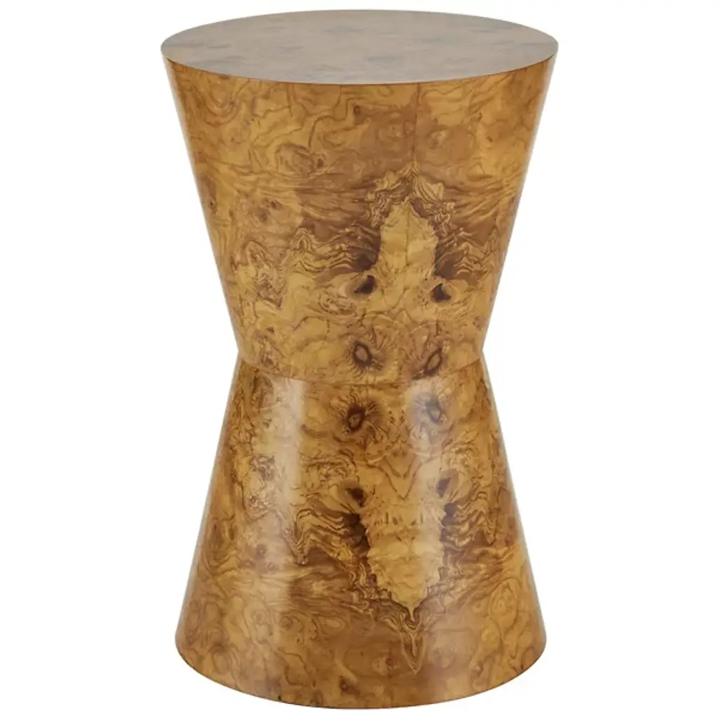The Costello Accent Table from Arteriors combines rustic modern and mid-century modern styles with a simple shape in a 70s-inspired design. Each table is made in Vietnam and features an iconic tapered hourglass silhouette with a glam veneer finish, book-matched at the top and base for a mirrored effect. The table itself rests on nylon glides to keep surfaces pristine, and each piece is unique due to finish variations, adding elegance and individuality to any space.