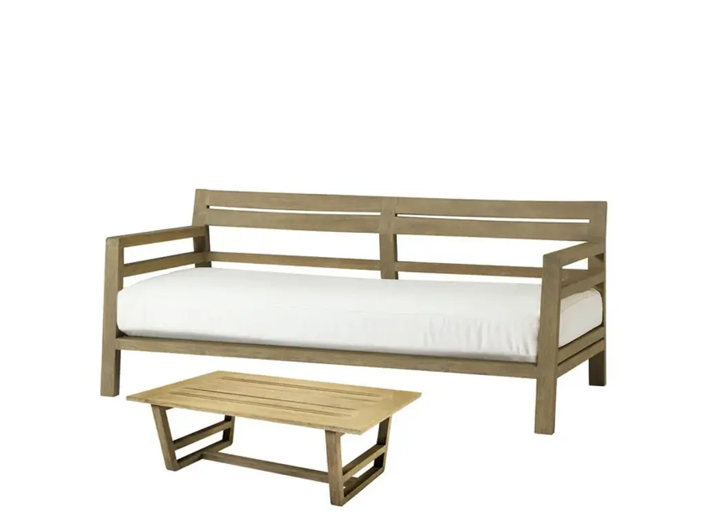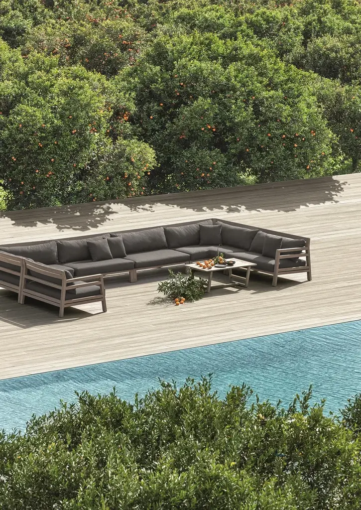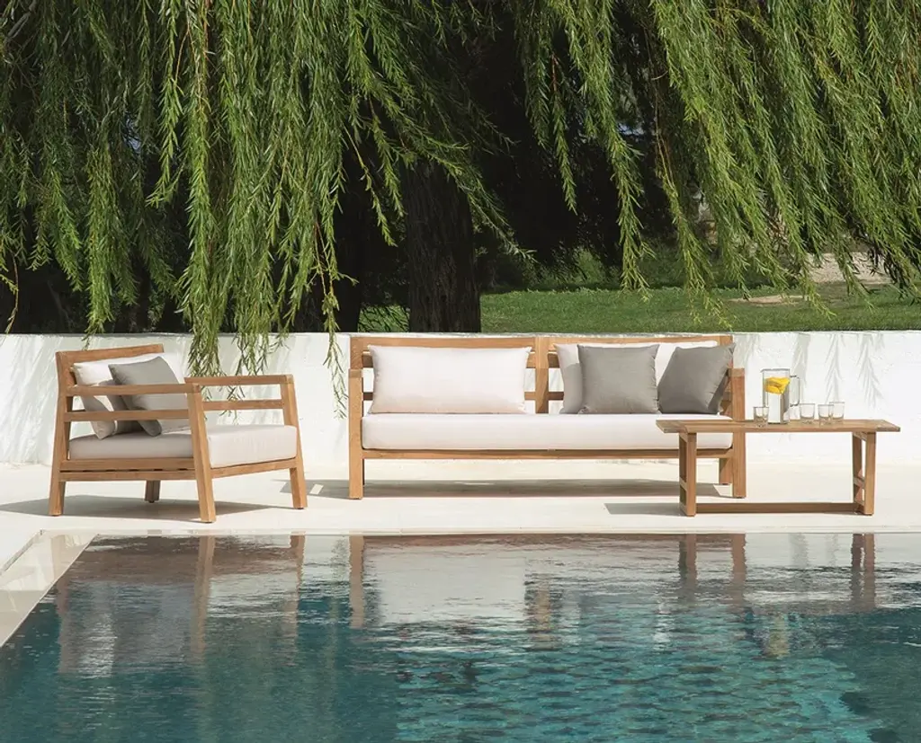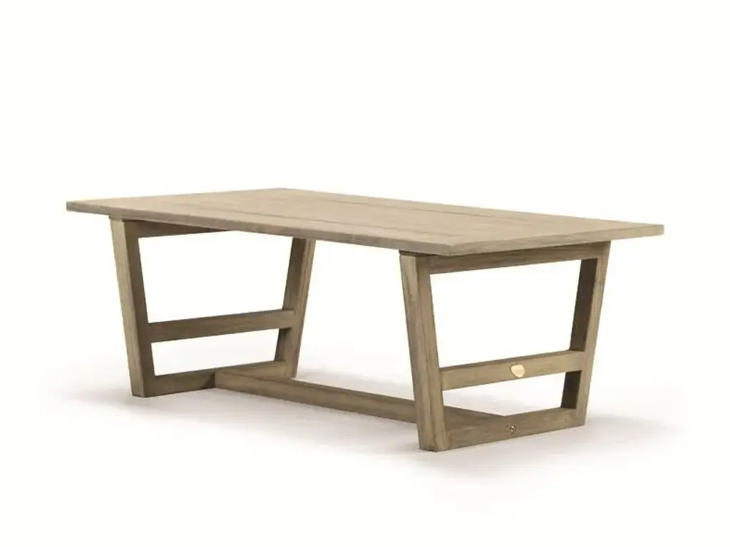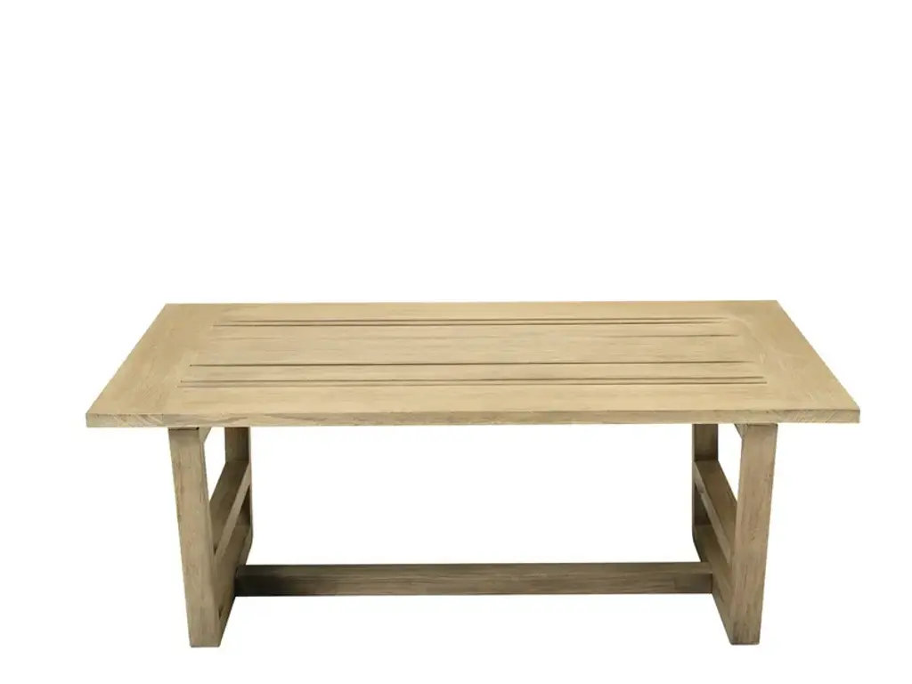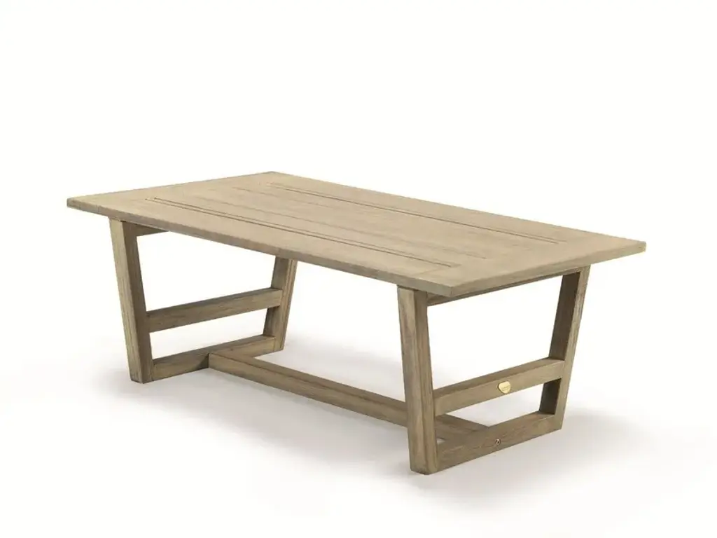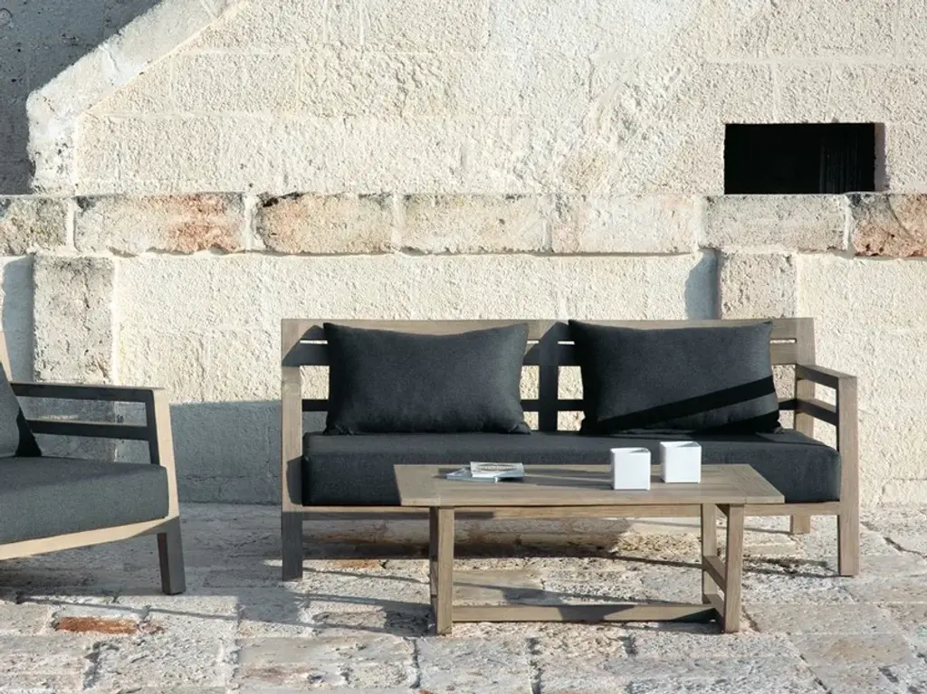 COSTES coffee table in pickled-finish or natual teak or painted mahogany.Available in two different sizes.Costes explores the multiple expressive possibilities of wood: from varnished mahogany to teak, available in natural or pickled finish with its fascinating “worn” look. A wide choice of elements, always with harmonious and essential lines: from sofas to tables, to the chairs and the sun lounger.