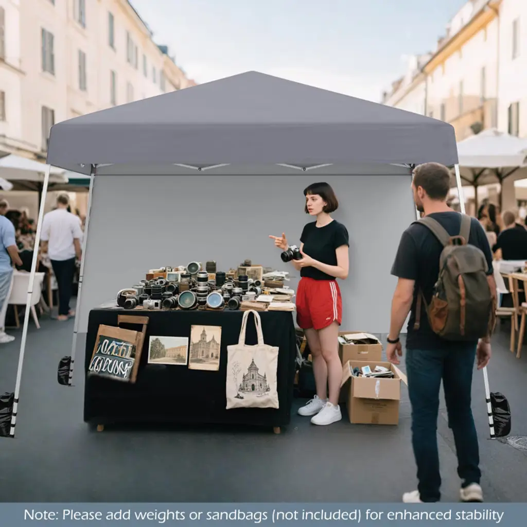 Experience the Ultimate Convenience and Protection! Our pop up canopy tent with an added sidewall measures 10 x 10 x 8.6 ft (L x W x H), perfect for various outdoor activities such as commercial events, camping, sports, festivals, tailgating, and backyard gatherings. Its innovative pop-up structure allows for swift setup without the need for tools, and when not in use, you can easily collapse it and store it in the portable backpack, allowing for easy movement. More than that, this tent features a robust oxford fabric top with a protective silver coating, ensuring excellent sun protection (Note: Please avoid using it in heavy rain or strong windy days). We also provide 4 ground stakes to secure 4 corners, complete with sturdy truss connections, making it reliable against weather challenges. Our canopy tent is your go-to solution for all your outdoor shelter requirements.FeaturesThe oxford canopy ensures fade resistance, drizzle resistance, and tear resistance The canopy with silver coating offers superior UPF50+ sun protection Equipped with a sidewall that boosts shade and ensures your privacy Equipped with a pop-up structure, allow you to assemble the tent quickly Features a backpack for easy transportation, take it anywhere you want Equipped with 4 metal stakes to firmly secure the tent on the ground Equipped with sturdy truss connections, provide strong support, not easy to deform The pinch-free buttons allow you to securely lock the canopy frame in place Ideal for various outdoor activities, markets, sporting events, picnics, beach outingsColor: Blue/White/Pink/Gray Material: Oxford Fabric, Metal Product Dimensions: 10 x 10 x 8. 6 ft (L x W x H) Ground Clearance: 6 ft Backpack Size: 3 x 0.6 x 0.6 ft (L x W x H) Net Weight: 22.5 lbs Package Includes: 1 x Canopy 1 x Frame 1 x Backpack 4 x Ground Stakes 1 x User’s Manual