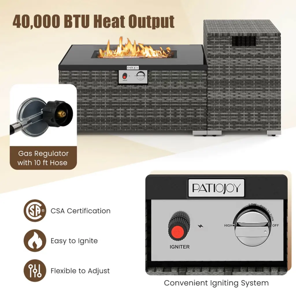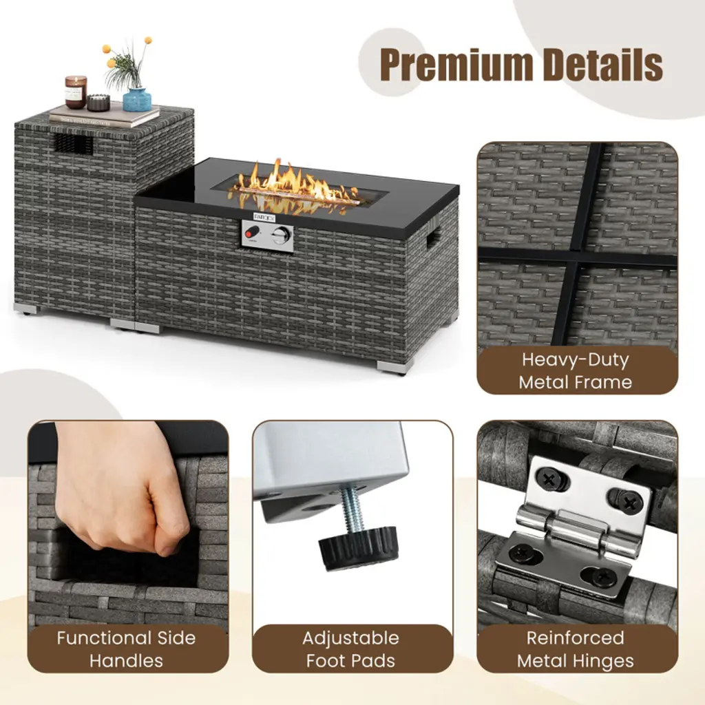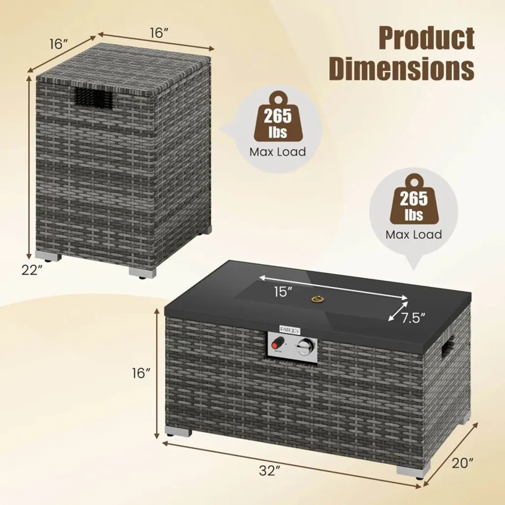 Elevate your outdoor gatherings with this premium 2-piece rattan fire pit Set, blending functionality with style. The main body of both the fire pit and tank cover uses sunproof PE rattan for long-lasting elegance. And the heat-resistant black tempered glass tabletop and robust metal frame ensure high stability. Enjoy the warmth and ambiance with a 40,000 BTU output, protected by a CSA-certified ignition system. The 2-in-1 multifunctional design allows you to use the fire pit to heat for warmth or place drinks or snacks. The set is also complemented by a multi-use propane tank cover that doubles as a side table, and a protective cover to keep your fire pit pristine. Ideal for any backyard, patio, or poolside, this fire pit set with premium details promises not just utility but a touch of elegance to your outdoor relaxing places.Features2-in-1 fire pit also functions as a coffee table with lid covered Anti-fading PE rattan for long-lasting beauty Black tempered glass top for more elegance and simple cleaning Robust metal frame with adjustable foot pads for high stability Reinforced metal hinges for safe open and close of tank cover Functional side handles for hassle-free movement 40,000 BTU heat output for endless warmness CSA certification for high-level safety Convenient igniting system makes it easy to ignite and flexible to adjust Comes with a tank cover for 20 lbs gas tank (not included) Tank cover is also perfect as a side table when closed Equipped with a gas regulator with 10 ft hose Protective cover for longer service life Please avoid rain exposure for prolonged service life Assembly is requiredColor of PE Rattan: Brown/Black/Gray Material: PE Rattan, Metal, Tempered Glass, PVC Dimension of Fire Pit Table: 32" x 20" x 16" (L x W x H) Dimension of Tank Holder: 16" x 16" x 22" (L x W x H) Net Weight: 53 lbs Weight Capacity of Fire Pit Table: 265 lbs Weight Capacity of Tank Holder: 265 lbs Package Includes: 1 x Fire Pit Table 1 x Tank Holder 1 x PVC Cover 1 x Bag of Lava Rocks 1 x Instruction