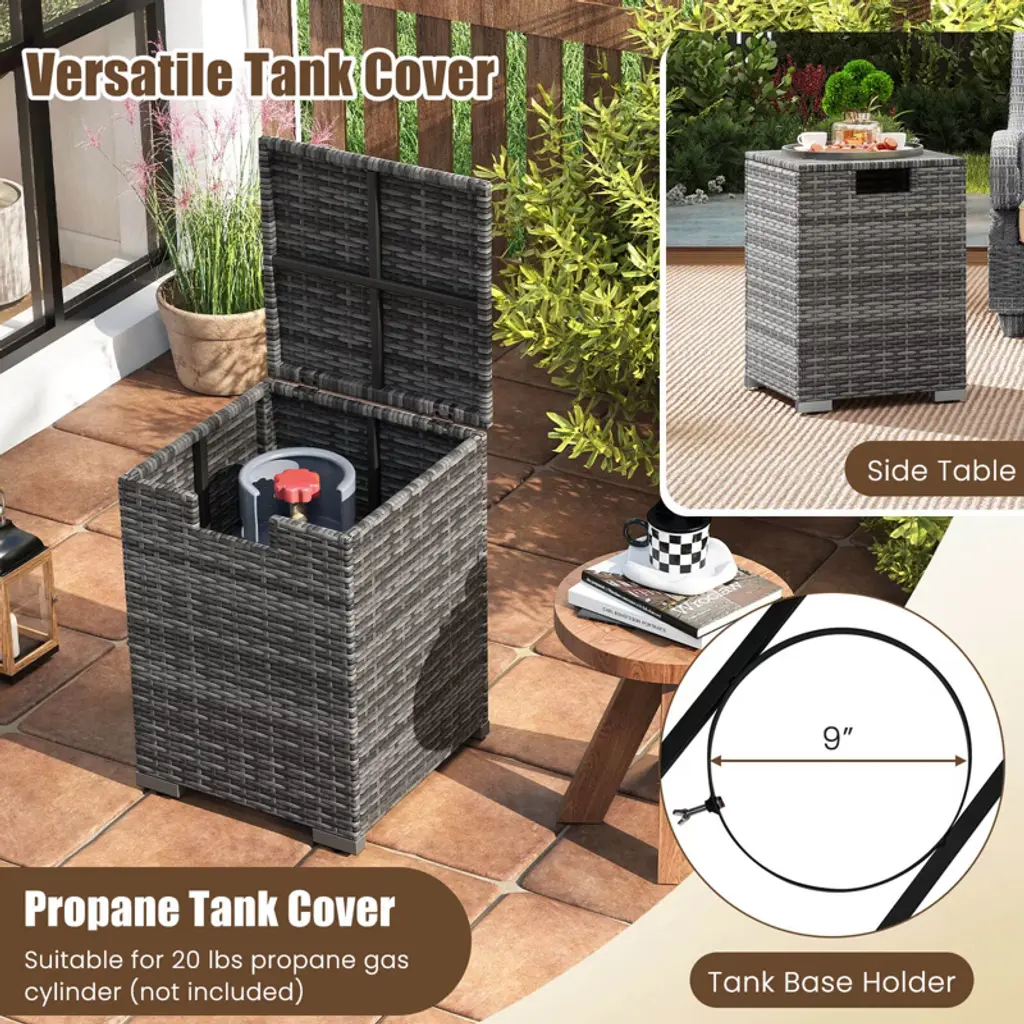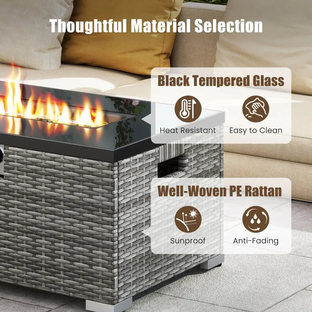 Costway 2 Pcs Outdoor Rattan Fire Table Set With Tank Cover Tempered Glass Tabletop Gray