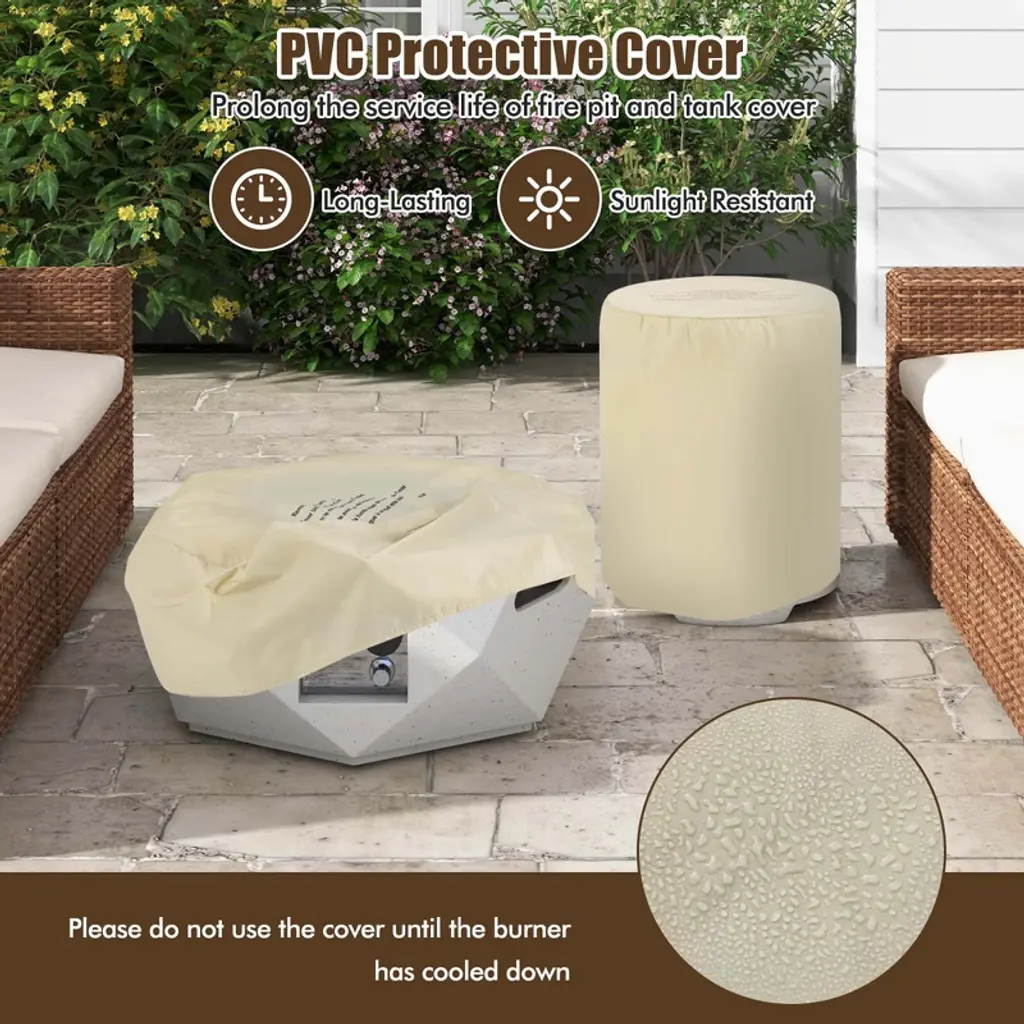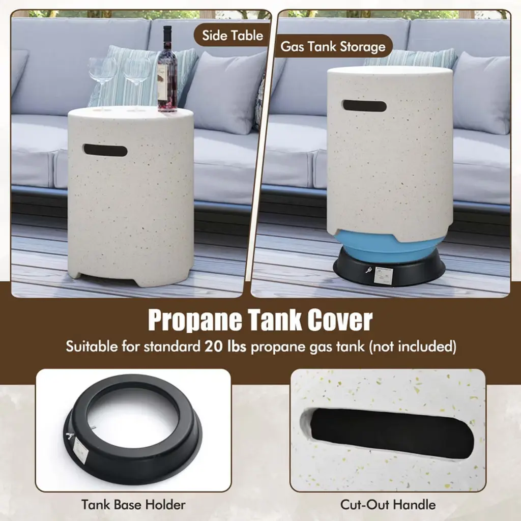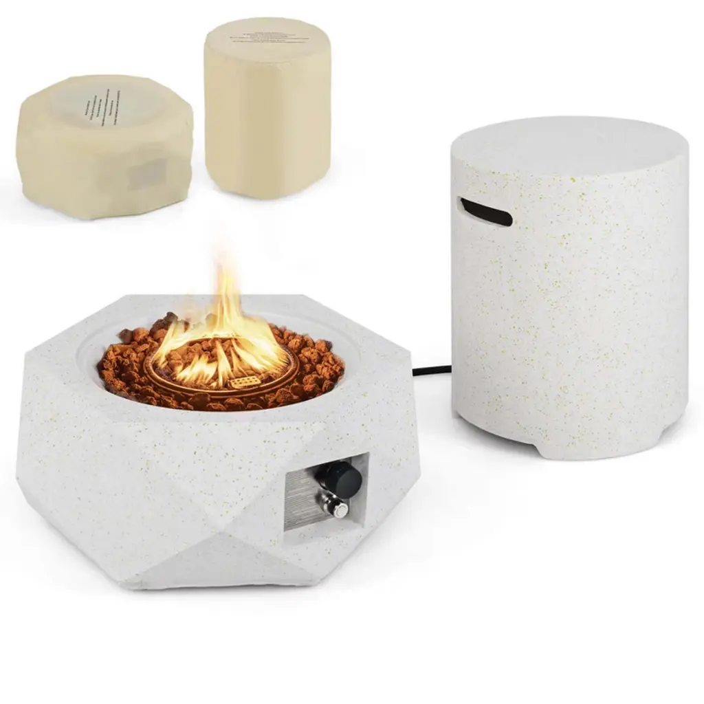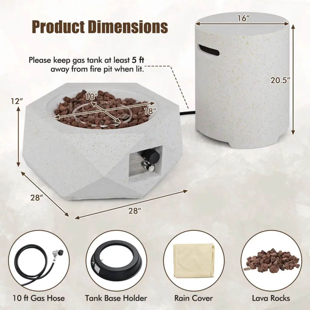 Upgrade your outdoor gatherings with this high-performance 40,000 BTU fire pit table set. For ignition, you just need to push and turn control knob counterclockwise to Low, keep holding the knob and press the igniter button repeatedly to light burner. With stainless steel burner and decorative lava rocks, the fire pit table delivers not only impressive heat output but also an enchanting atmosphere. The robust terrazzo construction makes the whole set withstand long-time use. Moreover, the versatile tank holder doubles as a handy side table for stability. The set includes protective PVC covers that shields against sunlight, ensuring long-lasting usability and freshness. Make your backyard the go-to place for unforgettable evenings with this 2 piece outdoor propane fire pit table set.FeaturesWhen the fire does not ignite, try fanning the gas around the burner by hand to ensure adequate contact with oxygen Please do not completely cover the burner with lava rocks when igniting Please keep lava rocks always dry to prevent splashes when using Please do not use the cover until the burner has cooled down Easy to ignite and adjust the flame with the control panel Certificated by CSA for more reliability 40,000 BTU heat output offers endless warmness Gas tank holder also functions as a side table Cut-out handles make the tank holder easy to move Tank seat suits for 20 lbs propane gas tank (not included) Adjustable footpads for higher stability Mainly made of terrazzo for long-lasting use Comes with rain covers for longer service lifeColor: White Material: Terrazzo, Metal, Stainless Steel, PVC Dimension of Fire Pit Table: 28" x 28" x 12" (L x W x H) Dimension of Burning Area: 18" x 18" (L x W) Dimension of Tank Holder: 16" x 16" x 20.5" (L x W x H) Length of Gas Hose: 10 ft Suitable Gas Tank: 20 lbs (Not Included) Heat Output: 40,000 BTU Net Weight of Fire Pit Table: 56 lbs Net Weight of Tank Holder: 31.5 lbs Package Includes: 1 x Fire Pit Table 1 x Tank Holder 1 x Bag of Lava Rocks 1 x Tank Seat 2 x Protective Covers 1 x Instruction
