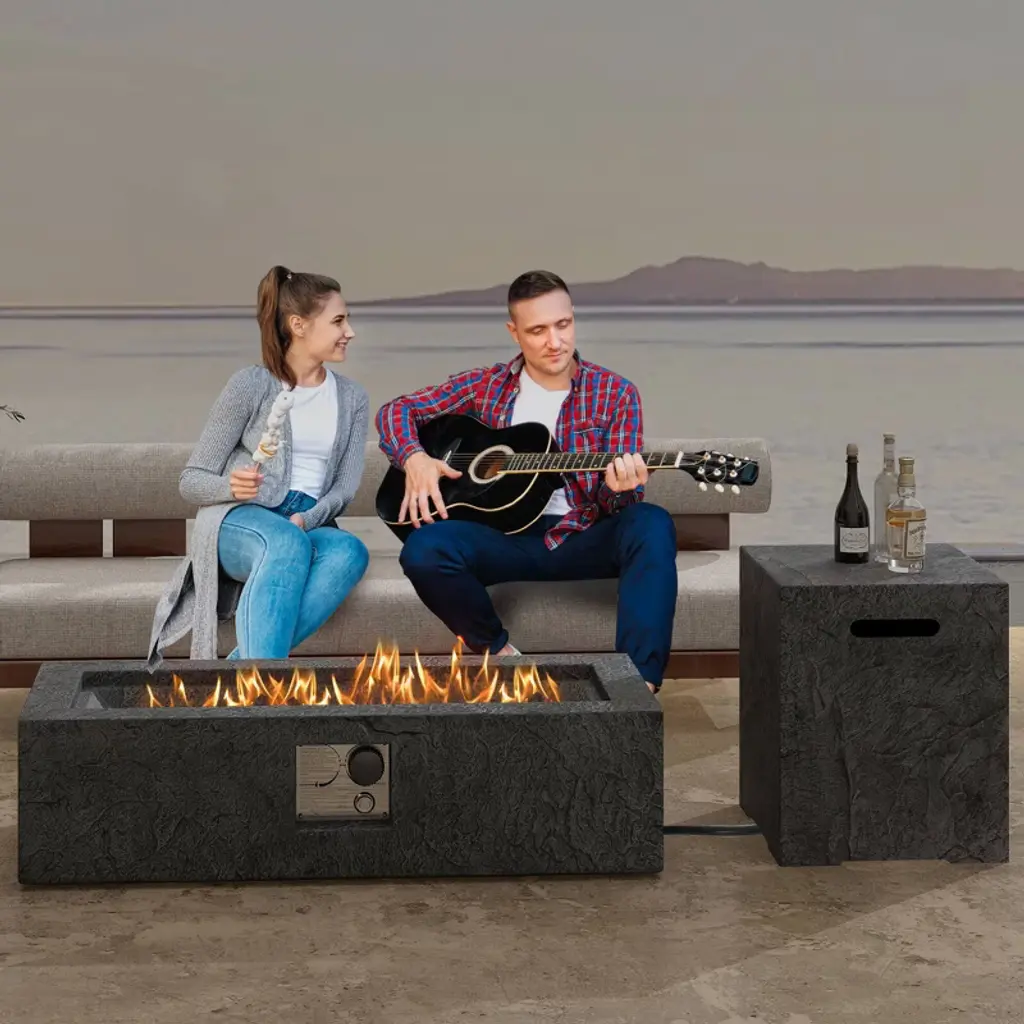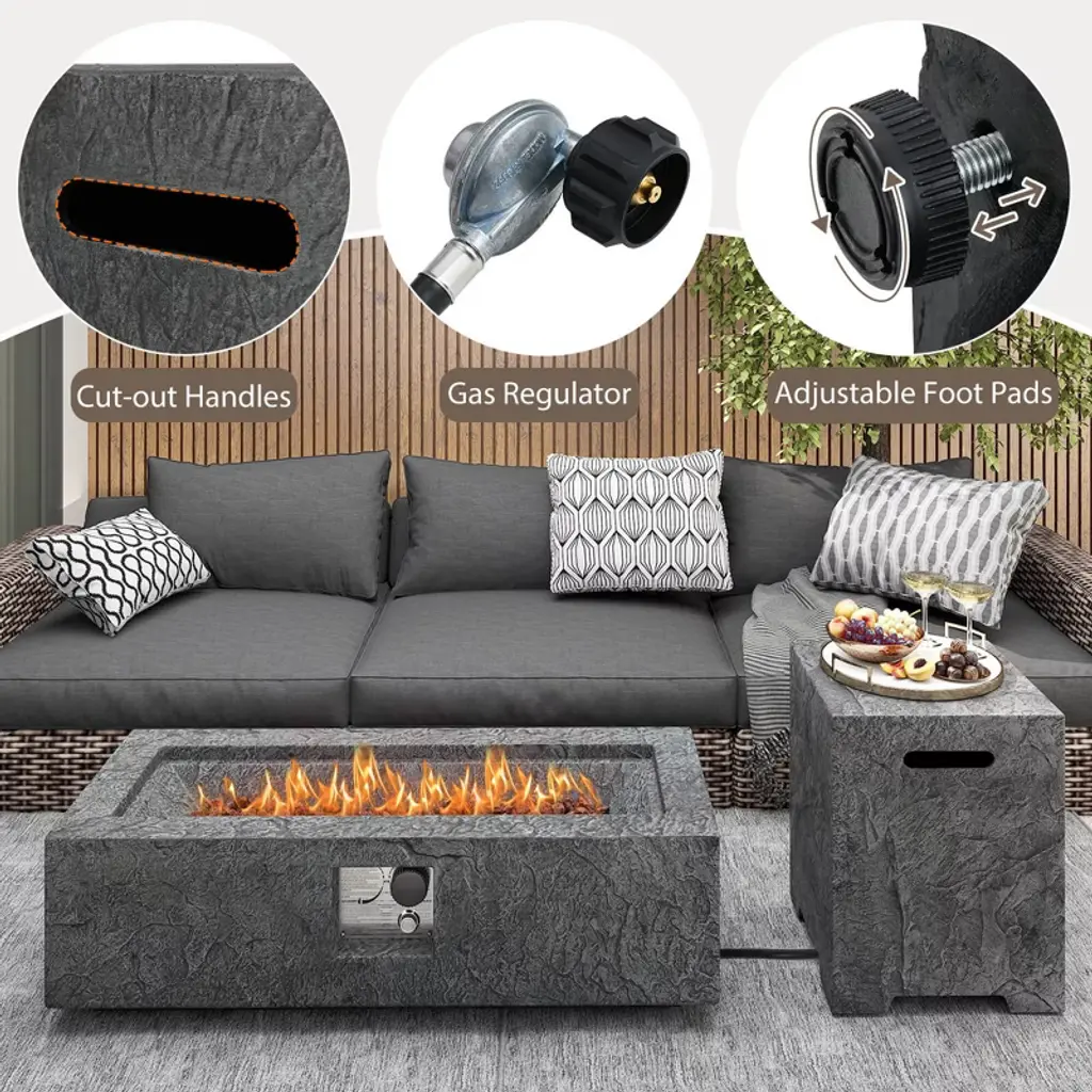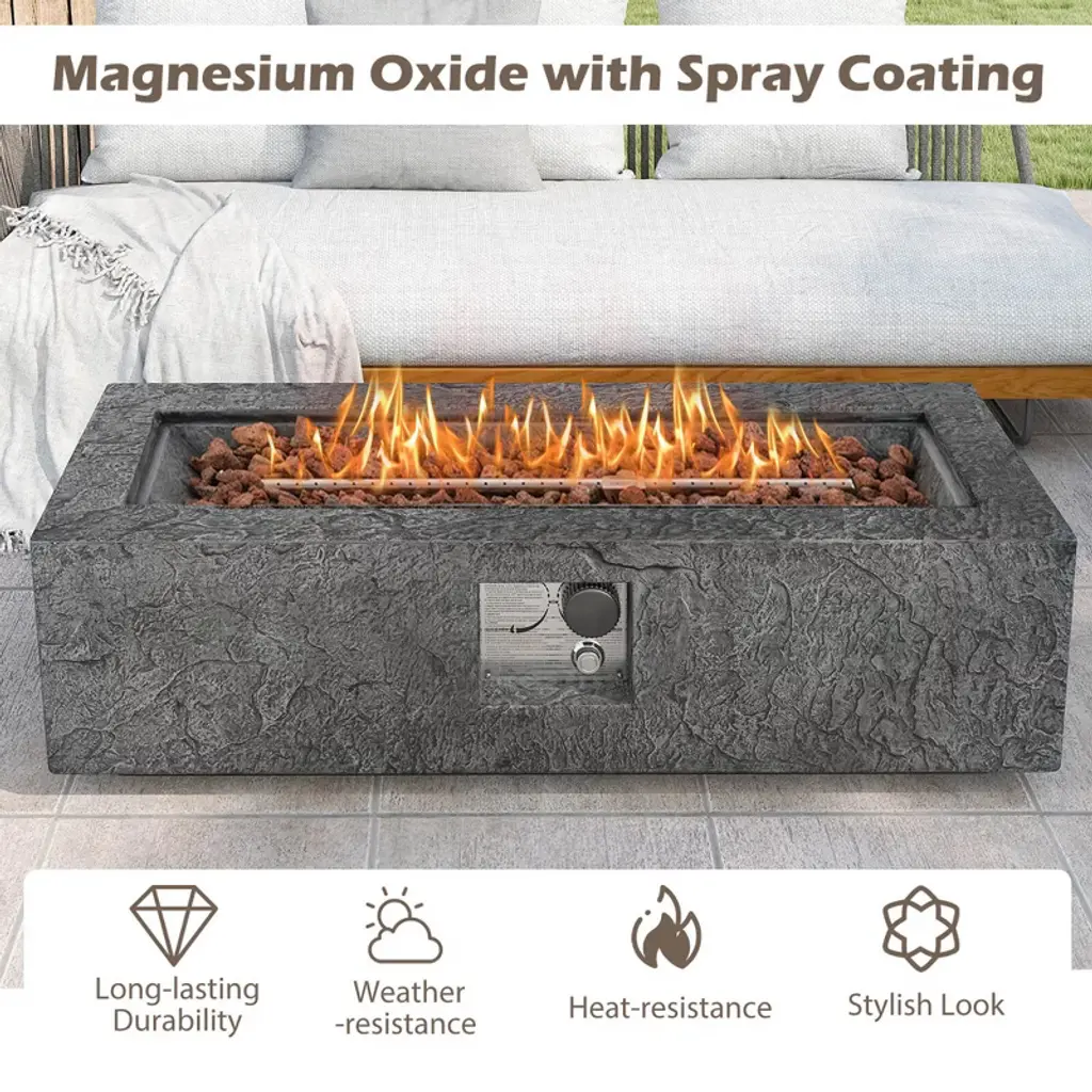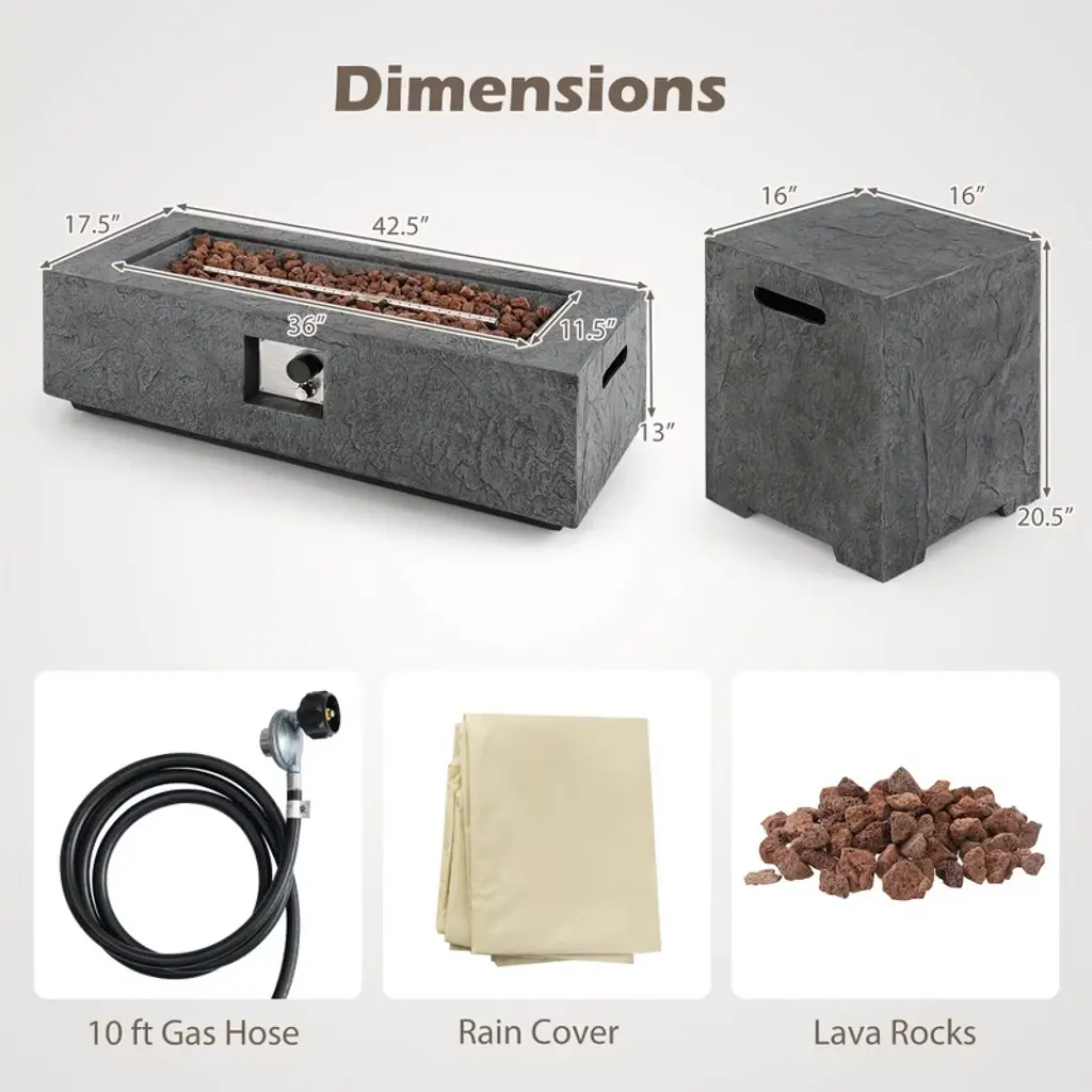 Upgrade your outdoor gatherings with this high-performance 50,000 BTU fire pit table set. For ignition, you just need to push and turn control knob counterclockwise to Low, keep holding the knob and press the igniter button repeatedly to light burner. With stainless steel burner and decorative lava rocks, the fire pit table delivers not only impressive heat output but also an enchanting atmosphere. The robust magnesium oxide construction makes the whole set withstand long-time use. Moreover, the versatile tank holder doubles as a handy side table with adjustable footpads for stability. The set includes protective PVC covers that shields against water and sun, ensuring long-lasting usability and freshness. Make your backyard the go-to place for unforgettable evenings with this 2 piece outdoor propane fire pit table set.FeaturesWhen the fire does not ignite, try fanning the gas around the burner by hand to ensure adequate contact with oxygen Please do not completely cover the burner with lava rocks when igniting Please keep lava rocks always dry to prevent splashes when using Please do not use the cover until the burner has cooled down Easy to ignite and adjust the flame with the control panel Certificated by CSA for more reliability 50,000 BTU heat output offers endless warmness Gas tank holder also functions as a side table Cut-out handles make the tank holder easy to move Tank seat suits for 20 lbs propane gas tank (not included) Adjustable footpads for higher stability Mainly made of magnesium oxide for long-lasting use Comes with rain covers for longer service lifeColor: Gray Material: Magnesium Oxide, Metal, Stainless Steel, PVC Dimension of Fire Pit Table: 42.5" x 17.5" x 13" (L x W x H) Dimension of Burning Area: 36" x 11.5" (L x W) Dimension of Tank Holder: 16" x 16" x 20.5" (L x W x H) Length of Gas Hose: 10 ft Suitable Gas Tank: 20 lbs (Not Included) Heat Output: 50,000 BTU Net Weight of Fire Pit Table: 61.5 lbs Net Weight of Tank Holder: 26 lbs Package Includes: 1 x Fire Pit Table 1 x Tank Holder 1 x Bag of Lava Rocks 1 x Tank Seat 2 x Protective Covers 1 x Instruction