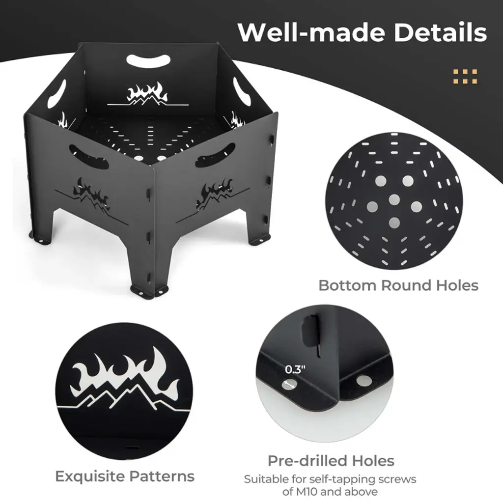Embrace the warmth and ambiance this heavy duty fire pit provides! Convenience is key, which is why our camping fire pit features a collapsible design and includes a carrying bag for easy storage and transportation. Not only is it practical, but it’s also built to withstand the test of time thanks to the rustproof and sturdy carbon steel. What’s more, efficient wood burning is made possible by the strategically placed bottom holes that facilitate optimal air circulation. In addition to the wood, this fire pit also accepts other fuels, such as pellets and charcoals. FeaturesSpend less time struggling with quick disassembly The storage bag ensures your fire pit remains protected Exquisite patterns and bottom round holes for better air circulation Selected carbon steel for rustproof and stable performance Add additional stability with 8 mm pre-drilled holes Suitable for self-tapping screws of M10 and above (not included) Charcoals, firewood and pellets for optional fuels Suitable for camping, bonfire, backyard and other places The fire motif creates a visually appealing centerpiece Convenient handles and plug-in design for well-made detailsColor: Black Material: Carbon Steel, Oxford Cloth Dimension: 19" x 18.5" x 12" (L x W x H) Dimension of Carrying Bag: 21" x 20" x 3" (L x W x Thickness) Net Weight: 10 lbs Package Includes: 1 x Fire Pit 1 x Carrying Bag 1 x Instruction