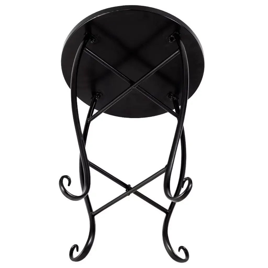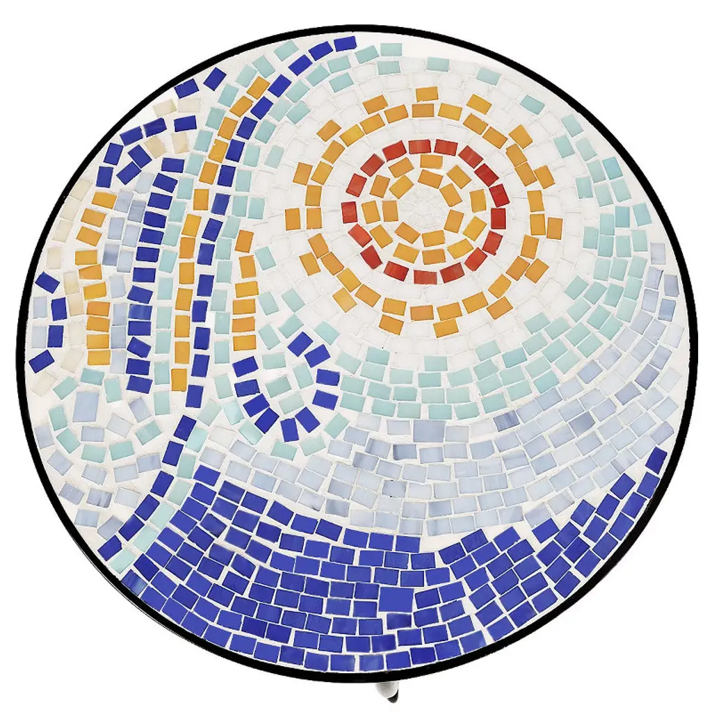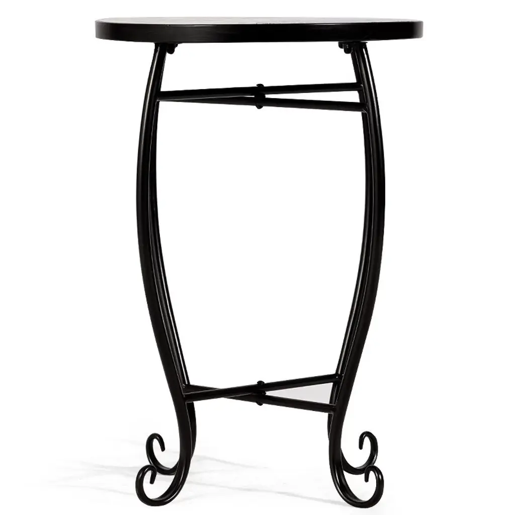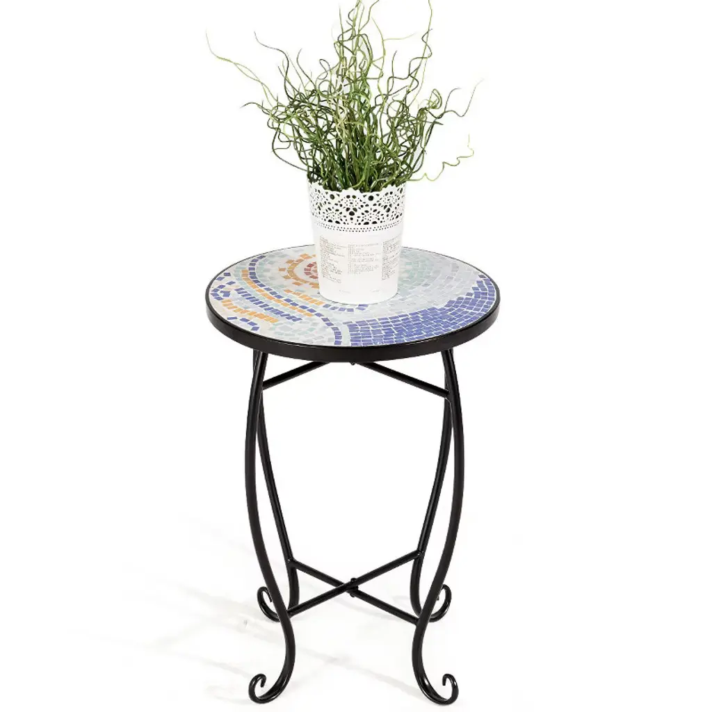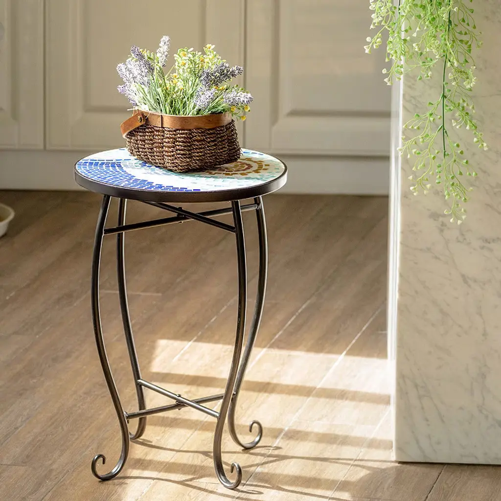 Are you looking for a outdoor accent table for your plants ? This round accent table would be a good choice for it .It feature an inlaid glass mosaic top with a blue ocean .The frame and curvaceous legs are constructed of black finish steel that will withstand the elements. It can be as a porch or patio piece, plant stand, indoor accent, or bistro table. Perfect spot for drinks, books, or plants. A masterpiece to add charms to your living room, bedroom, kitchen, patio and garden. Don't hesitate to buy it nowFeaturesLightweight construction Black finish metal construction with graceful curved legs Features round glass top with deep cobalt blue color scheme tile mosaic inlay topPerfect spot for drinks, books, or plantsCoated metal frame for rustproofSuitable for both indoor and outdoor usageAssembly requirementMaterial: Steel pipe + colored glass + cement sandproduct size:14''X 14''X 21''(L x W x H)Weight:13lbsWeight capacity:50lbsPackage includes:1 X Plant Stand
