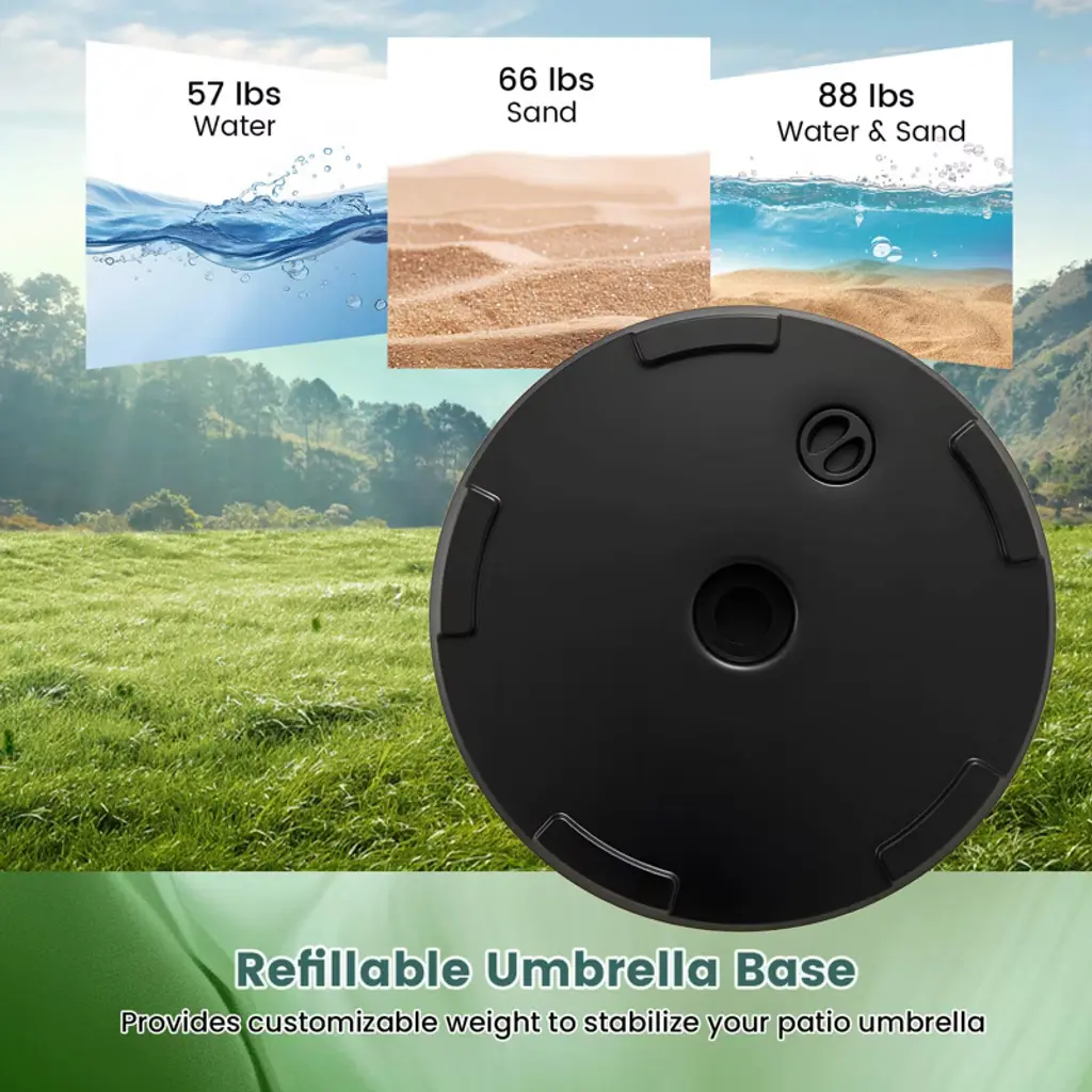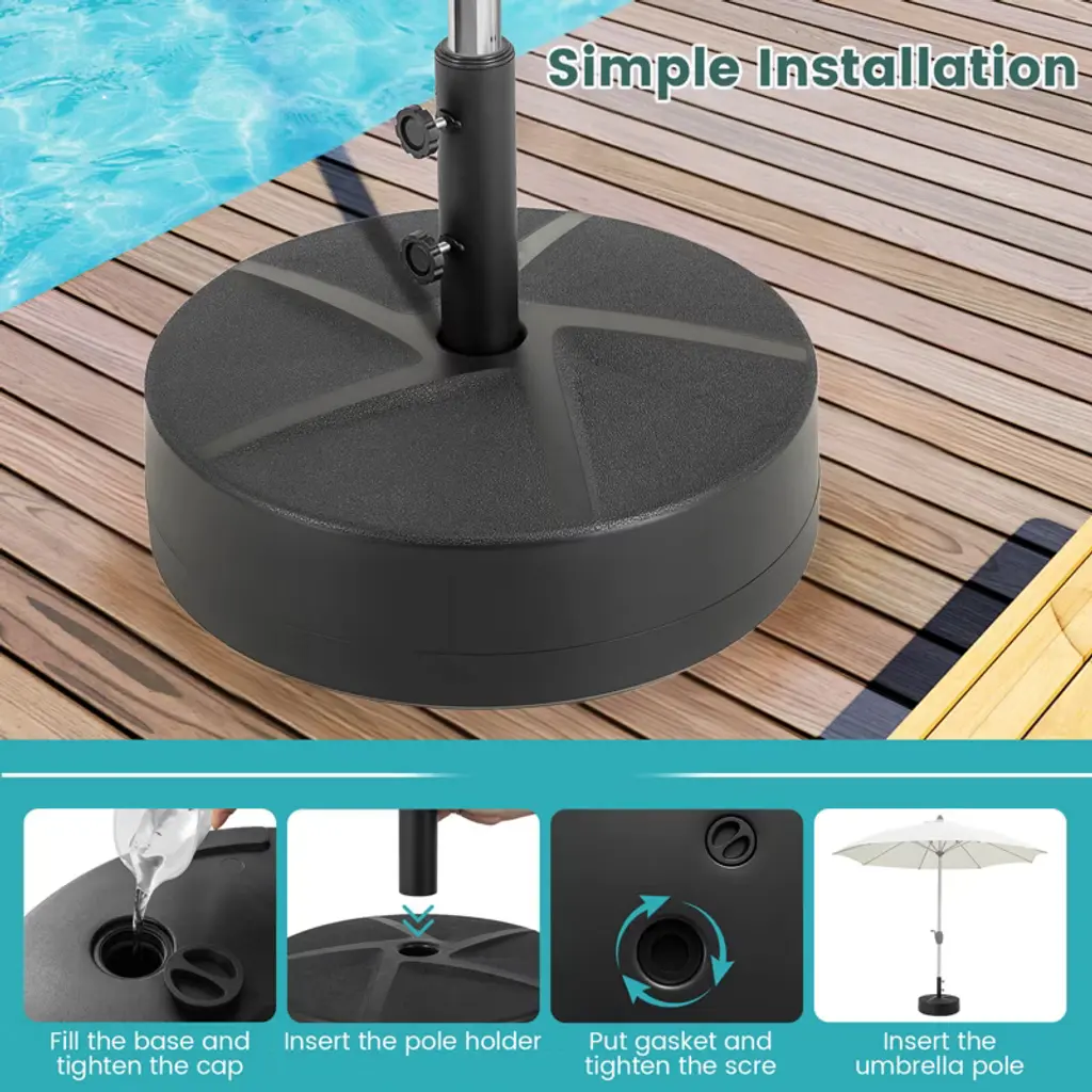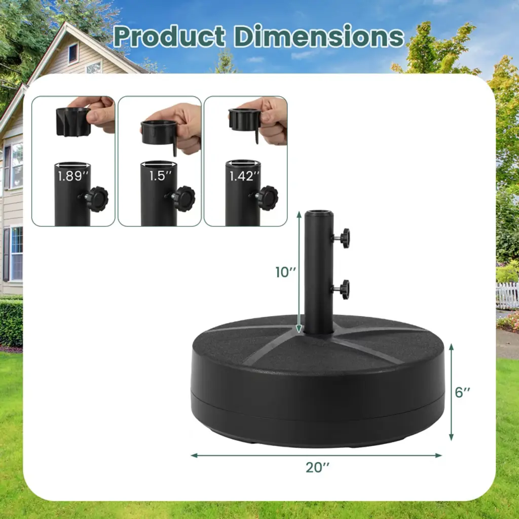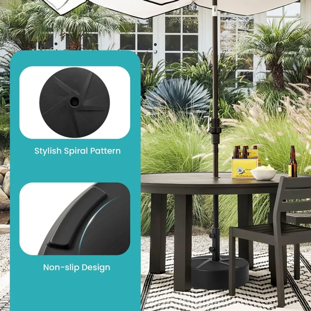 A secure solution to stabilize your round umbrella base. To keep your umbrella stable, the heavy-duty umbrella base can be filled with either 57 lbs of water, 66 lbs of sand, or 88 lbs of wet sand, making it suitable for 6-10 ft patio umbrellas. Furthermore, the patio umbrella base is equipped with 3 adapters, making it compatible with patio umbrellas featuring pole diameters of 1.89"/1.5"/1.42". Additionally, there are 2 turning knobs to ensure a secure fit of the umbrella pole. Constructed from high quality HDPE material, the umbrella stand offers exceptional durability. Also, the fillable base is designed for swift and effortless installation. FeaturesRefillable umbrella base provides customizable weight to stabilize your patio umbrellas Crafted with waterproof, crack-resistant HDPE material Equipped with 2 turning knobs for snug fit 3 umbrella hole ring sizes perfectly fit umbrellas with pole diameters of 1.42"/1.5"/1.89", 48/38/36 mm Fits 6/7.5/10/12 ft patio umbrellas Easy to assemble without any additional tools Stylish spiral pattern brings charm to your outdoor space Featuring non-slip design to keep the umbrella stand in place Note: The umbrella is not included Color: Black Material: HDPE, Metal Product Dimensions: 20" x 16" (Dia. x H) Fill Capacity of the Water: 57 lbs Fill Capacity of the Sand: 66 lbs Fill Capacity of the Water & Sand: 88 lbs Suitable Umbrella Pole Diameters: 1.89"/1.5"/1.42" Net Weight: 5.5 lbs Package Includes: 1 x Patio Umbrella Base 3 x Adapters 1 x User’s Manual