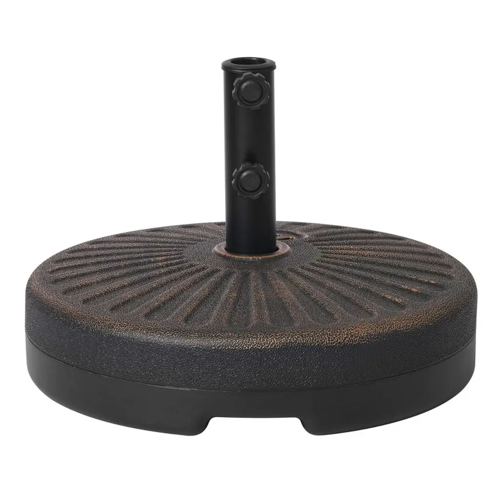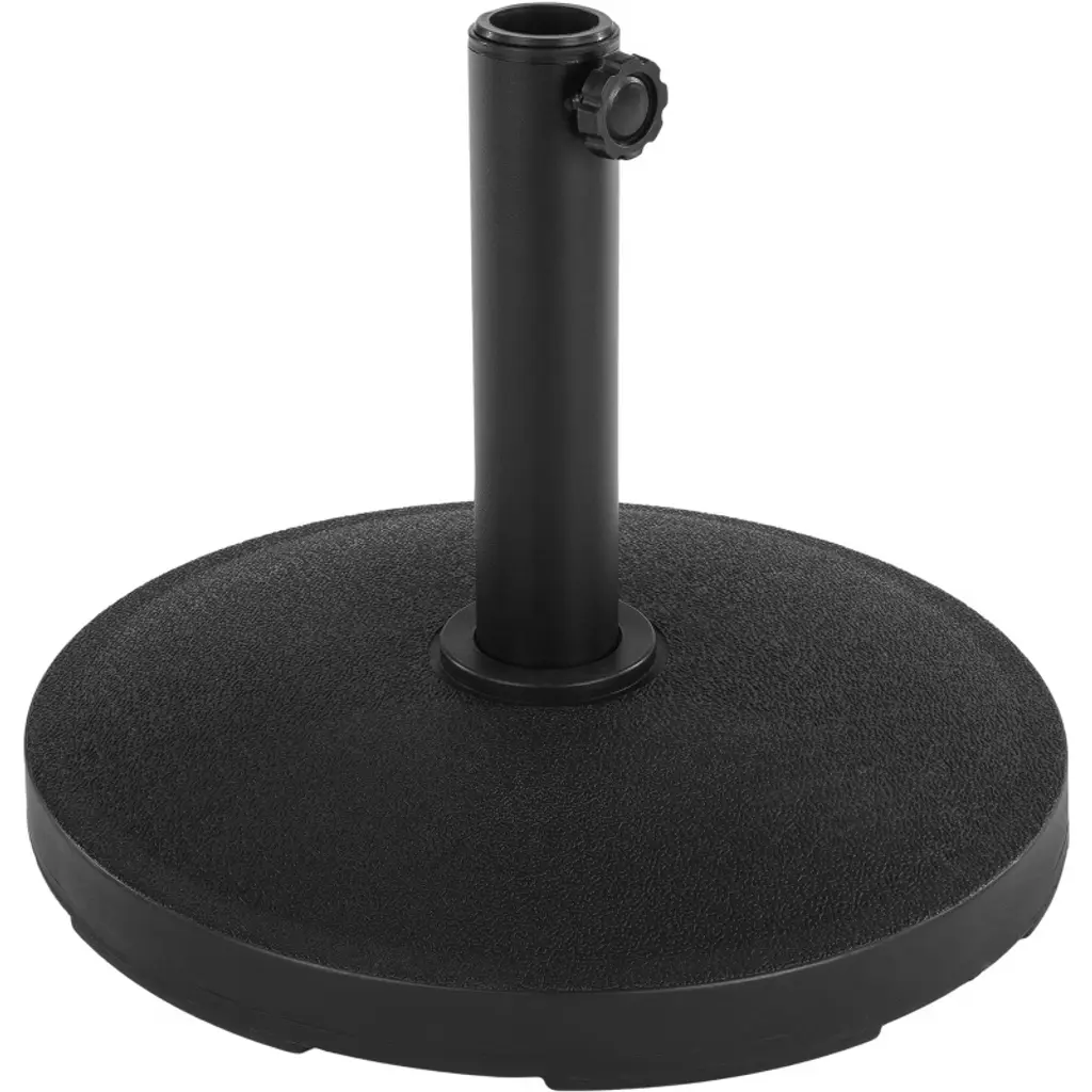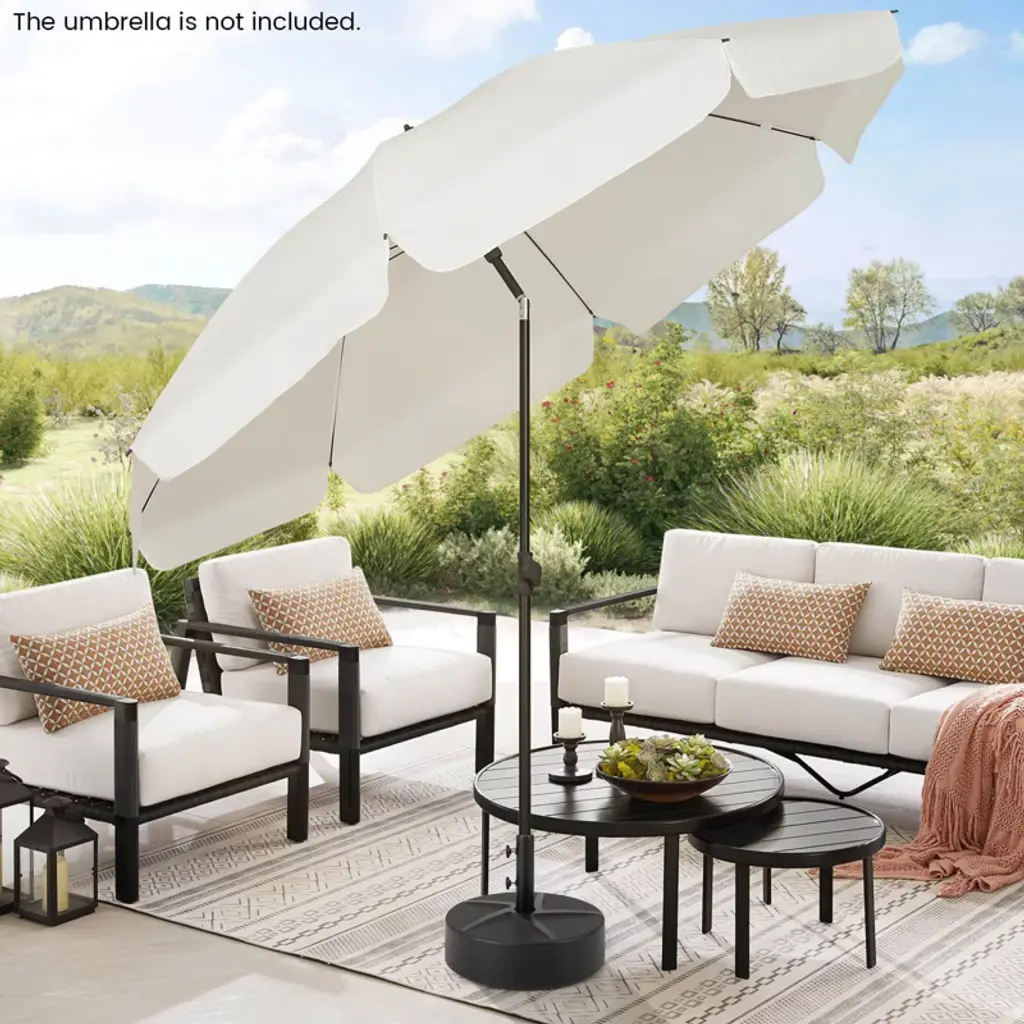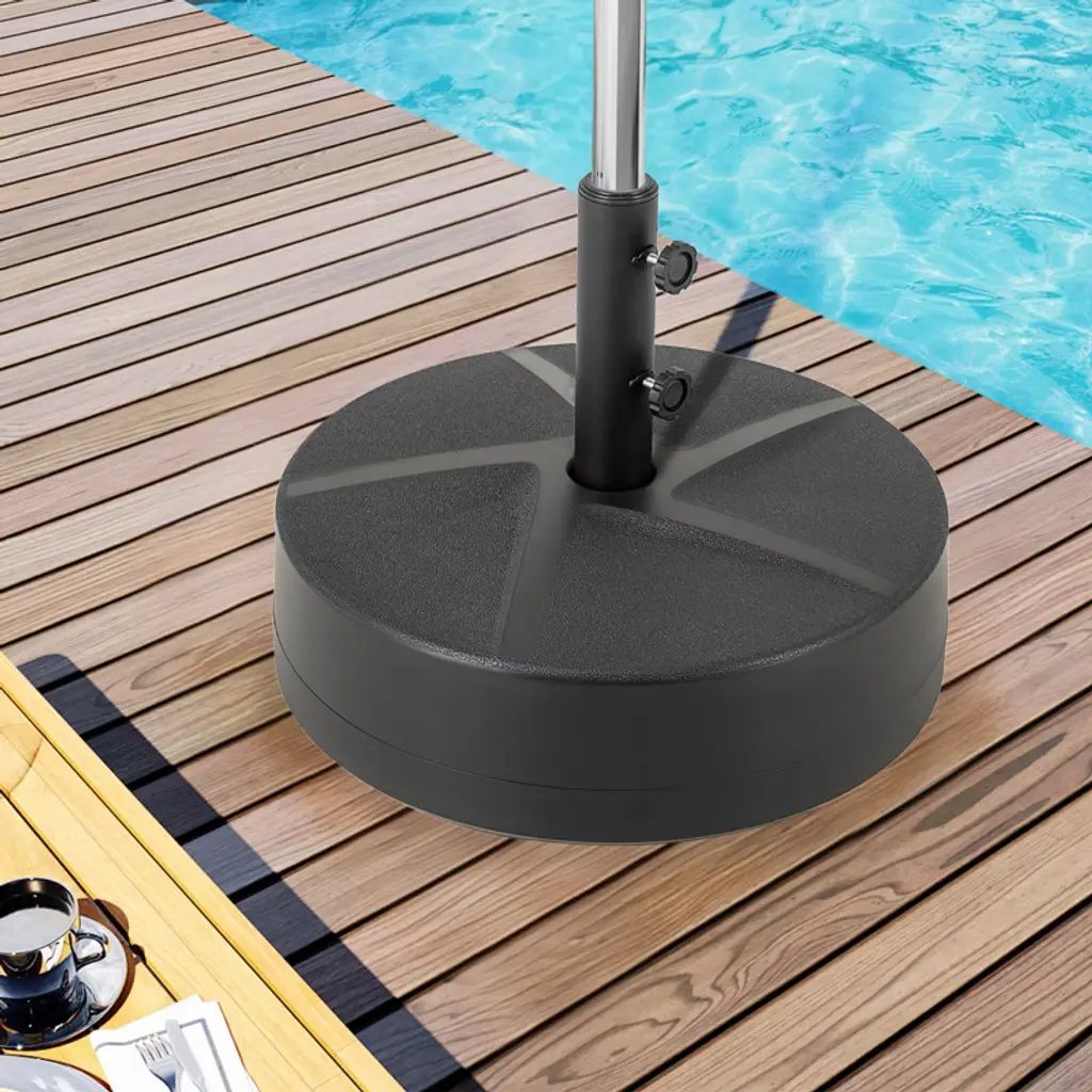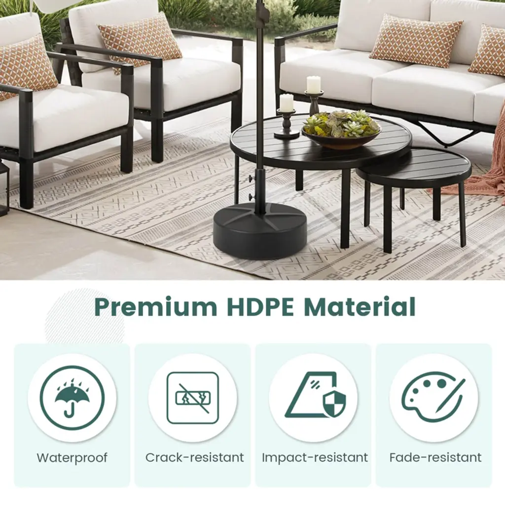 A secure solution to stabilize your round umbrella base. To keep your umbrella stable, the heavy-duty umbrella base can be filled with either 57 lbs of water, 66 lbs of sand, or 88 lbs of wet sand, making it suitable for 6-10 ft patio umbrellas. Furthermore, the patio umbrella base is equipped with 3 adapters, making it compatible with patio umbrellas featuring pole diameters of 1.89"/1.5"/1.42". Additionally, there are 2 turning knobs to ensure a secure fit of the umbrella pole. Constructed from high quality HDPE material, the umbrella stand offers exceptional durability. Also, the fillable base is designed for swift and effortless installation. FeaturesRefillable umbrella base provides customizable weight to stabilize your patio umbrellas Crafted with waterproof, crack-resistant HDPE material Equipped with 2 turning knobs for snug fit 3 umbrella hole ring sizes perfectly fit umbrellas with pole diameters of 1.42"/1.5"/1.89", 48/38/36 mm Fits 6/7.5/10/12 ft patio umbrellas Easy to assemble without any additional tools Stylish spiral pattern brings charm to your outdoor space Featuring non-slip design to keep the umbrella stand in place Note: The umbrella is not included Color: Black Material: HDPE, Metal Product Dimensions: 20" x 16" (Dia. x H) Fill Capacity of the Water: 57 lbs Fill Capacity of the Sand: 66 lbs Fill Capacity of the Water & Sand: 88 lbs Suitable Umbrella Pole Diameters: 1.89"/1.5"/1.42" Net Weight: 5.5 lbs Package Includes: 1 x Patio Umbrella Base 3 x Adapters 1 x User’s Manual