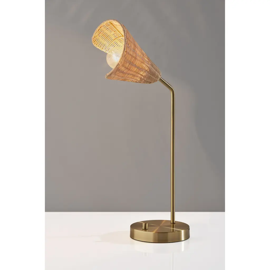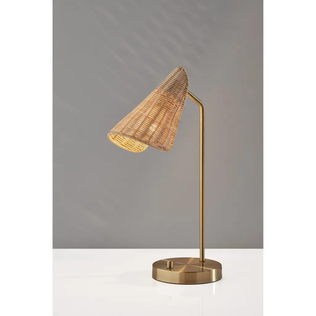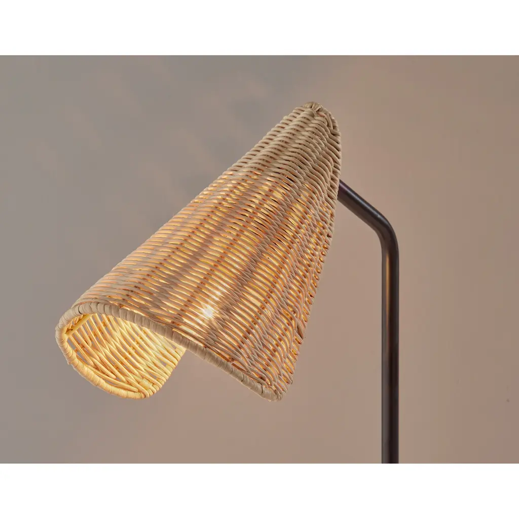 Featuring a blend of natural and contemporary elements and style lines, the Cove desk lamp adds a distinctive look to desks, nightstands, and end tables. The round black metal base and matching thin stem in clean lines complement contemporary or modern chic décor. Topping the lamp is a large hood-shaped shade fashioned of natural rattan material for a unique look. The base of the shade includes an articulation point, allowing you to rotate the shade up or down and side to side to direct the light wherever it's needed. A rotary switch located on the base allows you to easily turn the 40W bulb on or off, while the lamp is powered by a 5' black cord. For mid-century modern appeal, the Cove desk lamp is also available with an antique brass finish. Complete your space's décor with the coordinating Cove floor lamp and tree lamp. Features: Black or Antique Brass Finish Lamp Measures 20.25-inchH. x 6.5-inchW. x 13-inch Max.D Natural RattanShade with screw down uno fitter Shades each measures 5.5-inchBD X 9.25-inchH 40W E26 Bulb Not Included Rotary Switch on Base Base is Round 6.5-inch Dia. x 1-inchH Base is Dome 7.25-inch Dia. x 1.5-inchH 60-inch Black cord