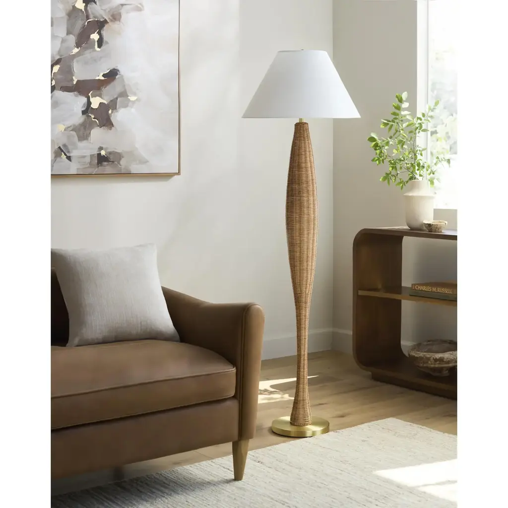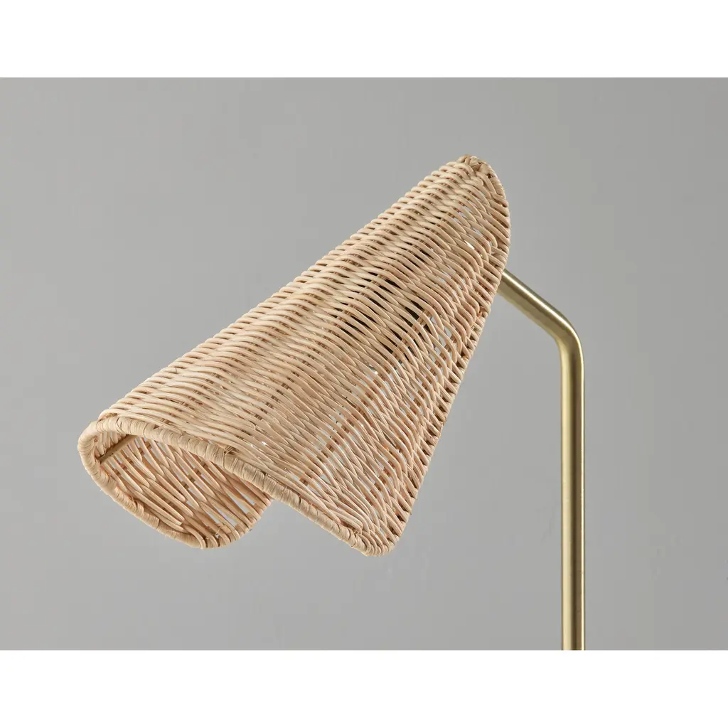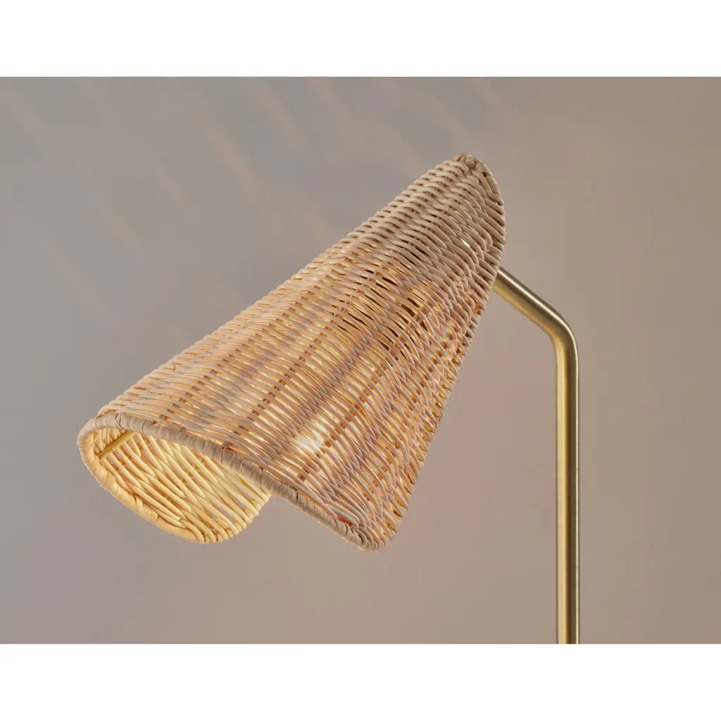 Featuring a blend of natural and contemporary elements and style lines, the Cove desk lamp adds a distinctive look to desks, nightstands, and end tables. The round black metal base and matching thin stem in clean lines complement contemporary or modern chic décor. Topping the lamp is a large hood-shaped shade fashioned of natural rattan material for a unique look. The base of the shade includes an articulation point, allowing you to rotate the shade up or down and side to side to direct the light wherever it's needed. A rotary switch located on the base allows you to easily turn the 40W bulb on or off, while the lamp is powered by a 5' black cord. For mid-century modern appeal, the Cove desk lamp is also available with an antique brass finish. Complete your space's décor with the coordinating Cove floor lamp and tree lamp. Features: Black or Antique Brass Finish Lamp Measures 20.25-inchH. x 6.5-inchW. x 13-inch Max.D Natural RattanShade with screw down uno fitter Shades each measures 5.5-inchBD X 9.25-inchH 40W E26 Bulb Not Included Rotary Switch on Base Base is Round 6.5-inch Dia. x 1-inchH Base is Dome 7.25-inch Dia. x 1.5-inchH 60-inch Black cord