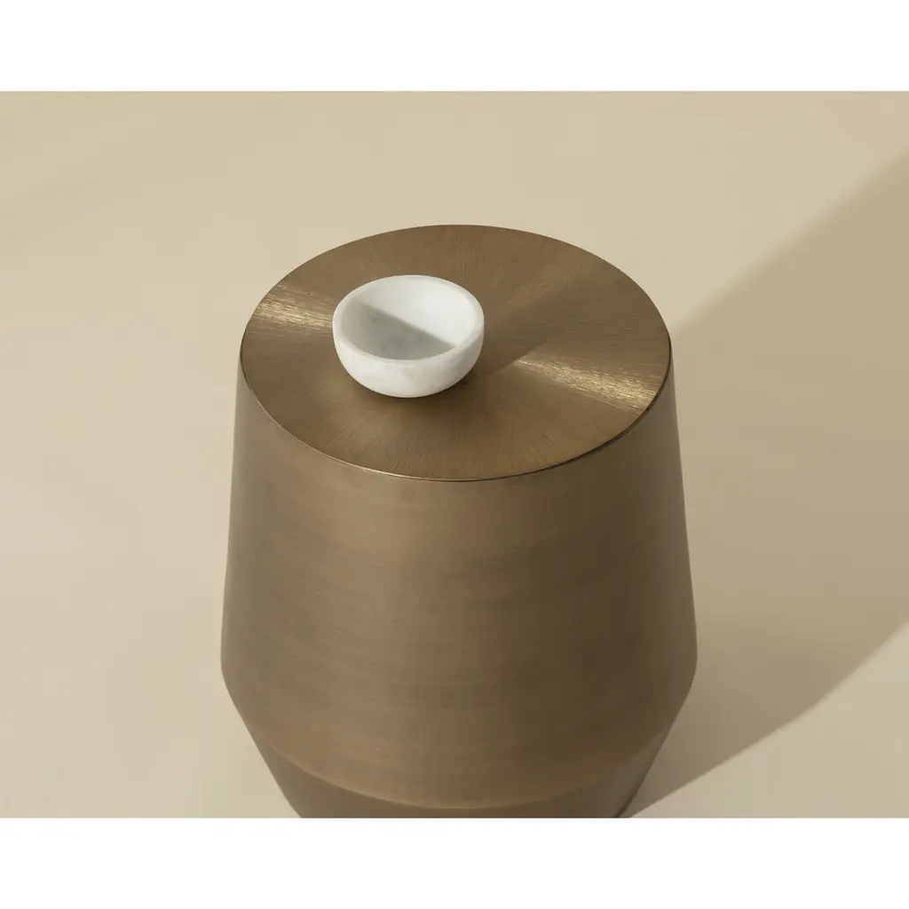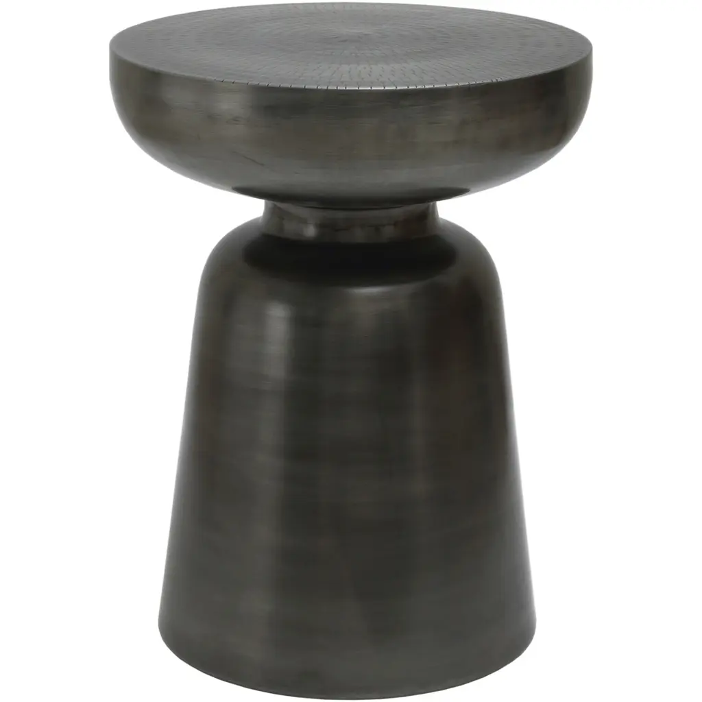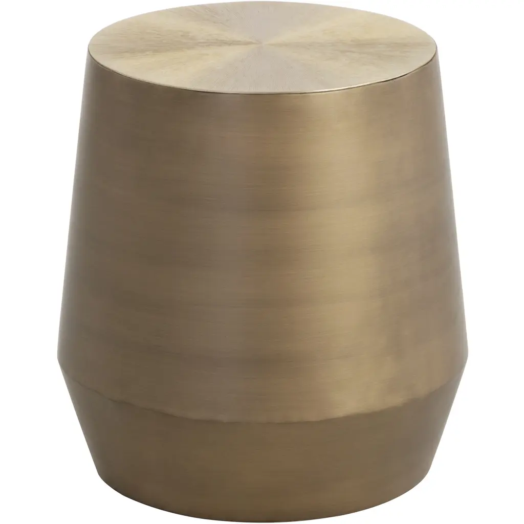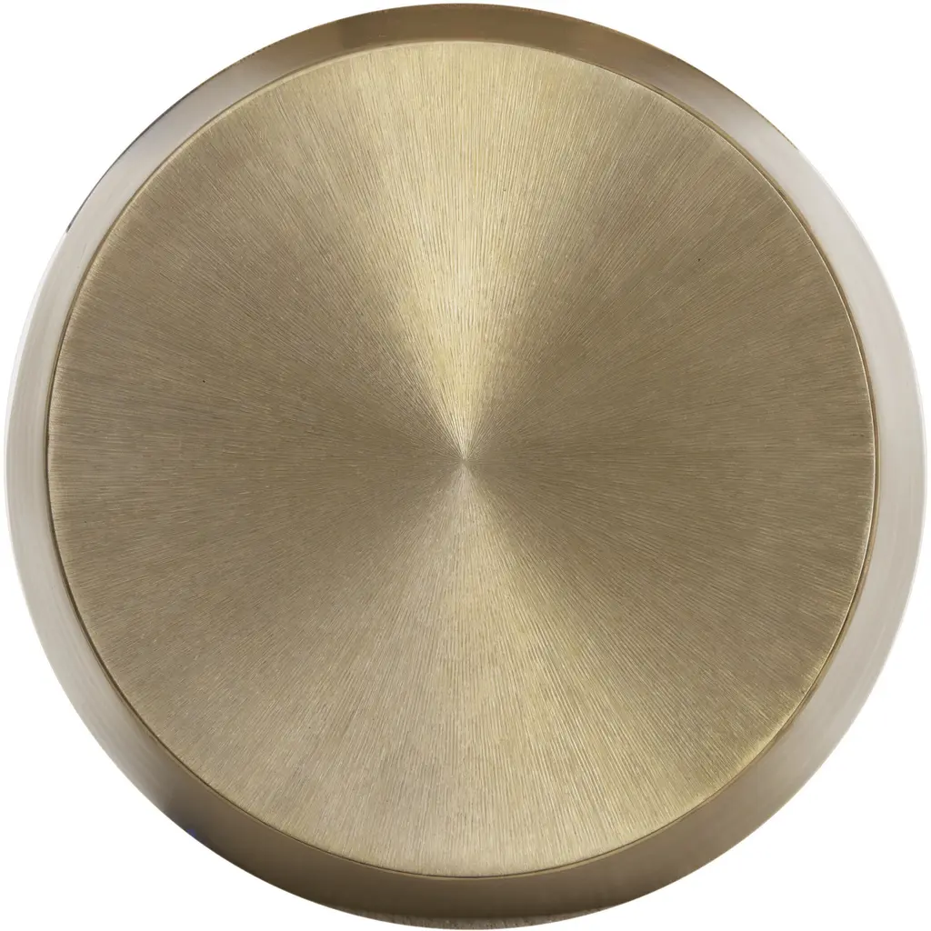 A captivating side table with an alluring antique gold finish. Features a hand-etched and hand-hammered top with a drum style base. This piece will add a contemporary flair to living, lounge and office spaces. Coordinating coffee table in small and large sizes also available. Made in India. With refined craftsmanship, this design was brought to life by skilled local artisans. Due to the nature of handcraftsmanship, unique imperfections such as fissures, markings and variations in colour and shape are welcomed and appreciated characteristics for a truly one-of-a-kind piece.