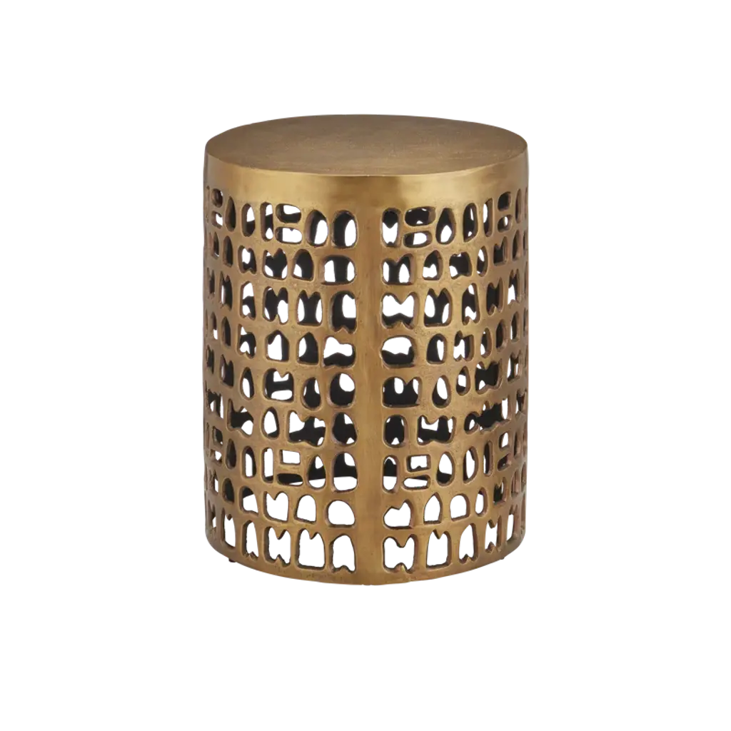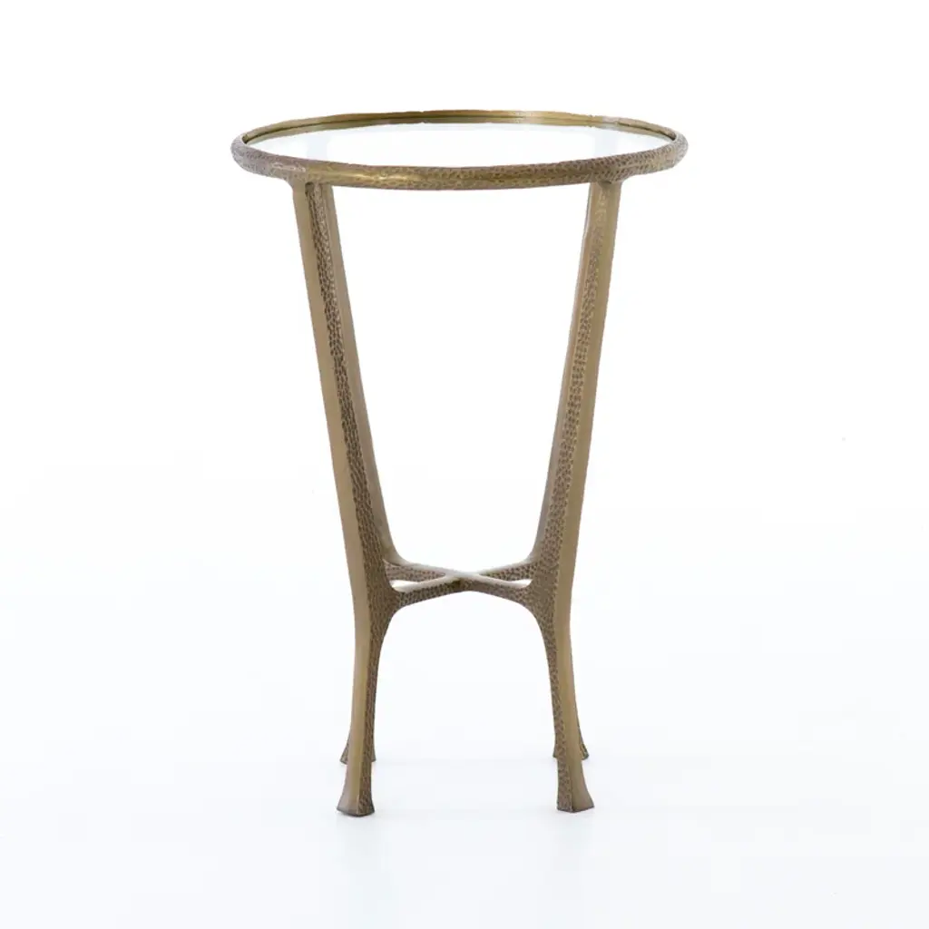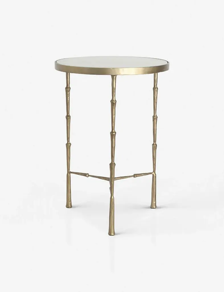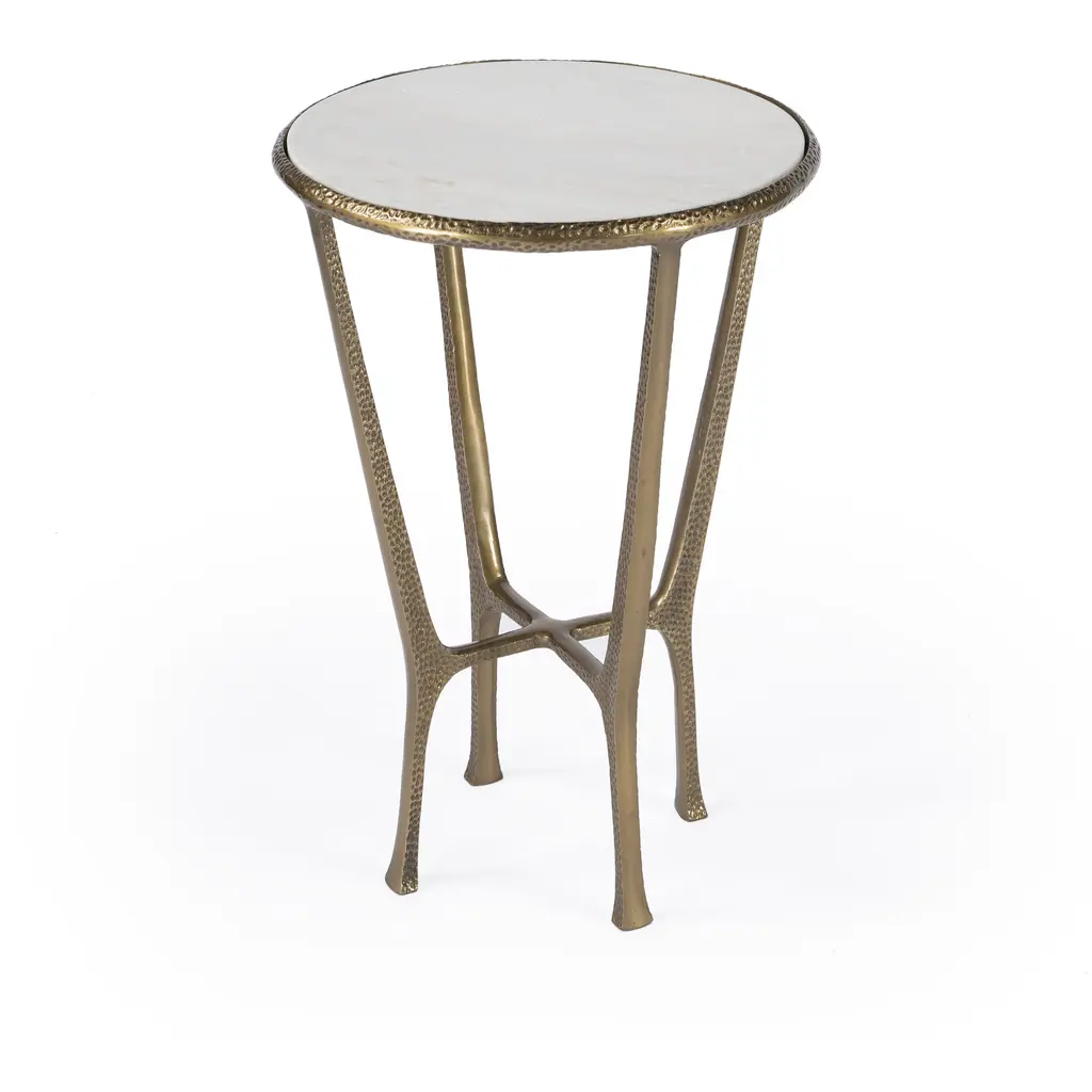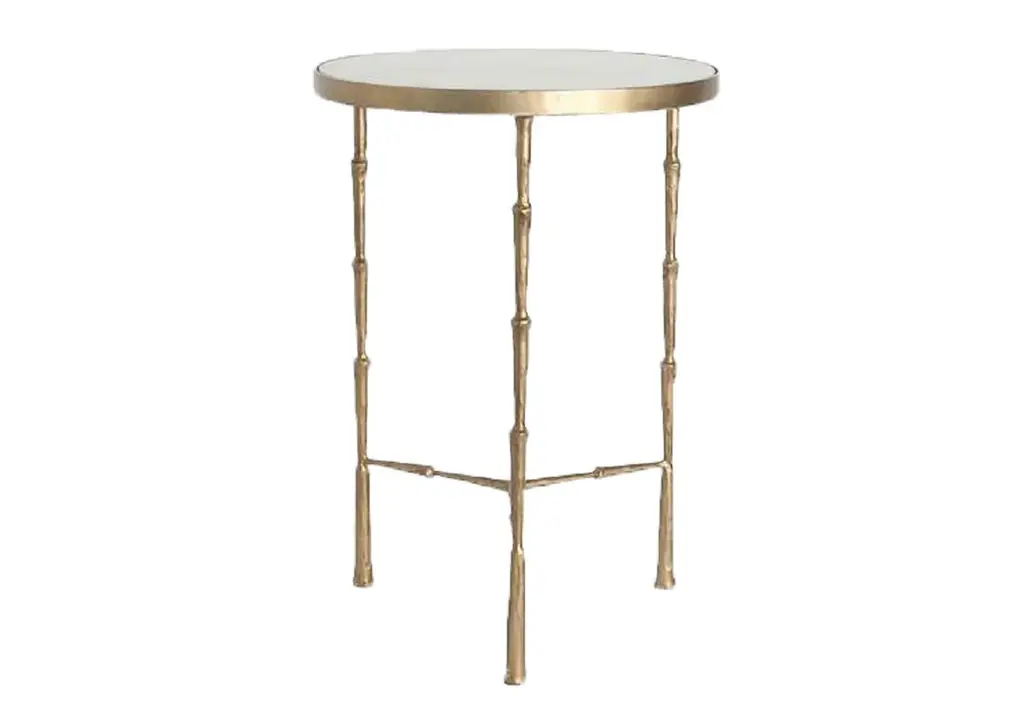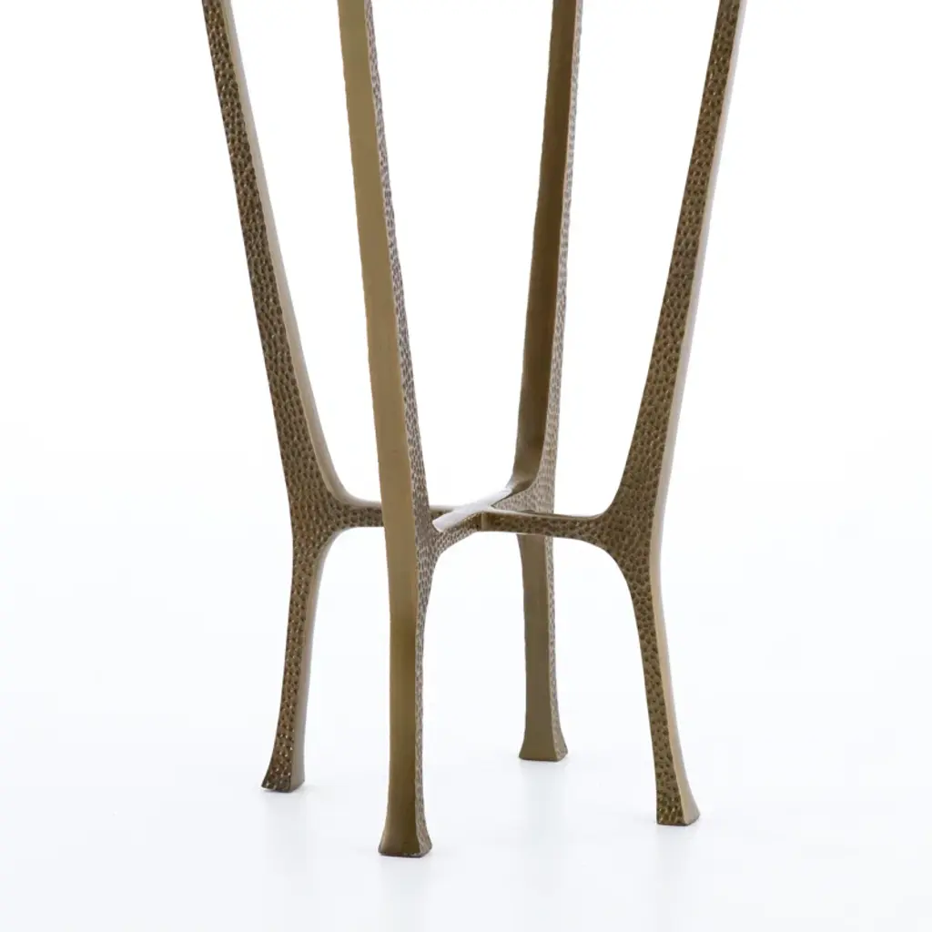 This sleek black granite stone top with a bronze finished aluminum legs and stretcher accents make this end table a show stopper. This lovely table is perfect for anchoring a bold lamp and stack of glossy magazines in your living room.