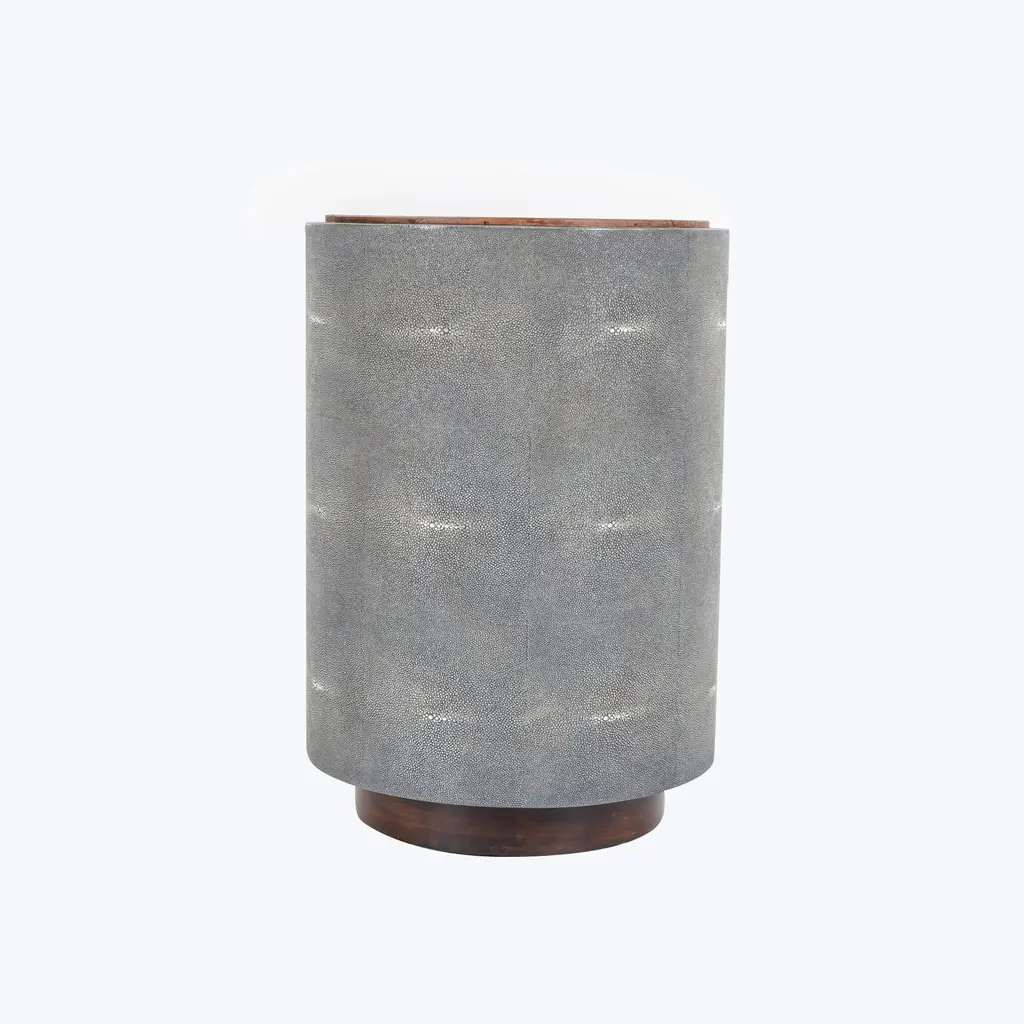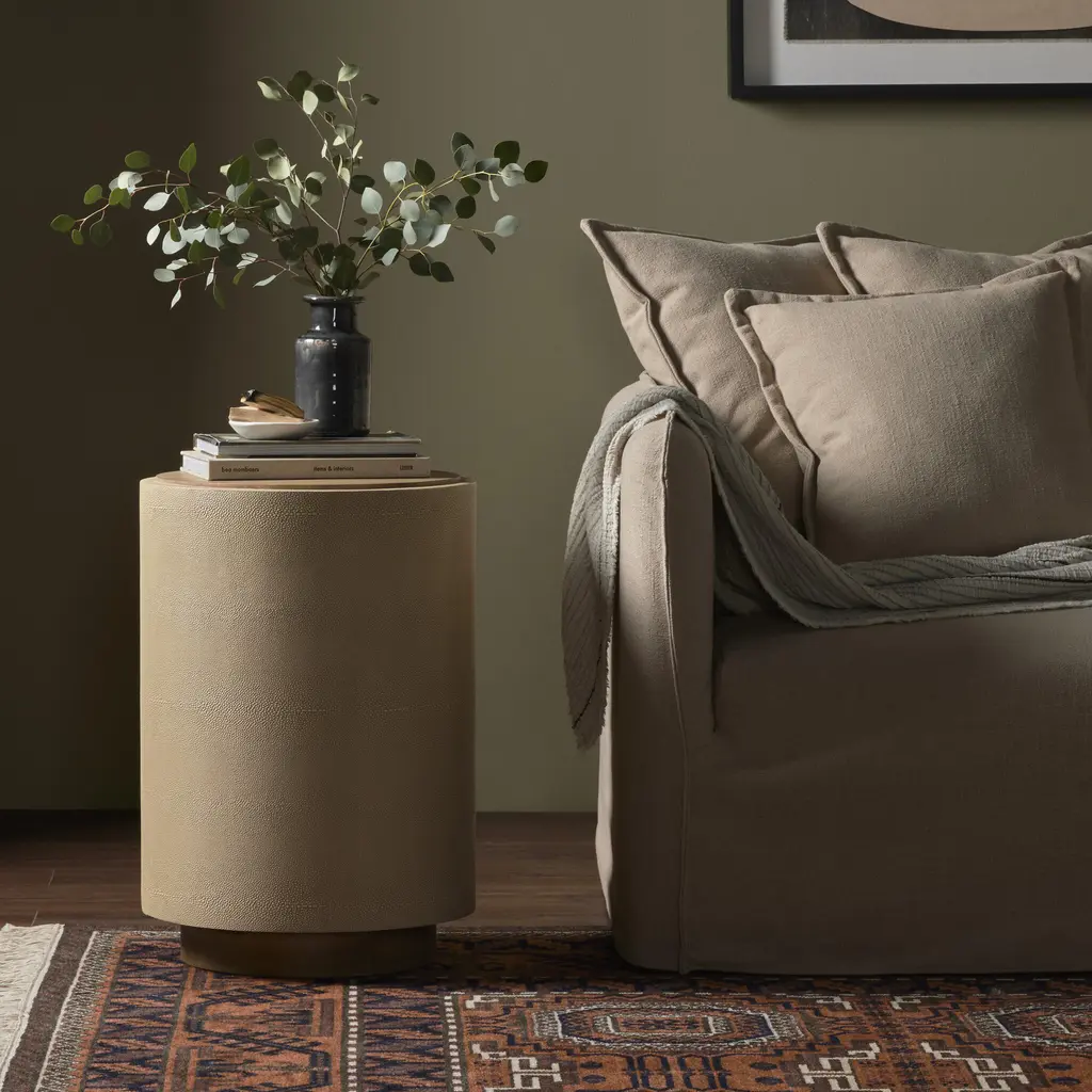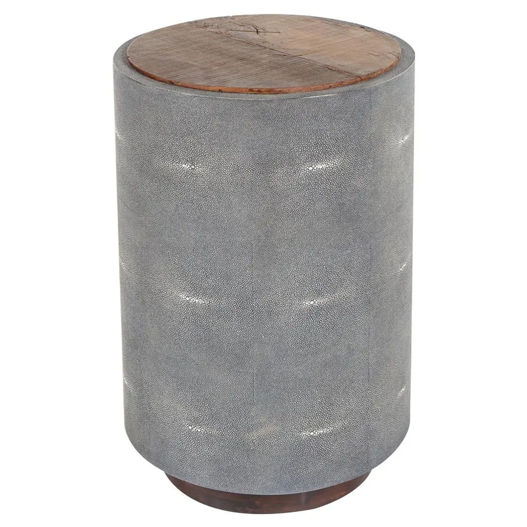 The Four Hands Crosby Side Table adds an element of modern sophistication with its refined blend of materials. A sturdy frame made from resawn reclaimed peroba and solid acacia wood supports a striking faux shagreen base in a soft cream or charcoal hue. This old-world craftsmanship adds a luxurious feel to the side table, making it a dramatic focal point in your living room or bedroom.Measuring 17" W x 17" D x 24.25" H, this side table is perfectly sized for tight spaces while making a dramatic impact. Its rich, organic wood finish contrasts beautifully with the smooth faux shagreen, offering a unique visual and tactile experience. Whether placed beside a sofa or used as a bedside table, the Crosby Side Table is a versatile addition to any room. Crafted with care in Vietnam, this piece combines sustainability with high-end design, bringing both character and style to your home. The combination of reclaimed materials and the elegant charcoal tone ensures this side table stands out as both a functional and artistic statement piece.