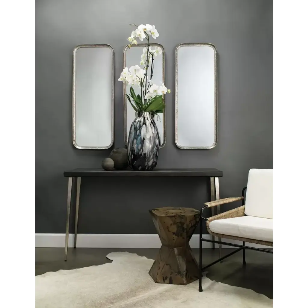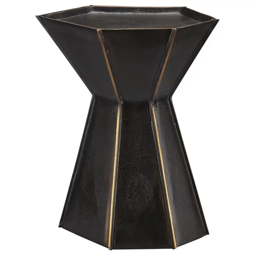 Make a statement in your living space with this stunning side table. Handcrafted of iron sheets, its prismatic shape features flat facets in a lustrous patina that feels cosmic, yet rustic in nature. Position one by your sofa or group in multiples at the center of a larger seating area.
