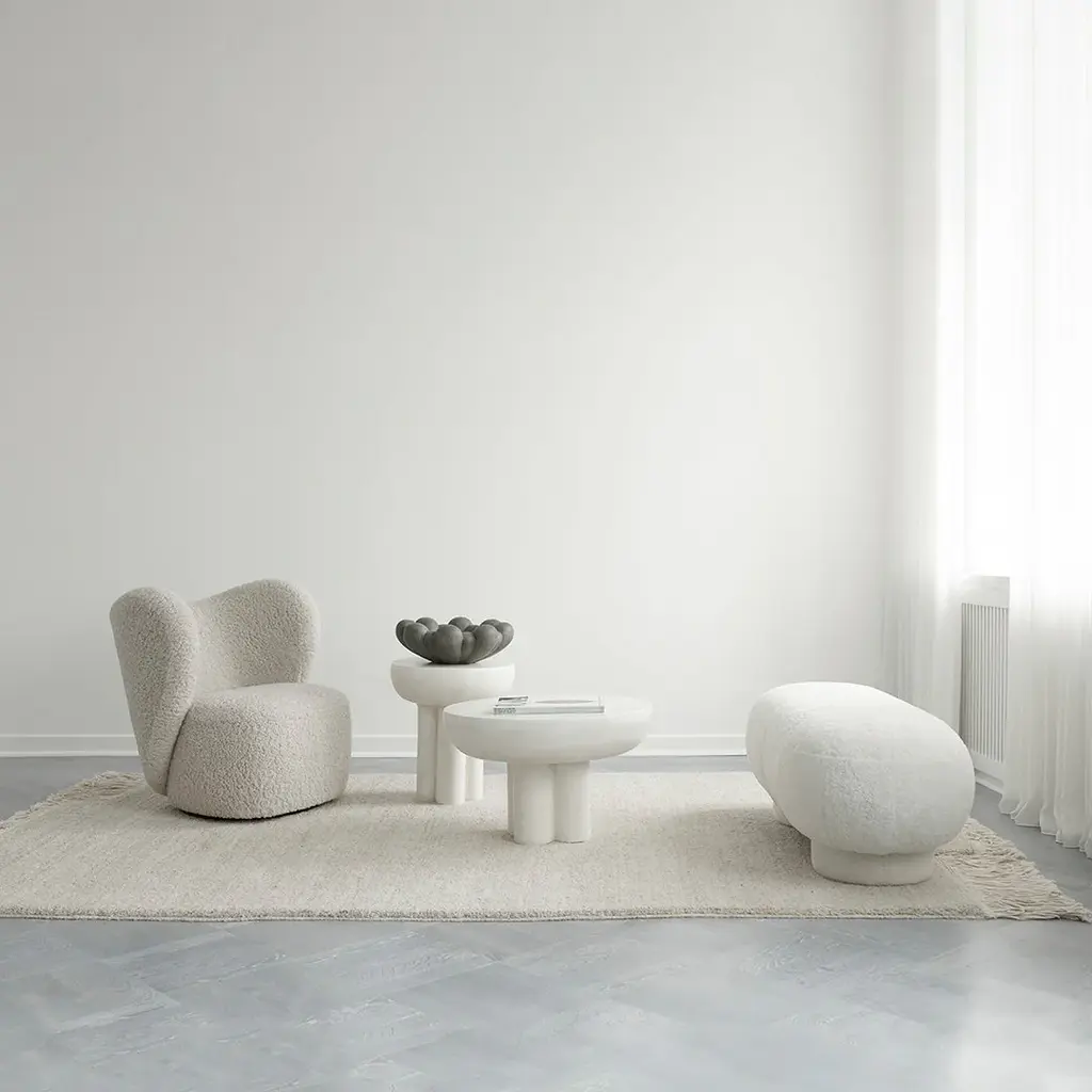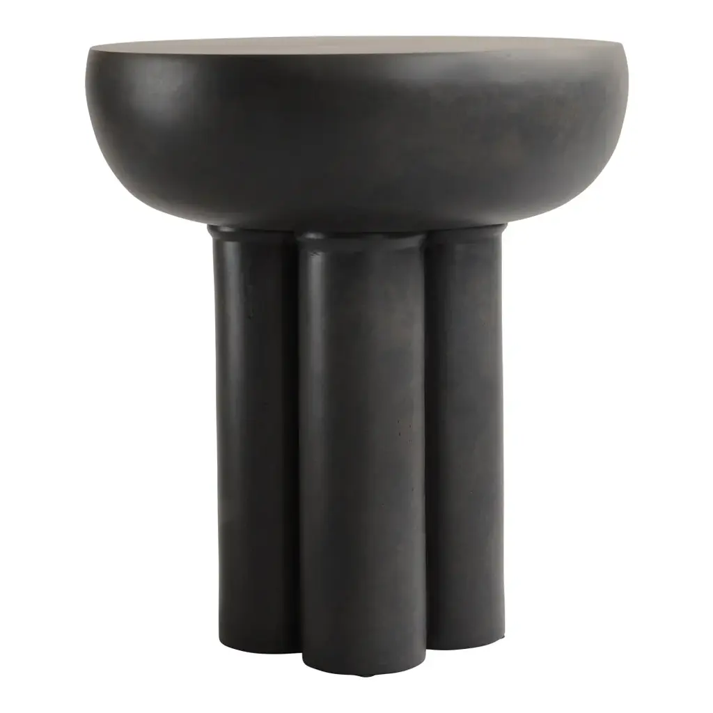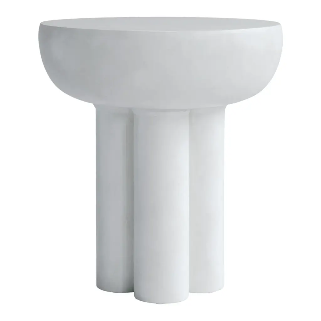 The collection of tables entitled Crown are cast in one piece formed as a circular table top carried by four cylinder shaped legs. Standing strong and proud, the table is inspired by the bare, structural elements of Brutalist architecture, celebrating the columns, and eluding an attitude towards too many details. The chunky fiber concrete legs enable a large gap between the table edge and legs to emphasize the experience of a massive floating table top. The table is available in two sizes and can be used as a single standing side table or stand together as a pair of coffee tables. Designed by Kristian Sofus Hansen; Tommy Hyldahl.