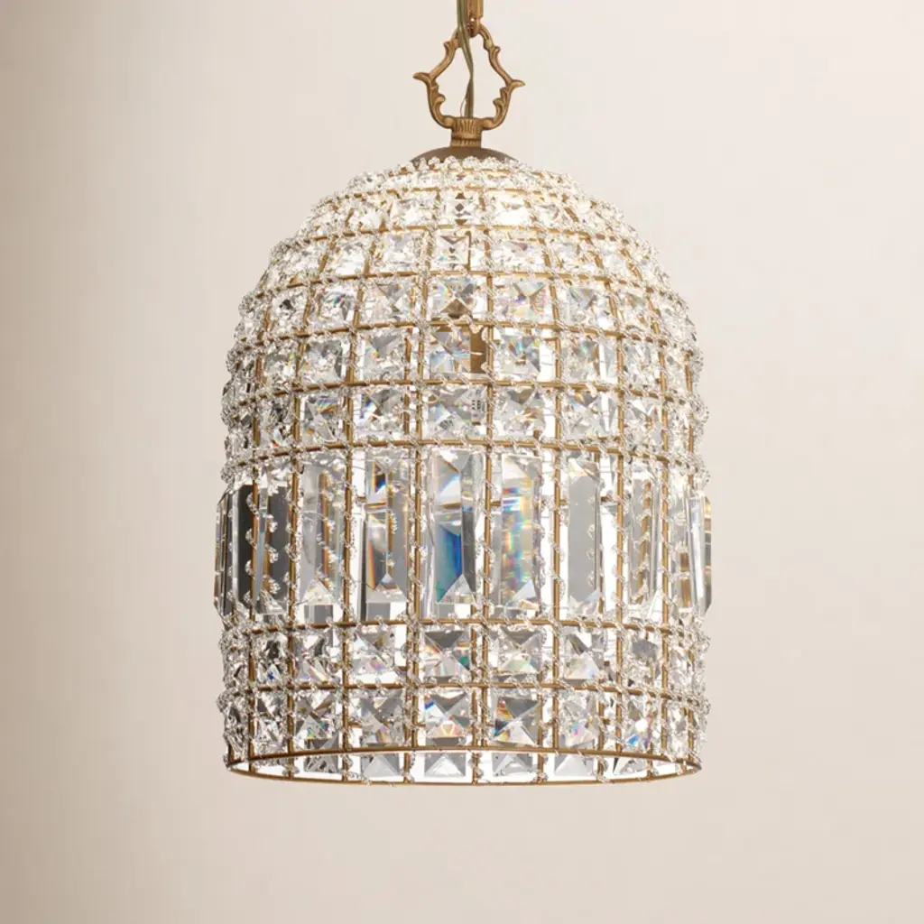 Inspired by the ornate mirrors in the halls of Versailles, this eye-catching crystal birdcage pendant instantly elevates the glamor of any room. Flaunting crystals in various sizes, this pendant is suspended from an adjustable metal chain. Consider hanging it above a vanity, side table, dresser, or entryway.