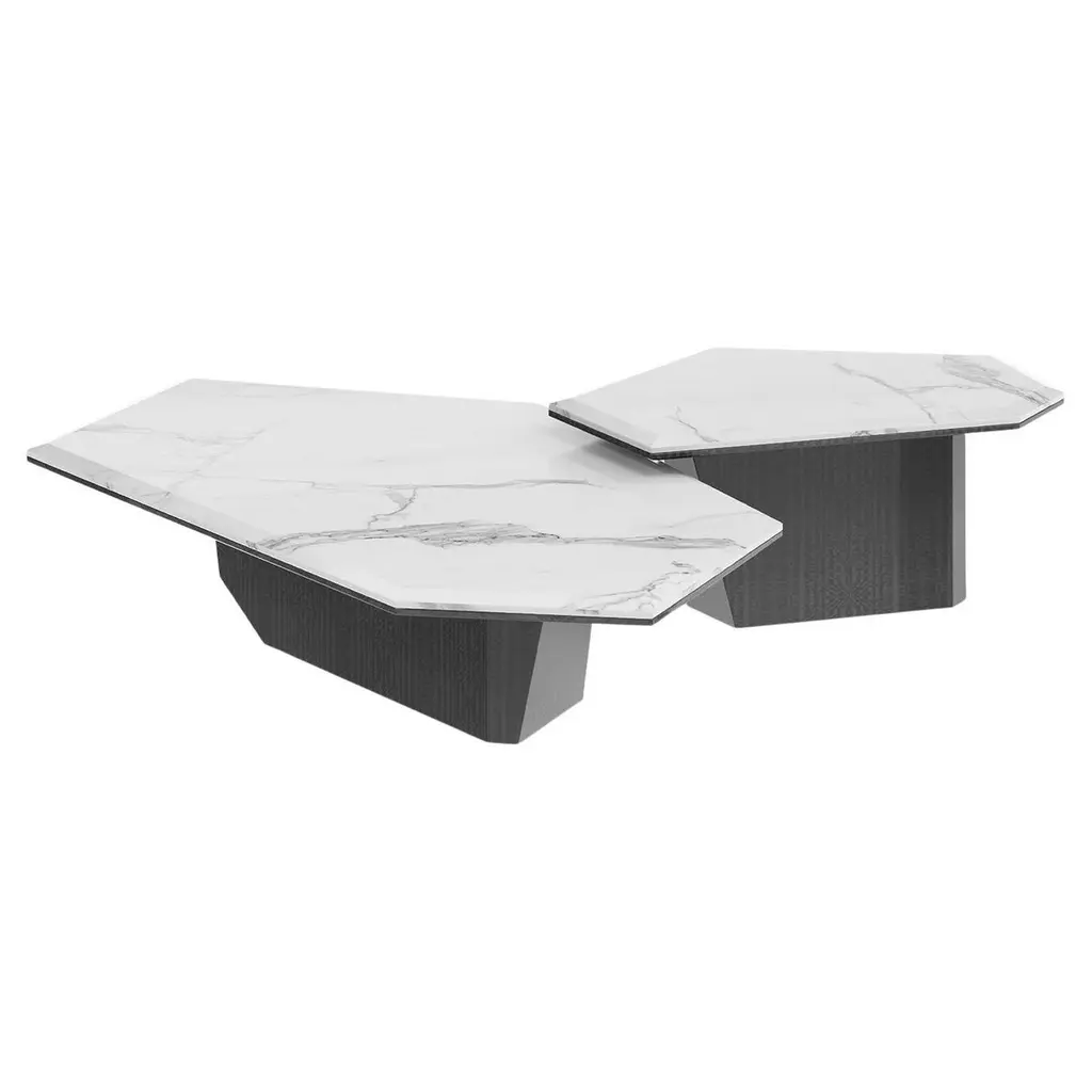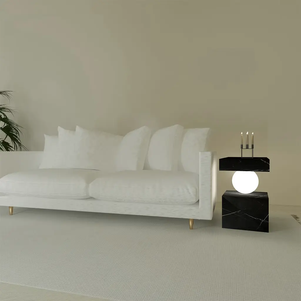 This sculptural side table offers an intriguing sight of two marble slabs delicately poised atop a luminous sphere, evoking a mesmerizing interplay of light and tension that appears to transcend the confines of physical laws.