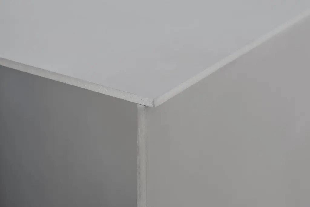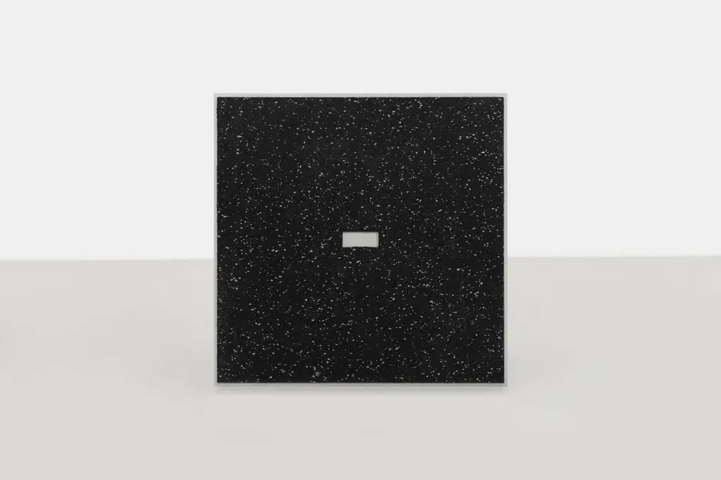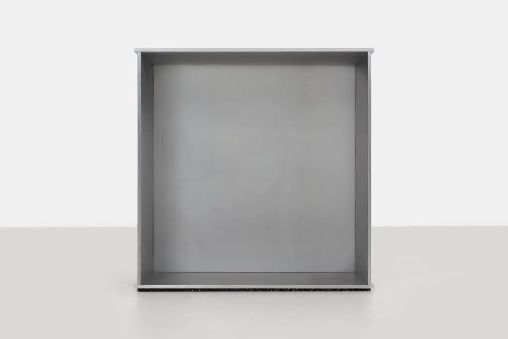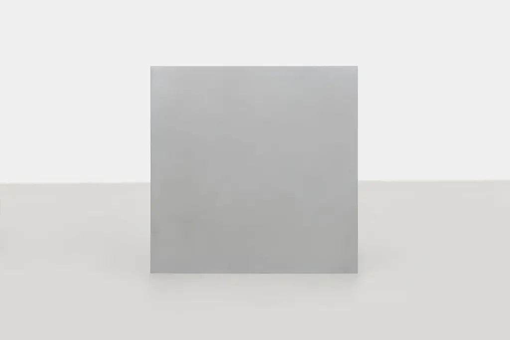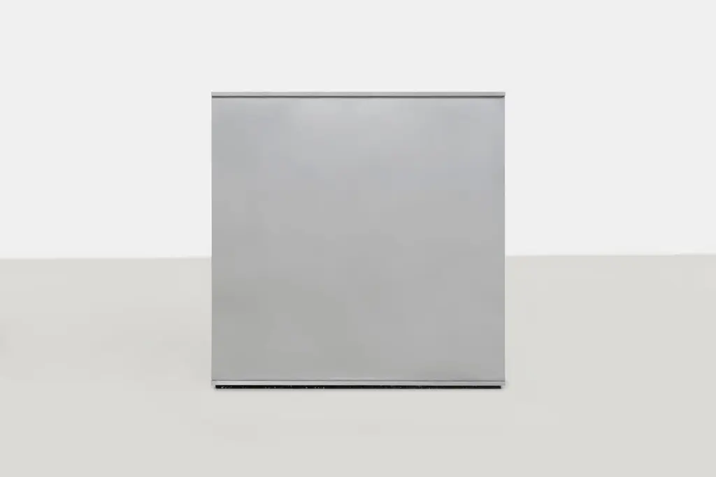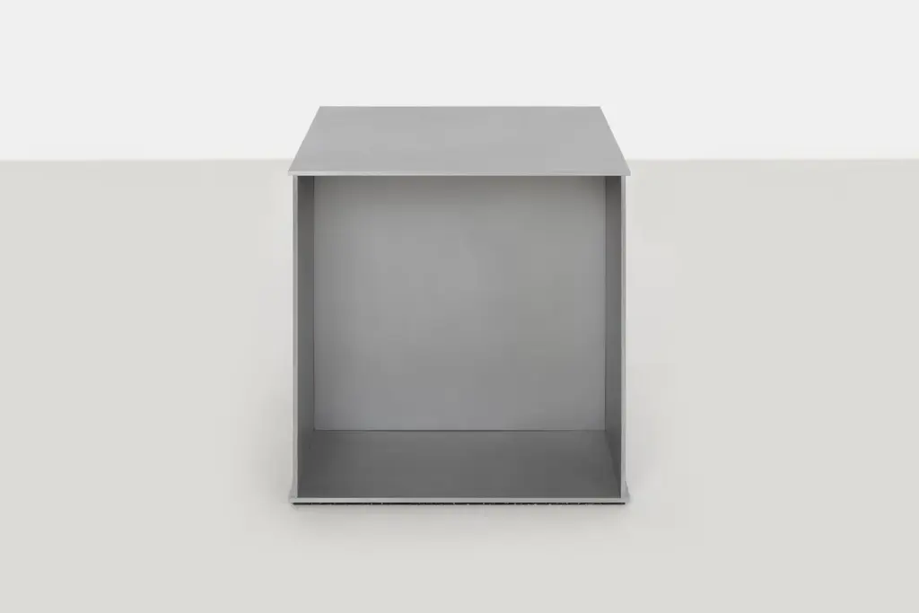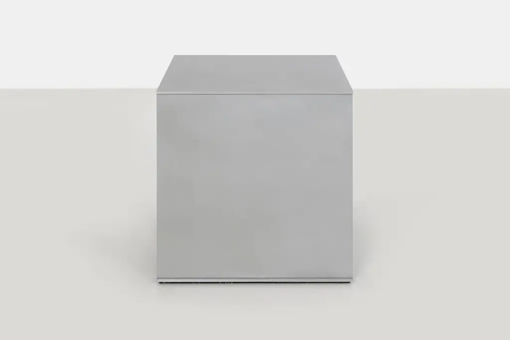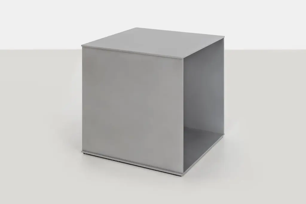 Minimalist side table in .25" thick in aluminum plate. The underside has a recessed, cut rubber sheet with an inset signed label. A simple 18-inch cube evenly divided by a vertical plane. Custom variations are available on request.